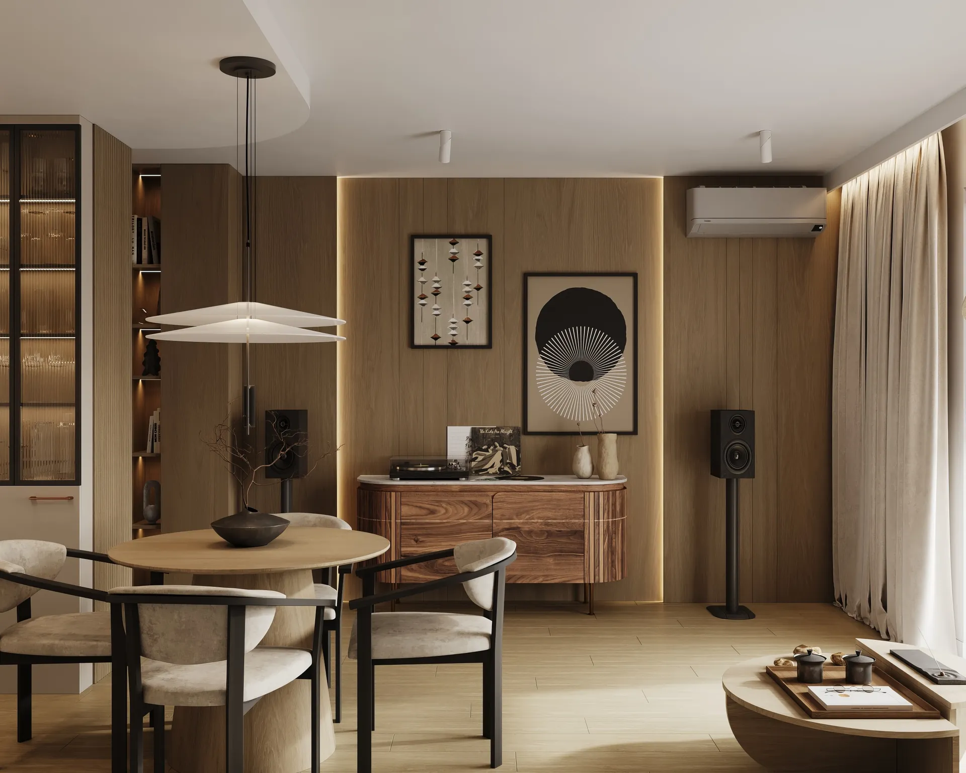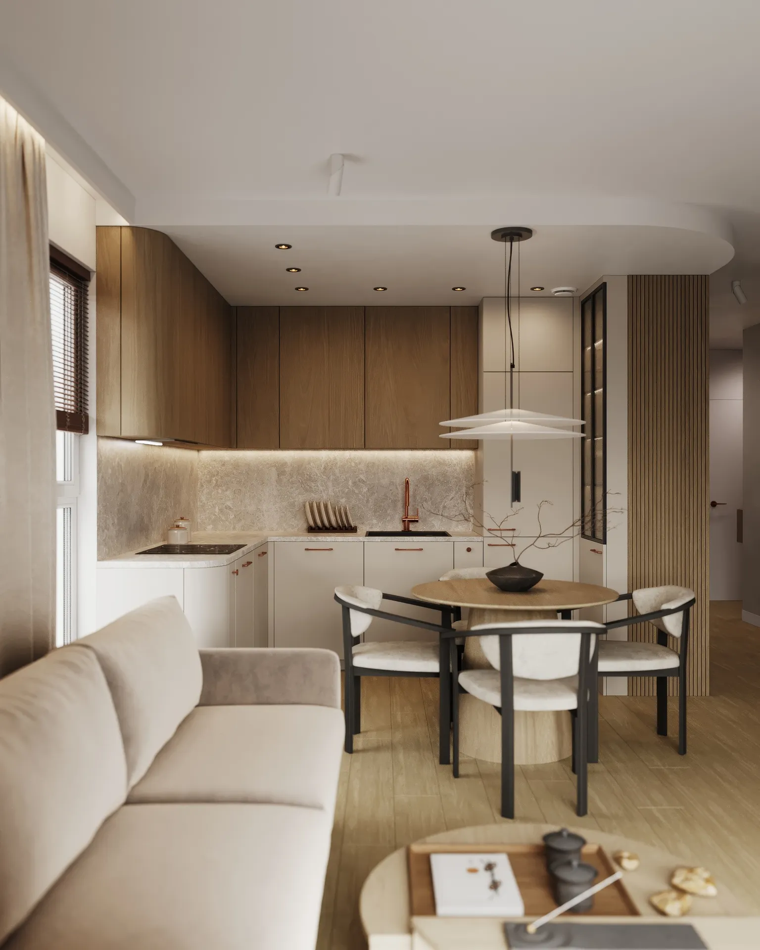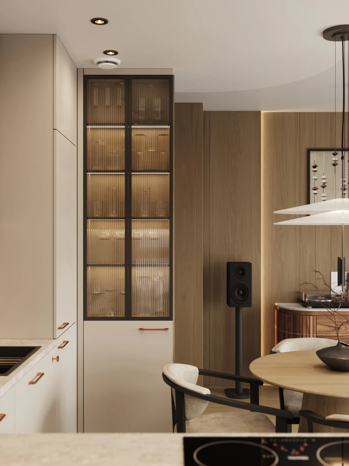 Salon został otwarty na kuchnię i jadalnię, tworząc przestrzeń dzienną sprzyjającą wspólnemu spędzaniu czasu. Duży stół dla czterech osób umożliwia komfortowe posiłki, a wygodna strefa wypoczynkowa z wysokiej klasy sprzętem audio zapewnia idealne warunki do relaksu i spotkań. Kuchnia została zaprojektowana z dbałością o detale – elegancka, funkcjonalna i harmonijnie wpisana w całość wnętrza.