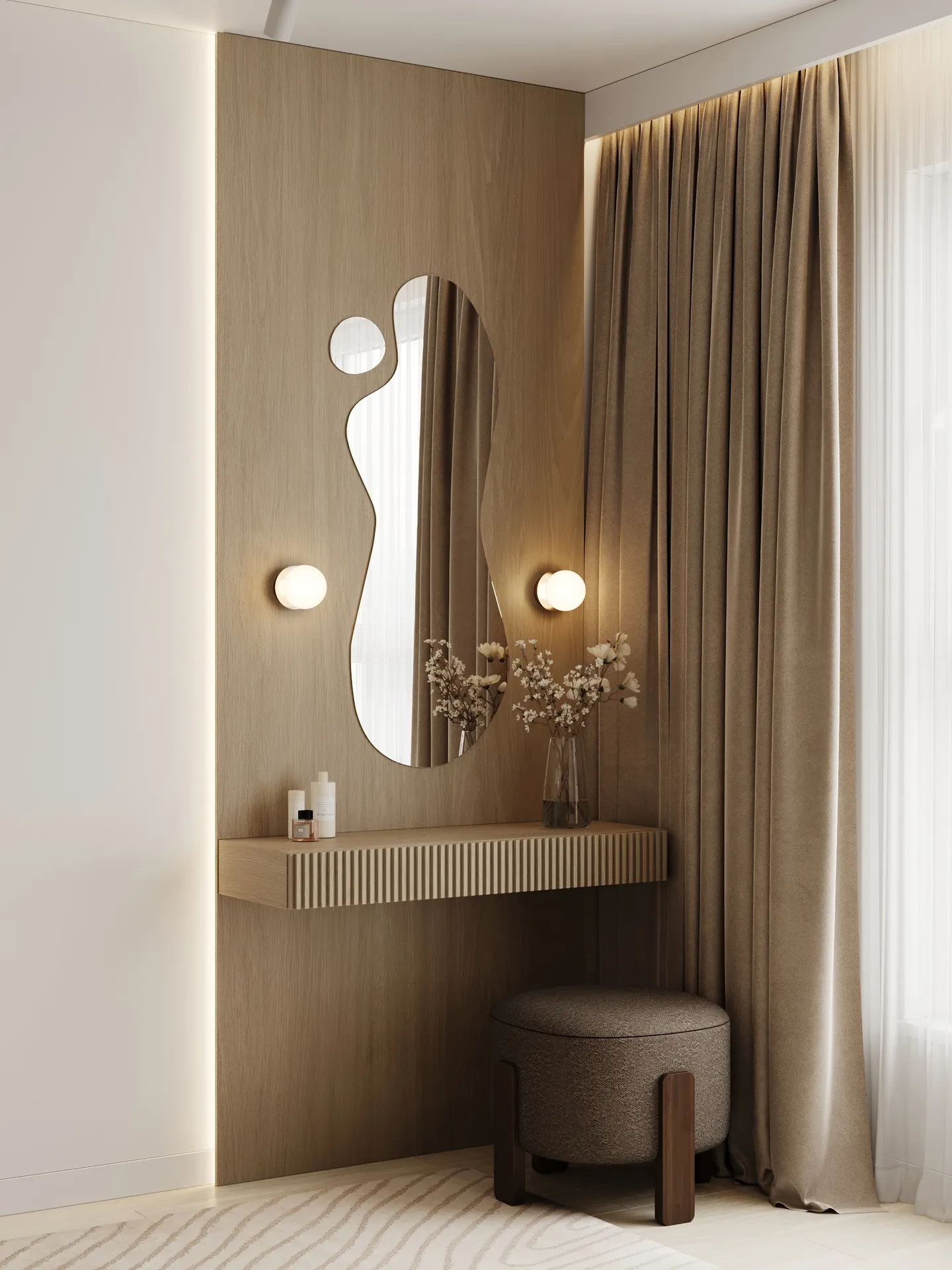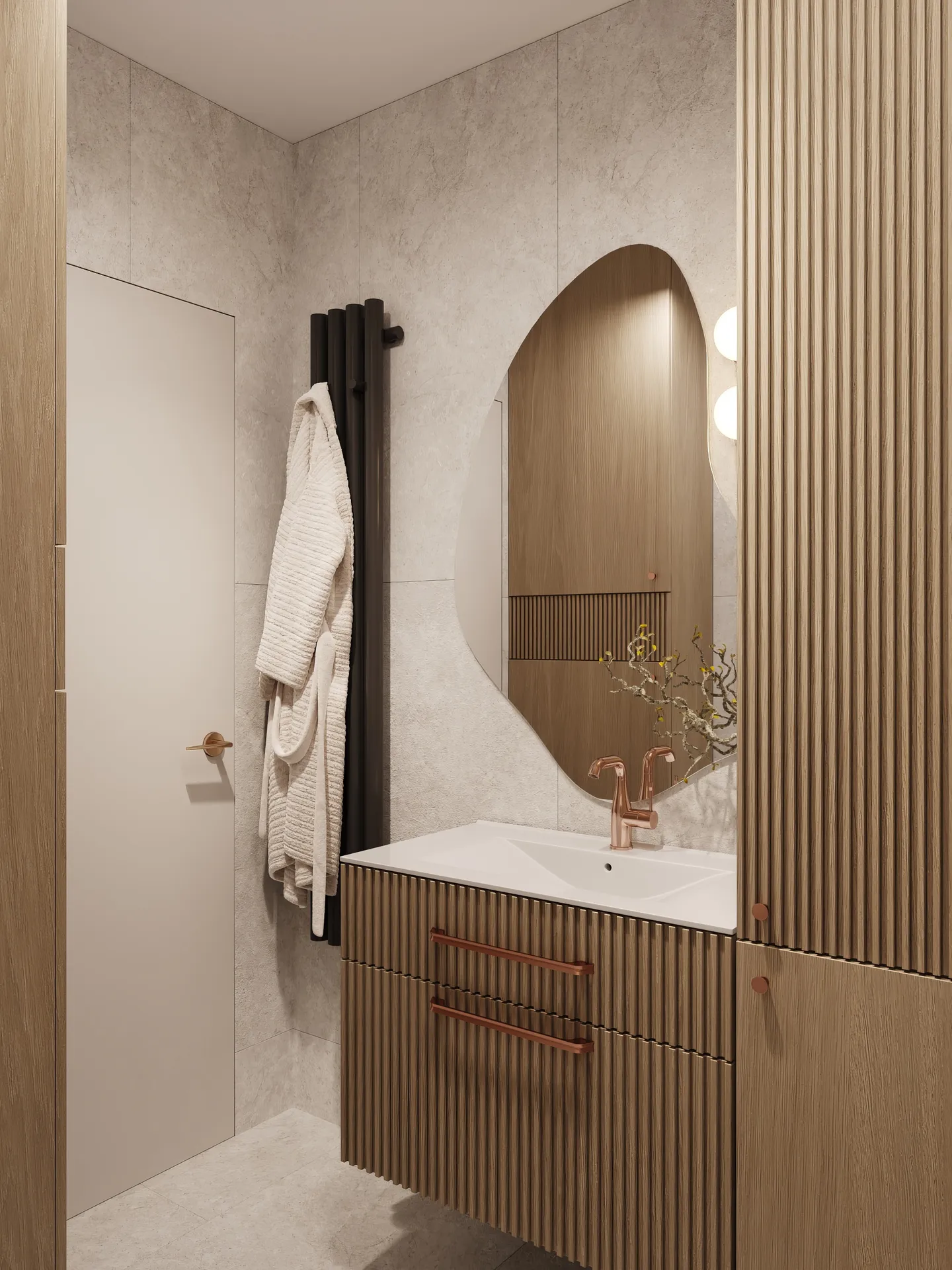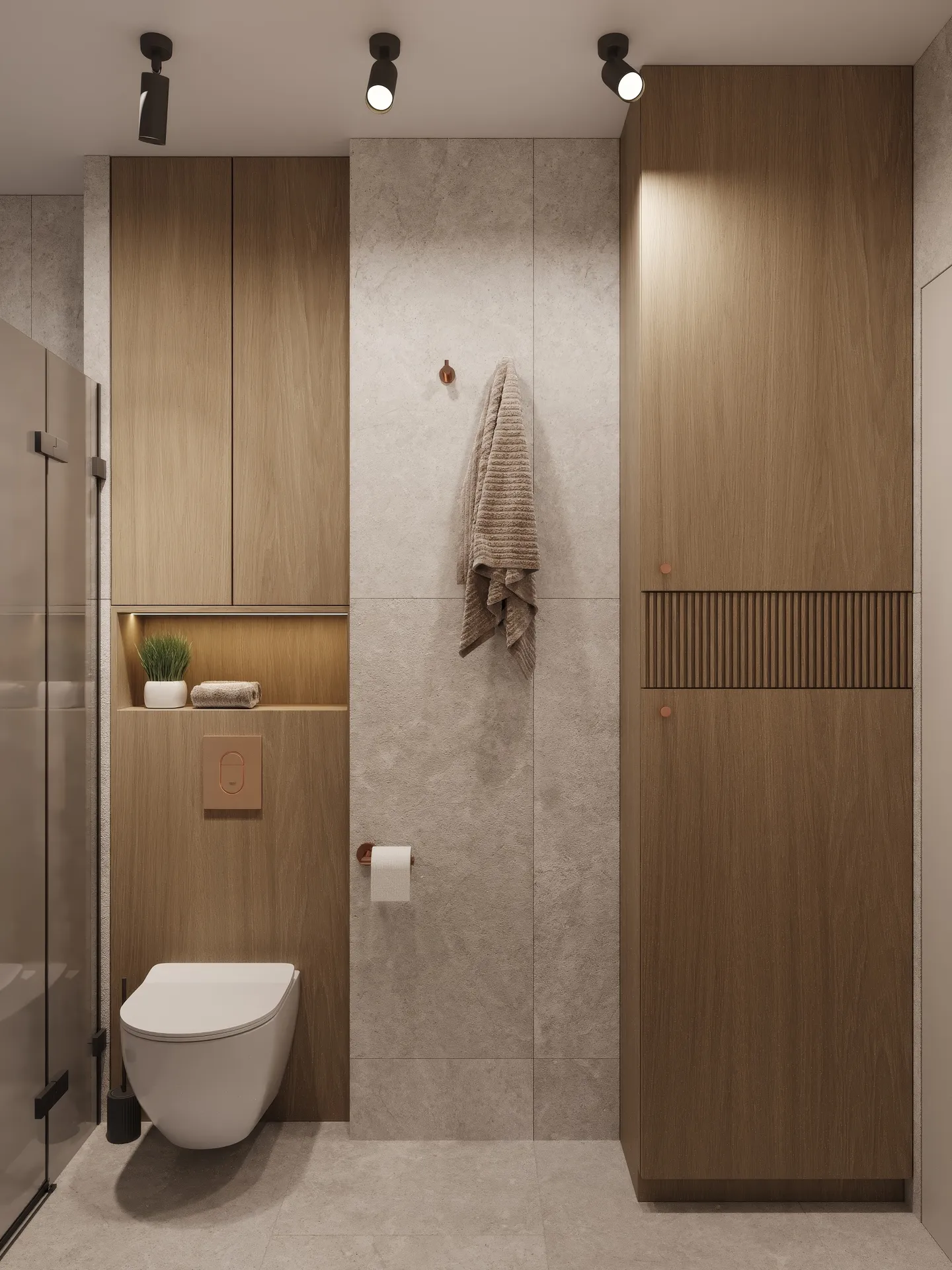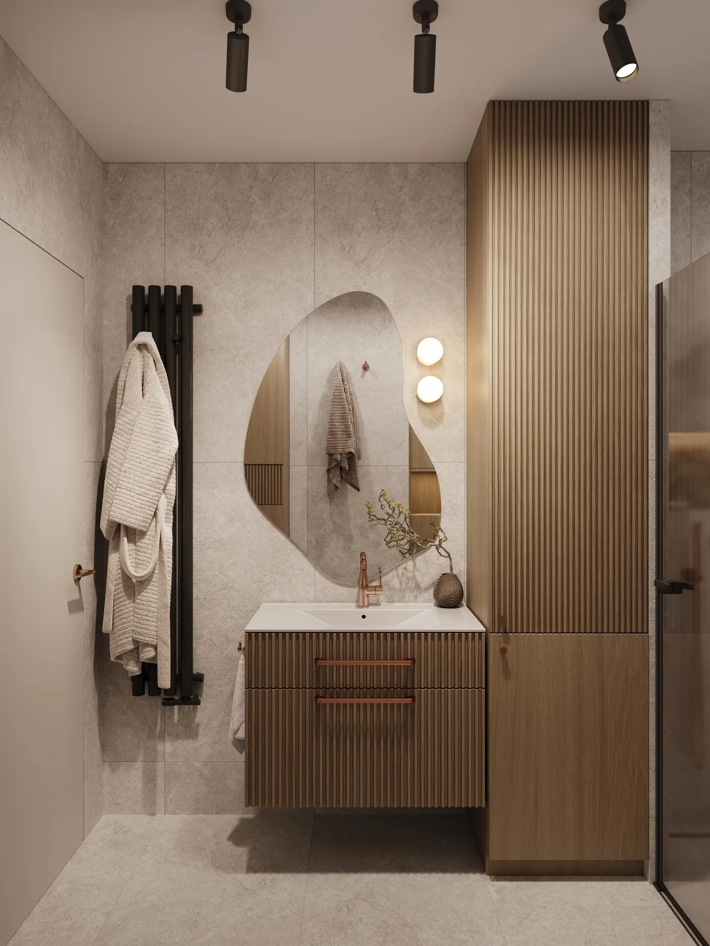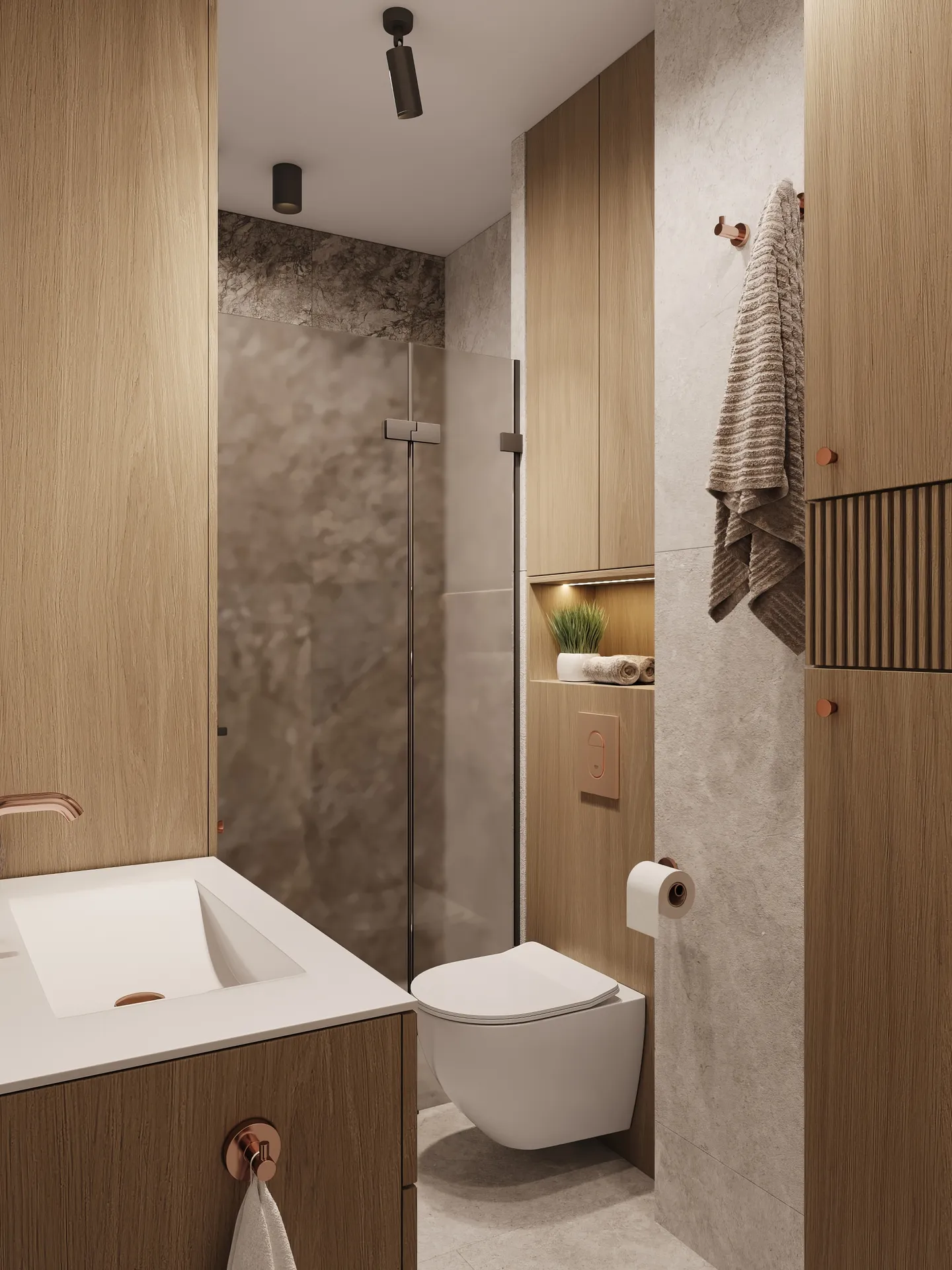 3-pokojowe mieszkanie pod Warszawą to projekt wnętrza, w którym elegancja spotyka się z ciepłem naturalnych materiałów. Właściciele zdecydowali się na dominację drewna, które konsekwentnie jest użyte we wszystkich pomieszczeniach – od salonu, przez sypialnię, aż po łazienkę. Efekt? Spójna, przytulna i wysmakowana przestrzeń, idealna do codziennego życia.