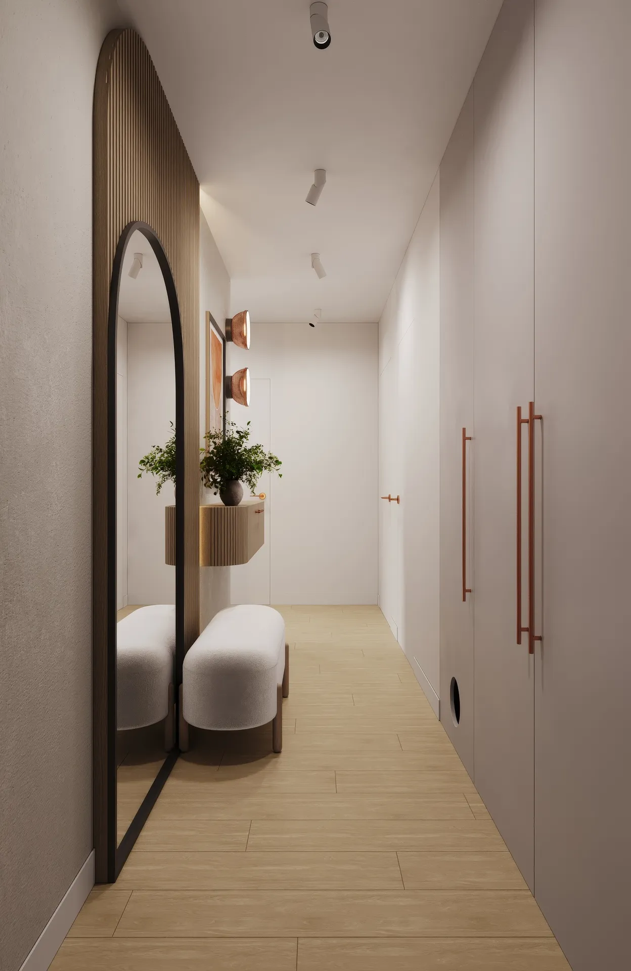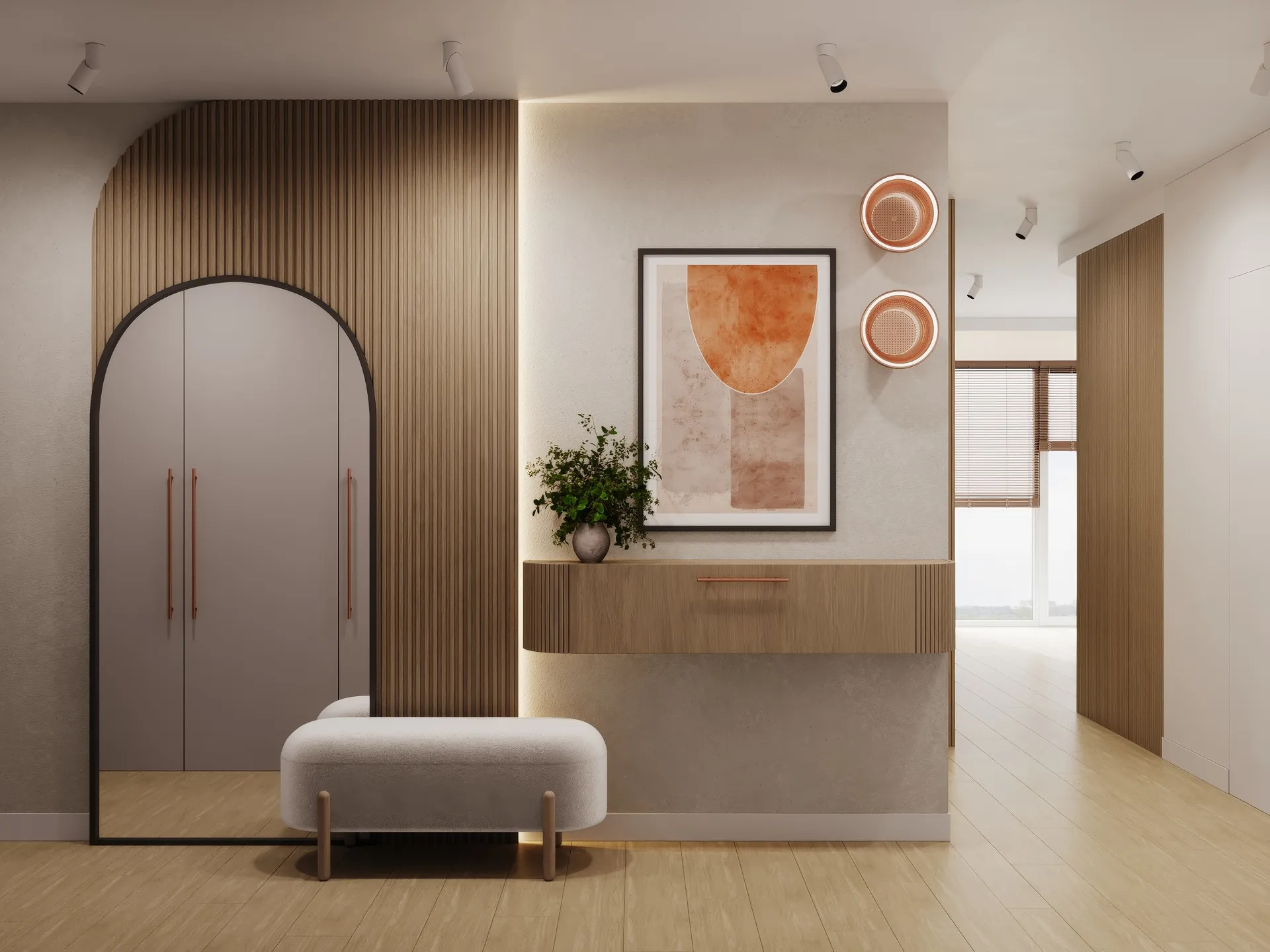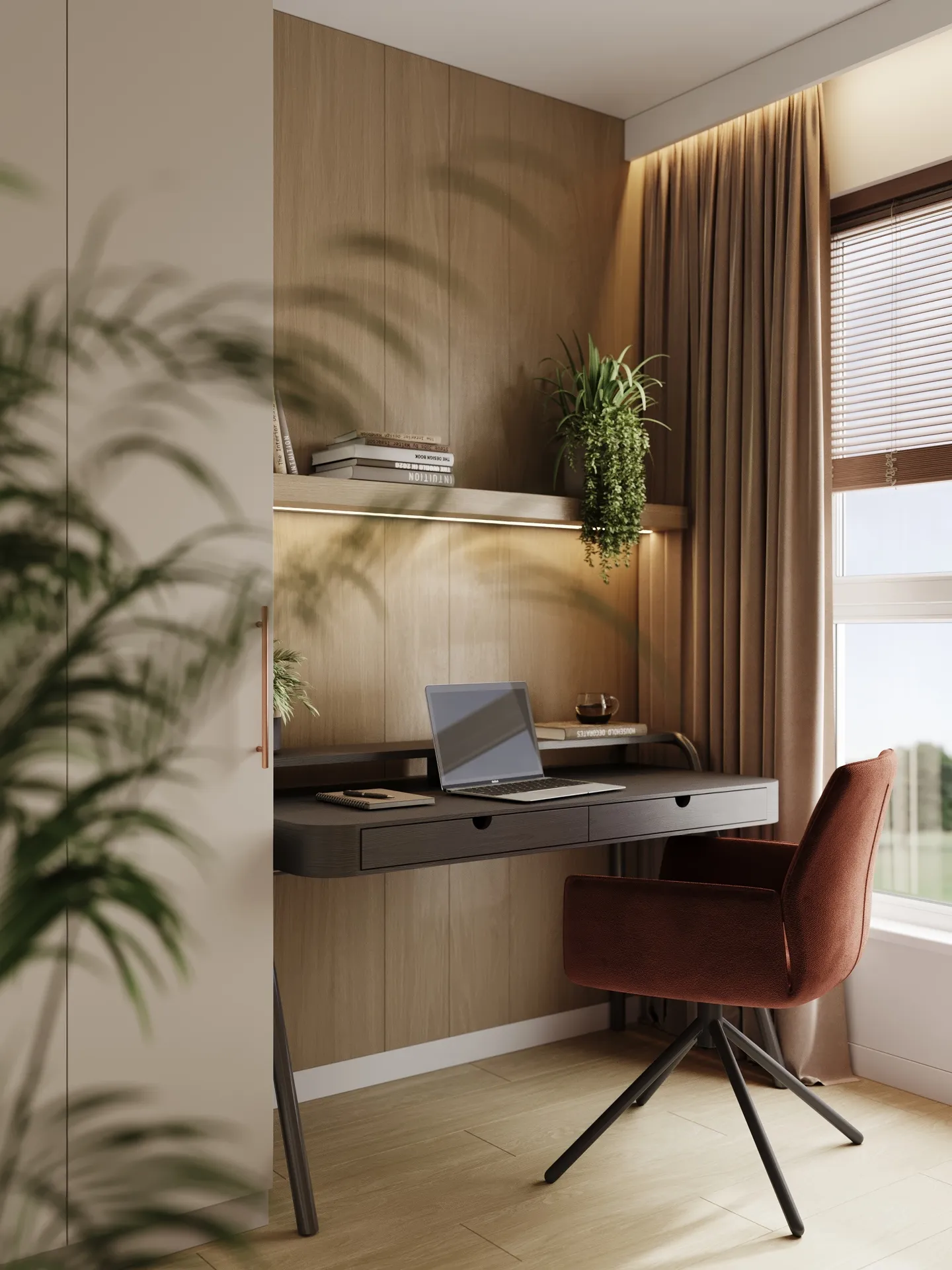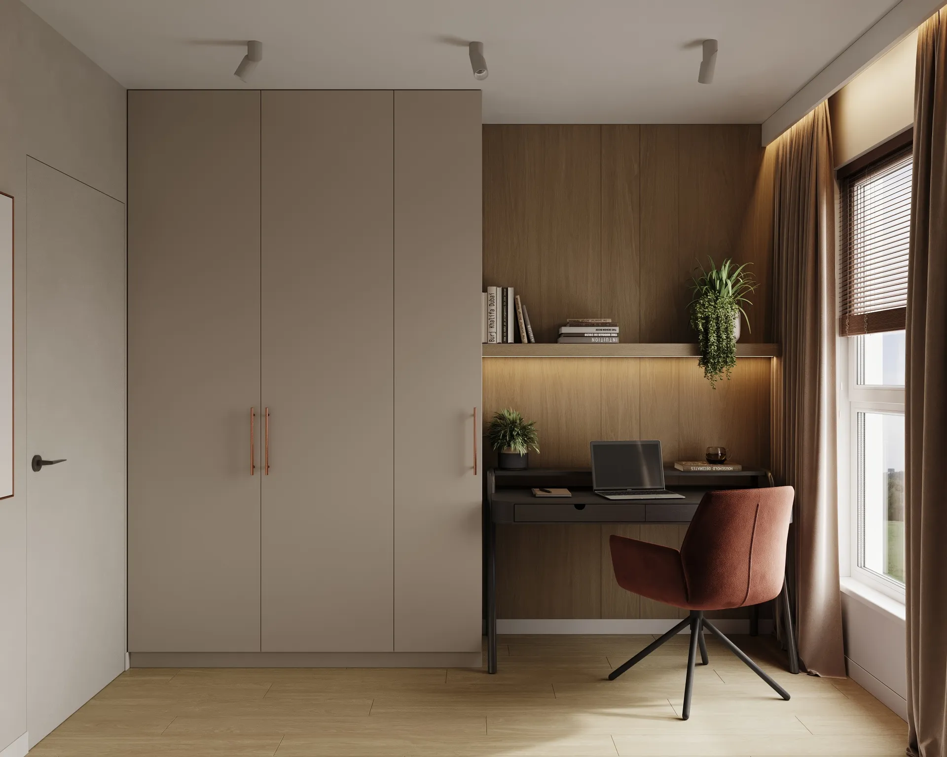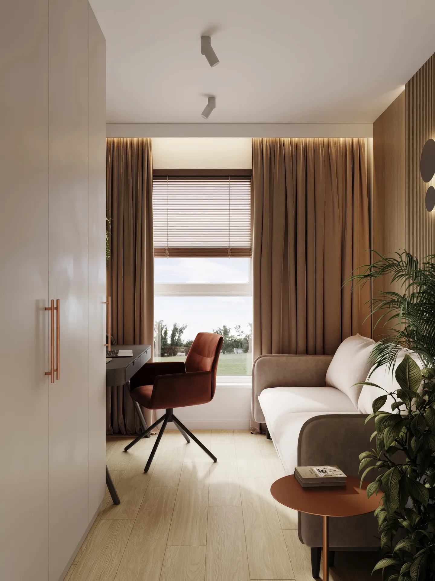 Pokój gościnny pełni również funkcję gabinetu – to elastyczne wnętrze, które łatwo dopasować do zmieniających się potrzeb. Całość uzupełnia elegancki przedpokój, w którym pomarańczowe akcenty perfekcyjnie komponują się z naturalnym drewnem, tworząc efektowne wejście do mieszkania.