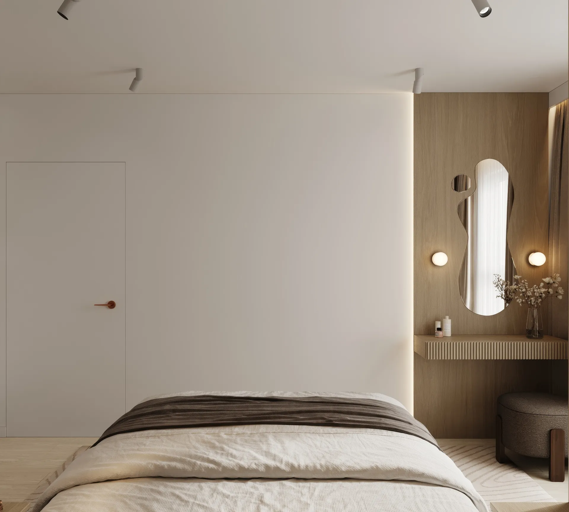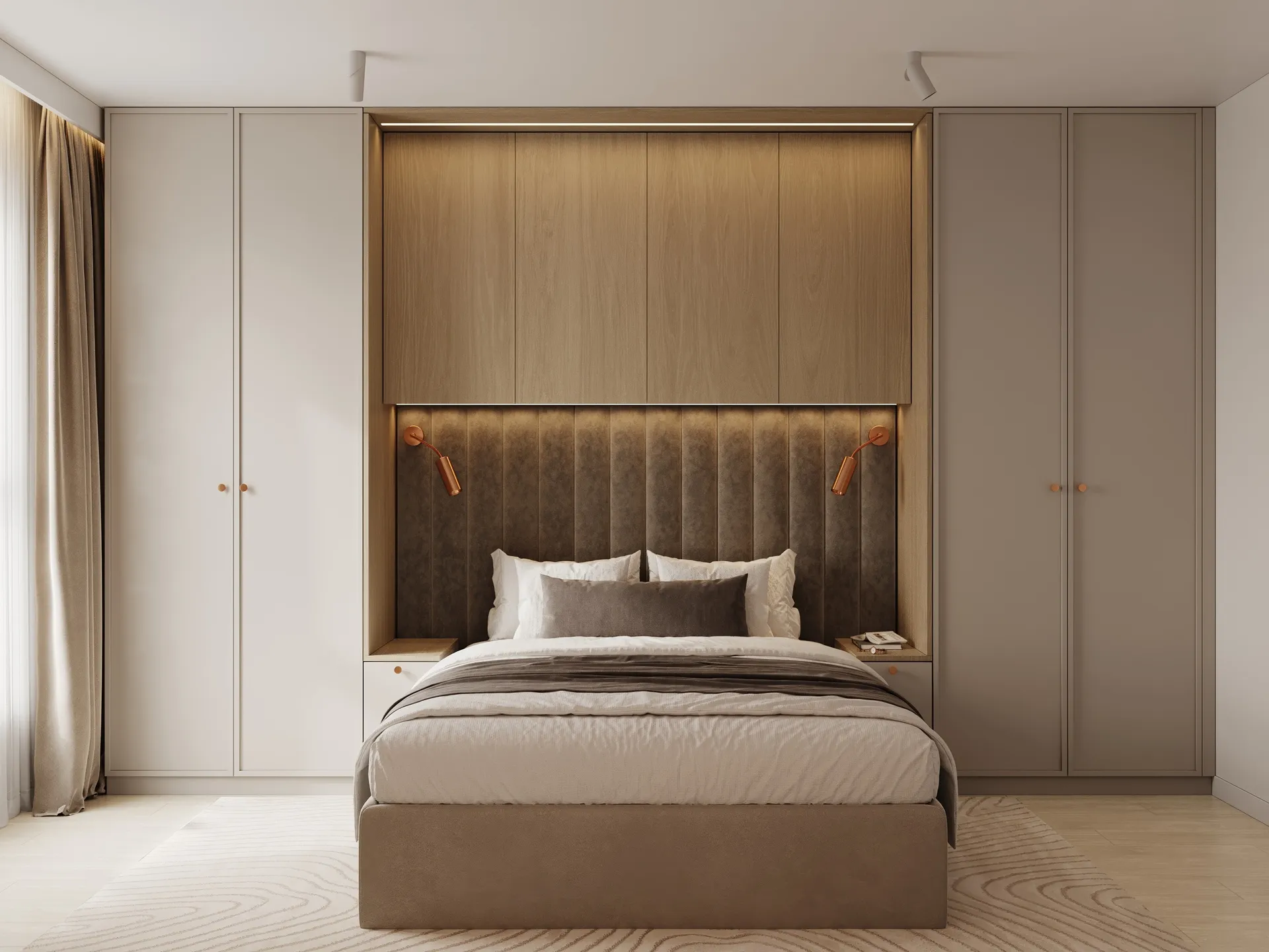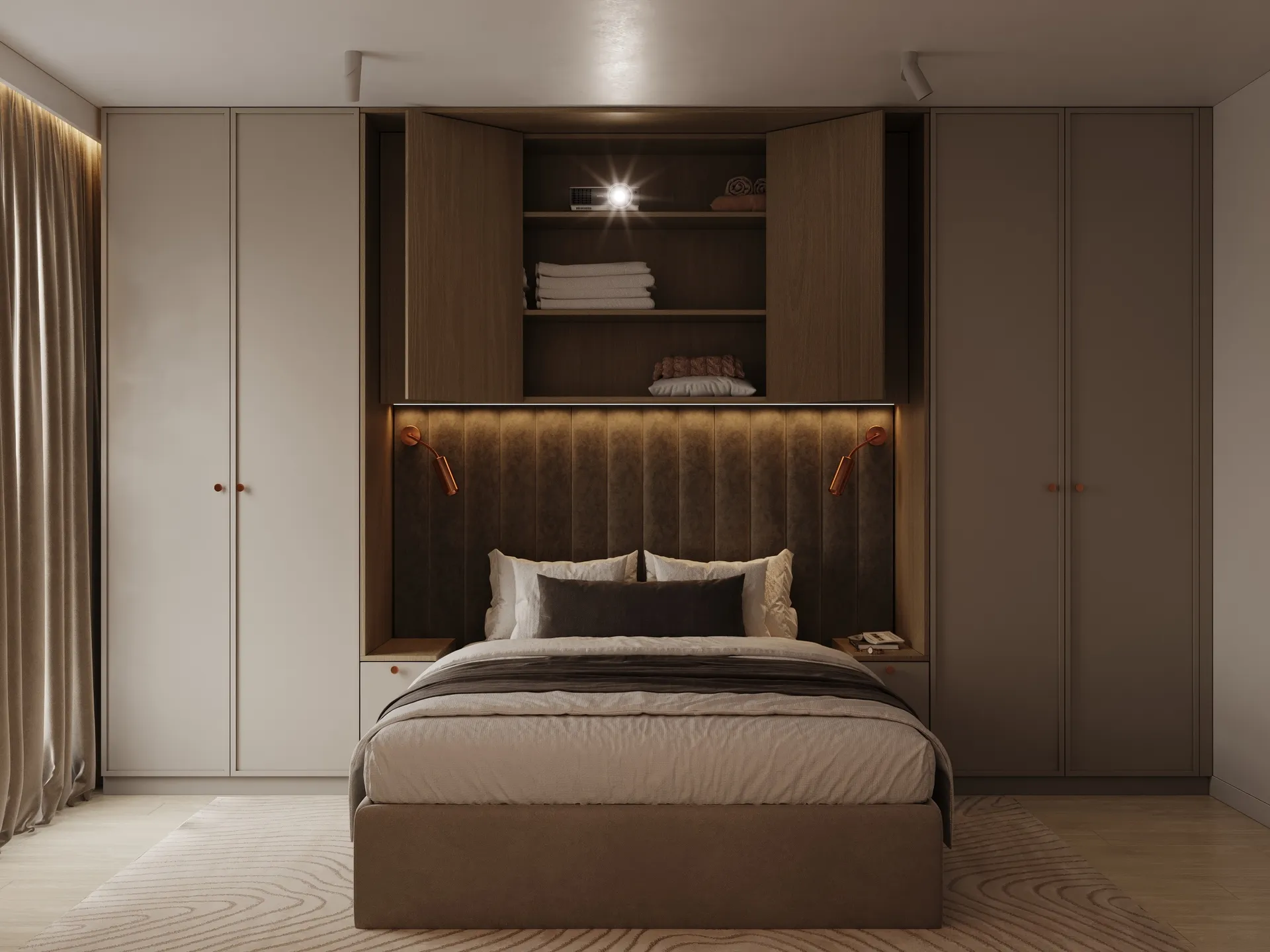 W sypialni zaprojektowano zabudowę szafy, która maksymalizuje funkcjonalność i pozostaje estetycznym elementem wystroju. Na ścianie naprzeciwko łóżka znalazło się miejsce na ekran do projekcji z rzutnika – idealne do wieczornego relaksu z filmem.