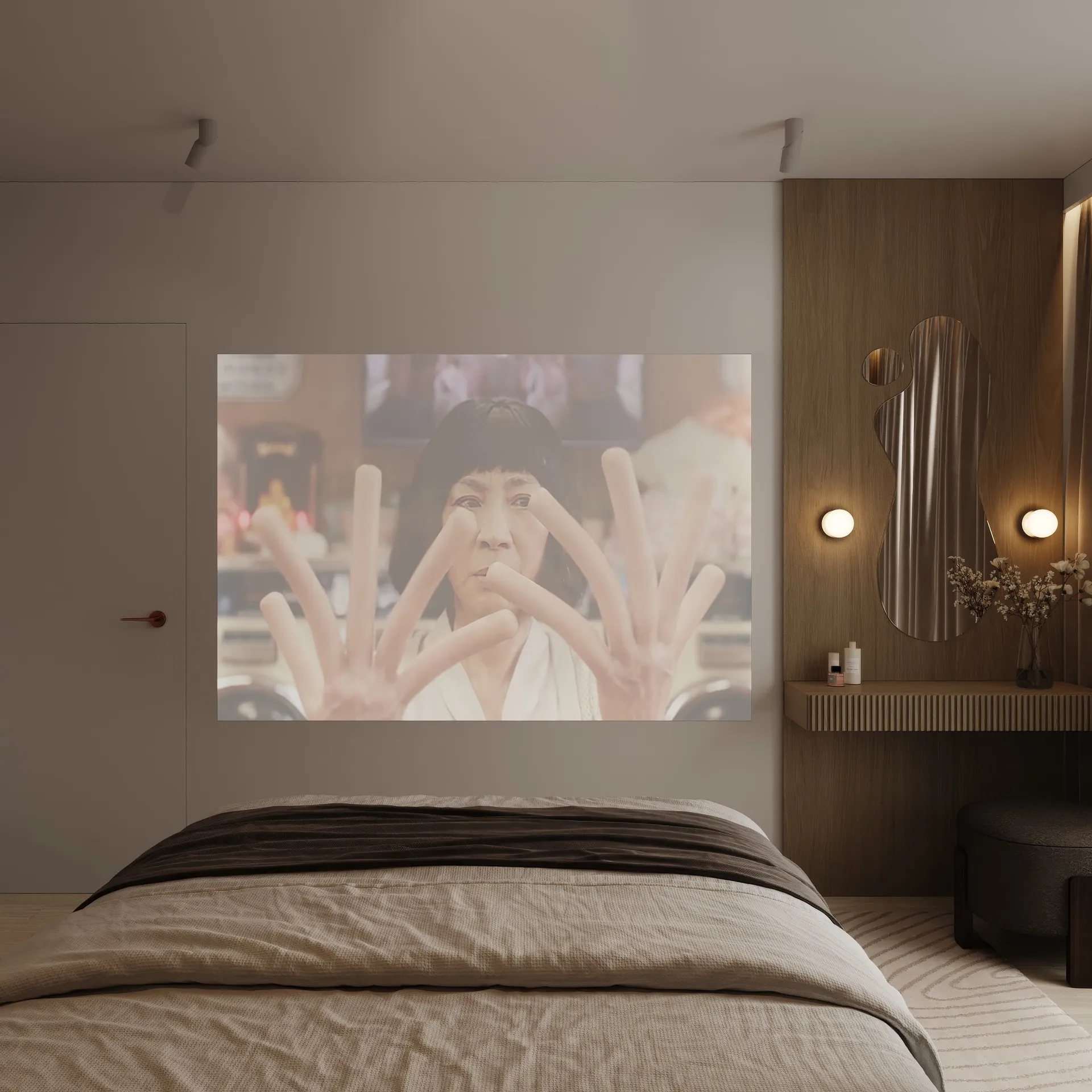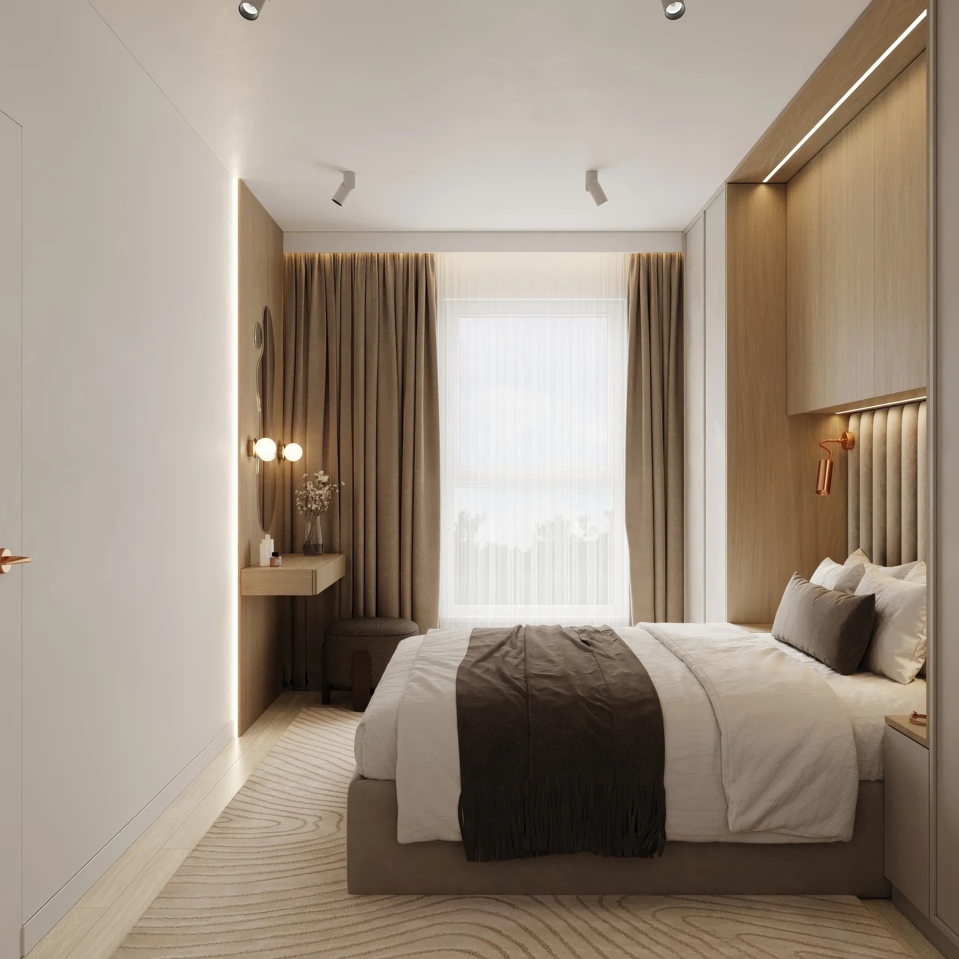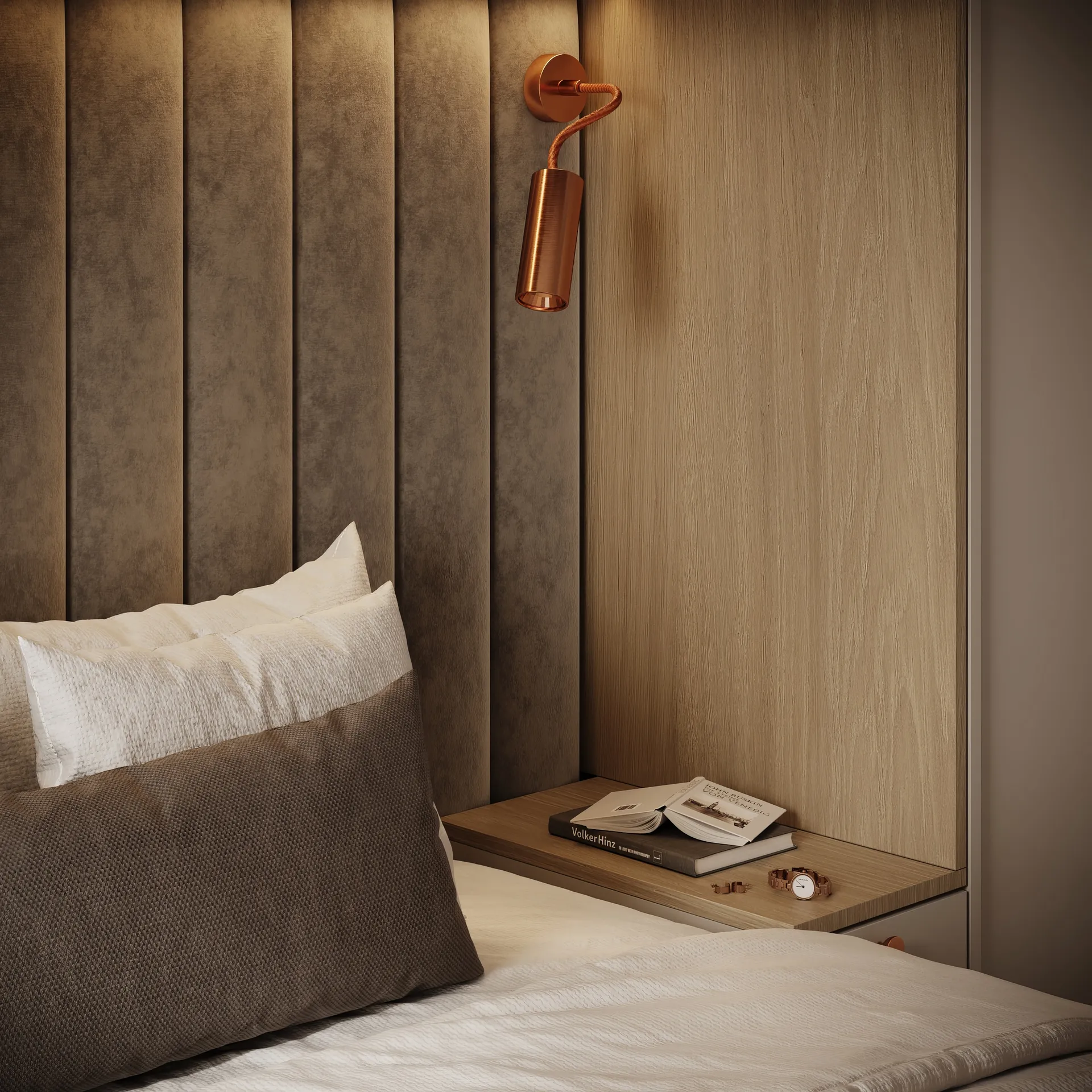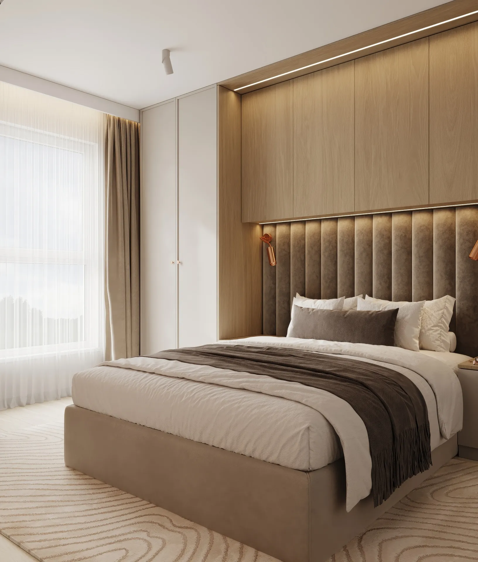 W sypialni zaprojektowano zabudowę szafy, która maksymalizuje funkcjonalność i pozostaje estetycznym elementem wystroju. Na ścianie naprzeciwko łóżka znalazło się miejsce na ekran do projekcji z rzutnika – idealne do wieczornego relaksu z filmem.