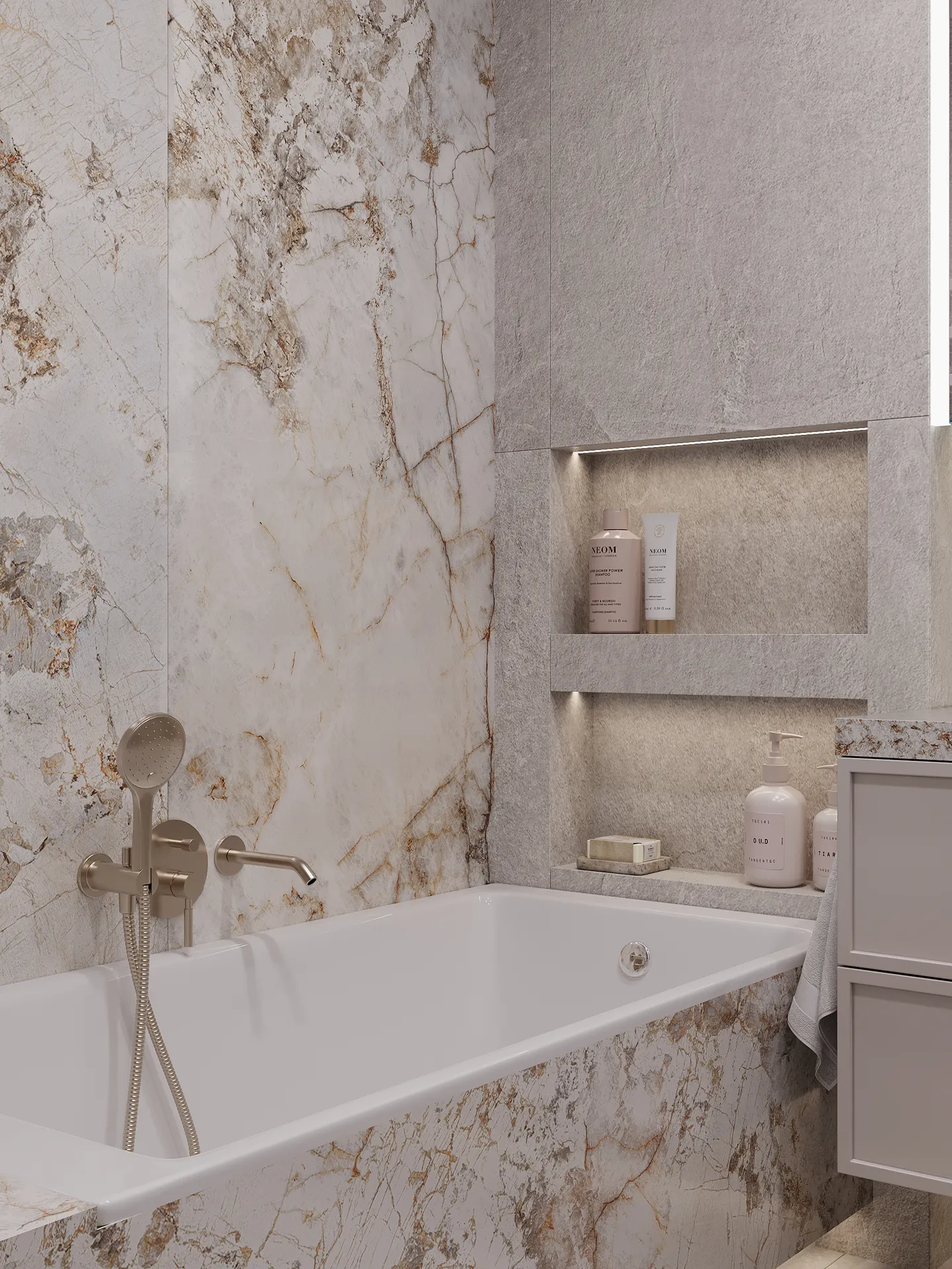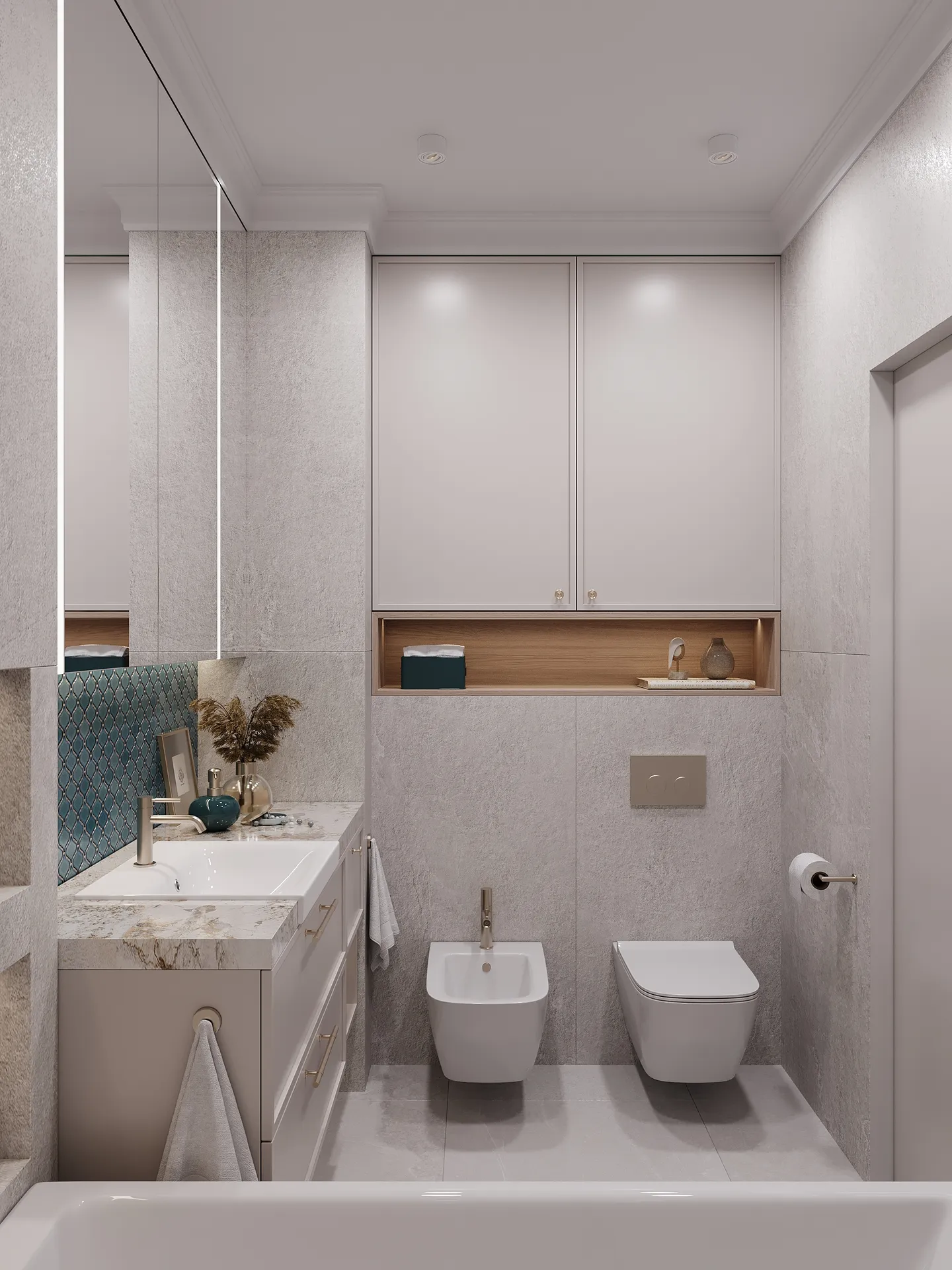 Jasna łazienka z wanną i bidetem została uzupełniona płytkami harmonizującymi z wystrojem całego mieszkania. Kuchnia, mimo niewielkiego metrażu, pozwala na komfortowe gotowanie i przechowywanie tego co niezbędne.