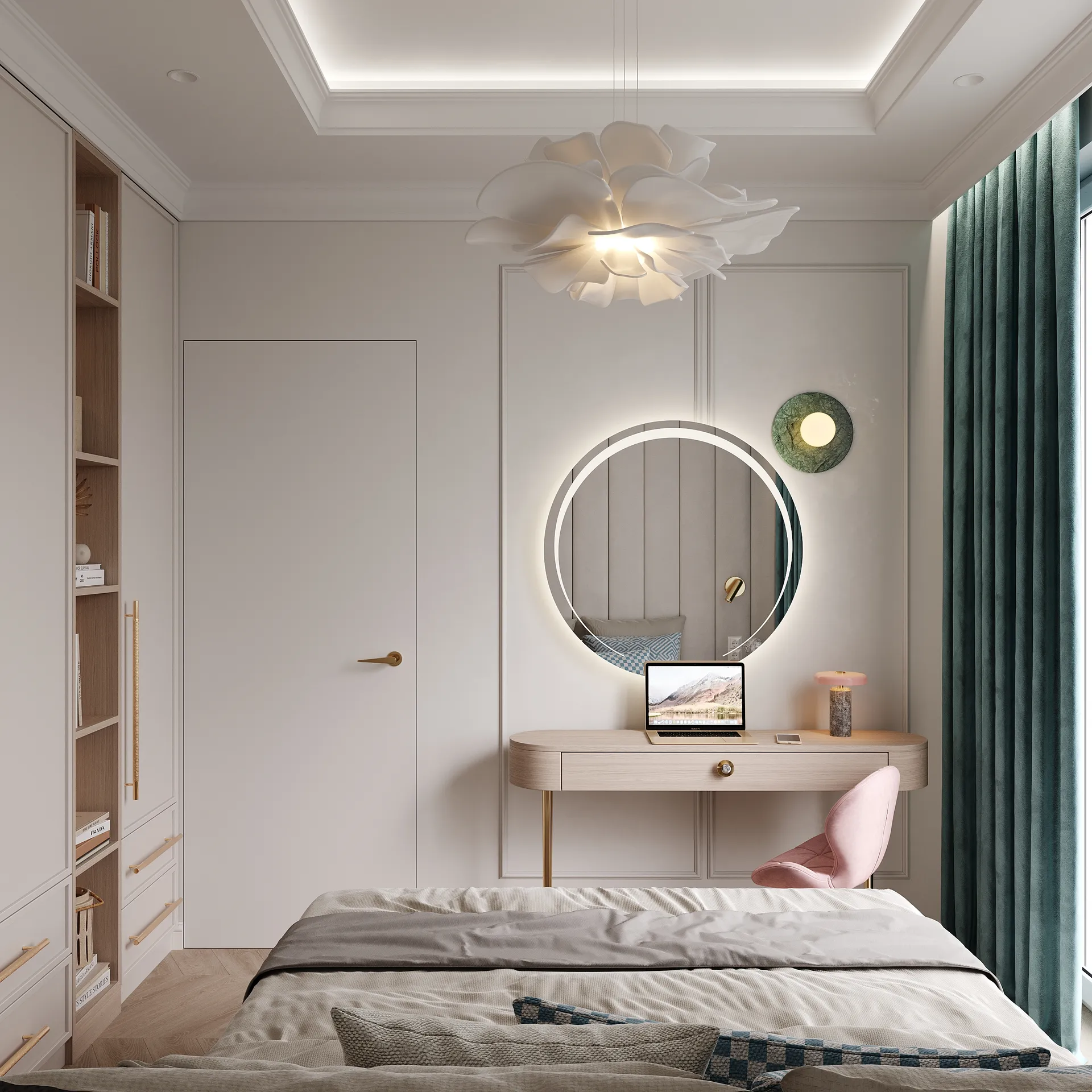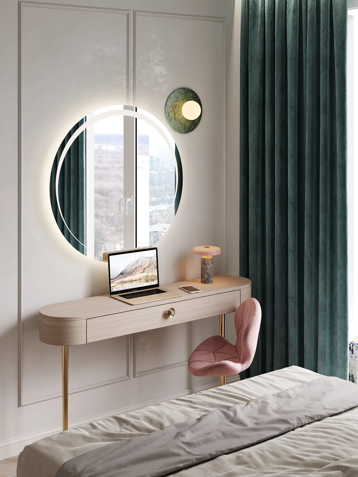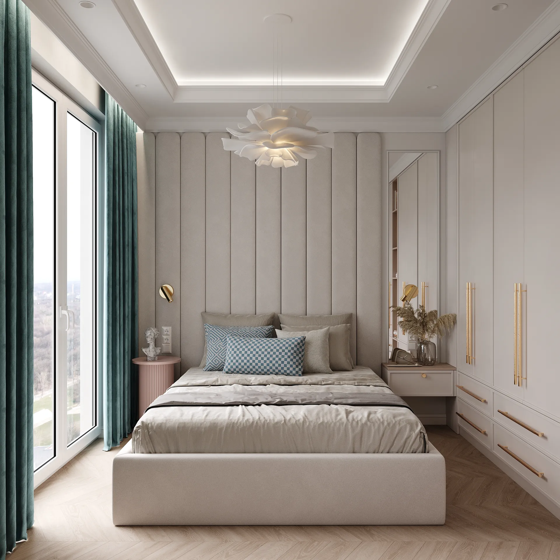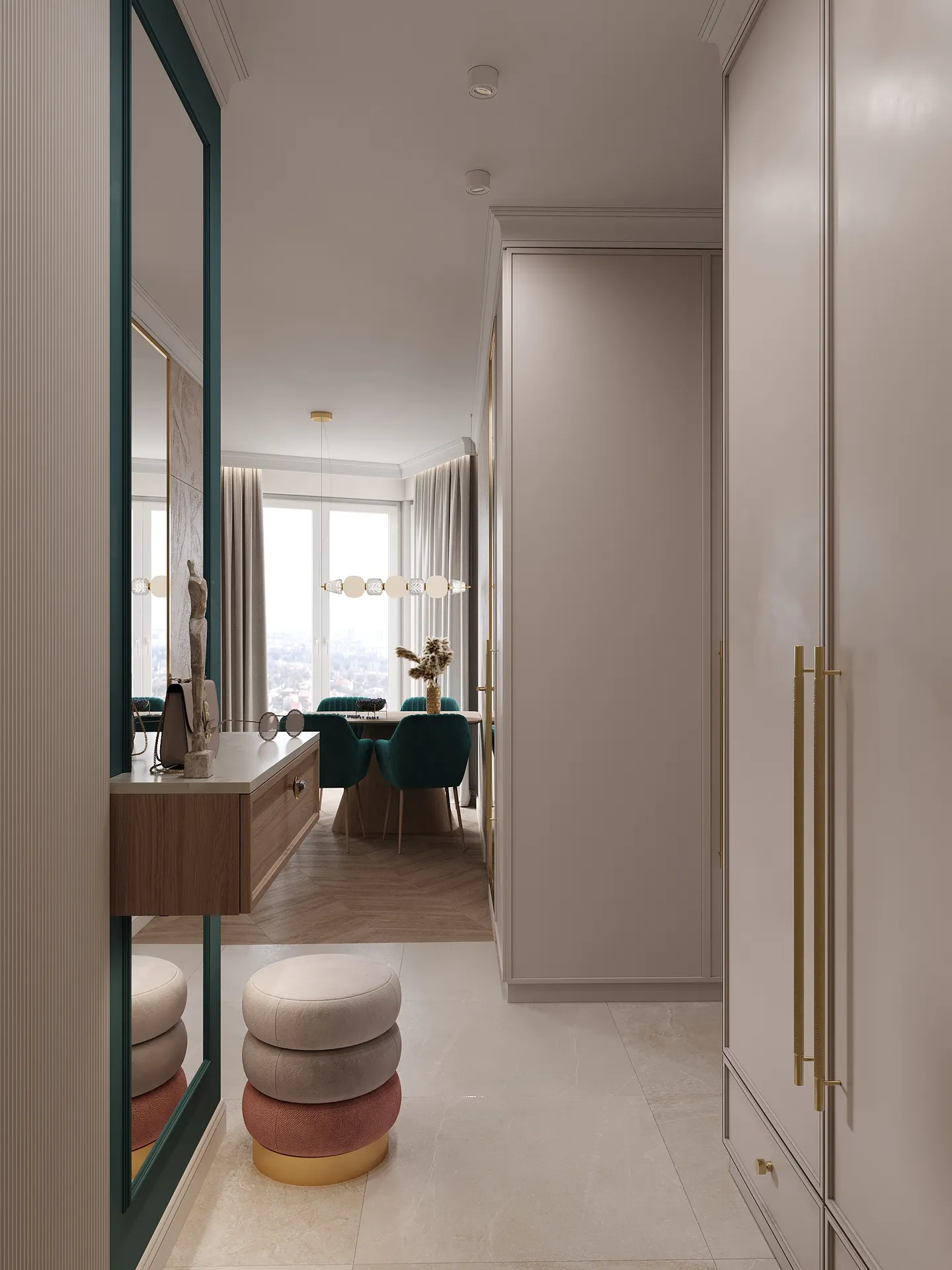 Salon z częścią wypoczynkową i stołem do wspólnych posiłków wyróżnia elegancka tapeta, która – poza estetyką – pełni funkcję maskującą wejście do sypialni. Sama sypialnia to oaza spokoju: zabudowa szaf, toaletka i głęboko zielone zasłony.
