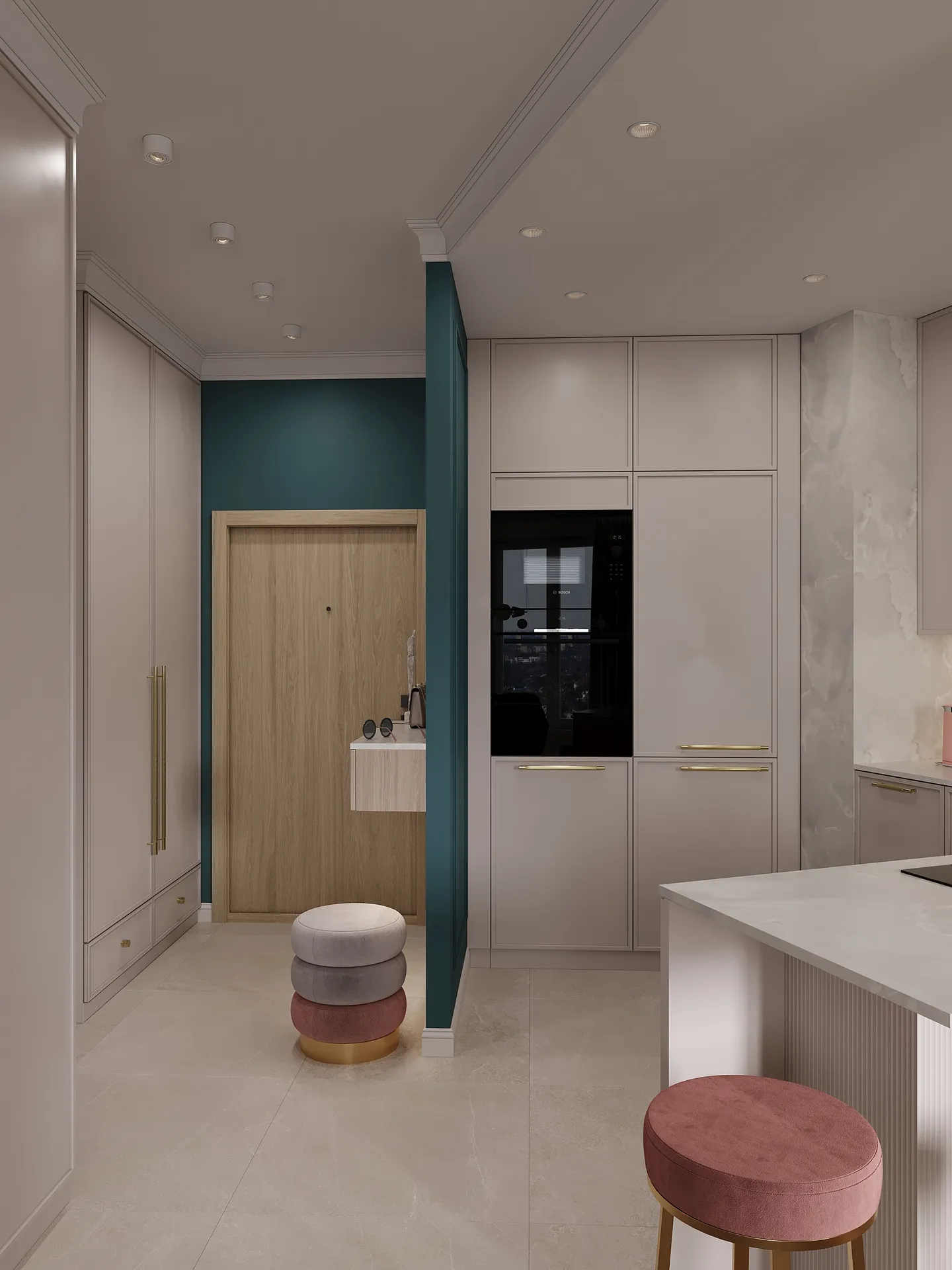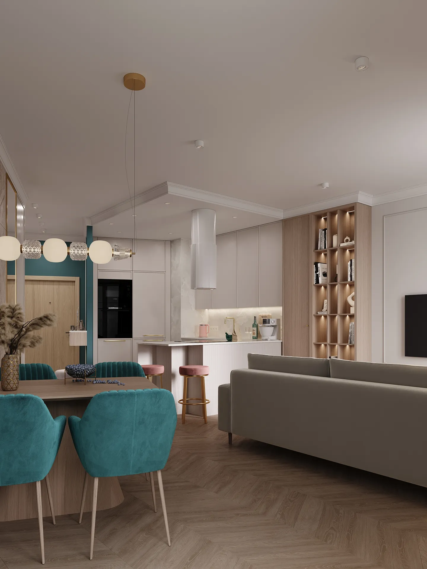 To 45-metrowe mieszkanie w Warszawie zaprojektowano z myślą o aktywnej singielce ceniącej zarówno styl, jak i wygodę. Wnętrze emanuje pozytywną energią dzięki kolorowym akcentom i zielonym detalom, które nadają przestrzeni spójny, a zarazem indywidualny charakter.