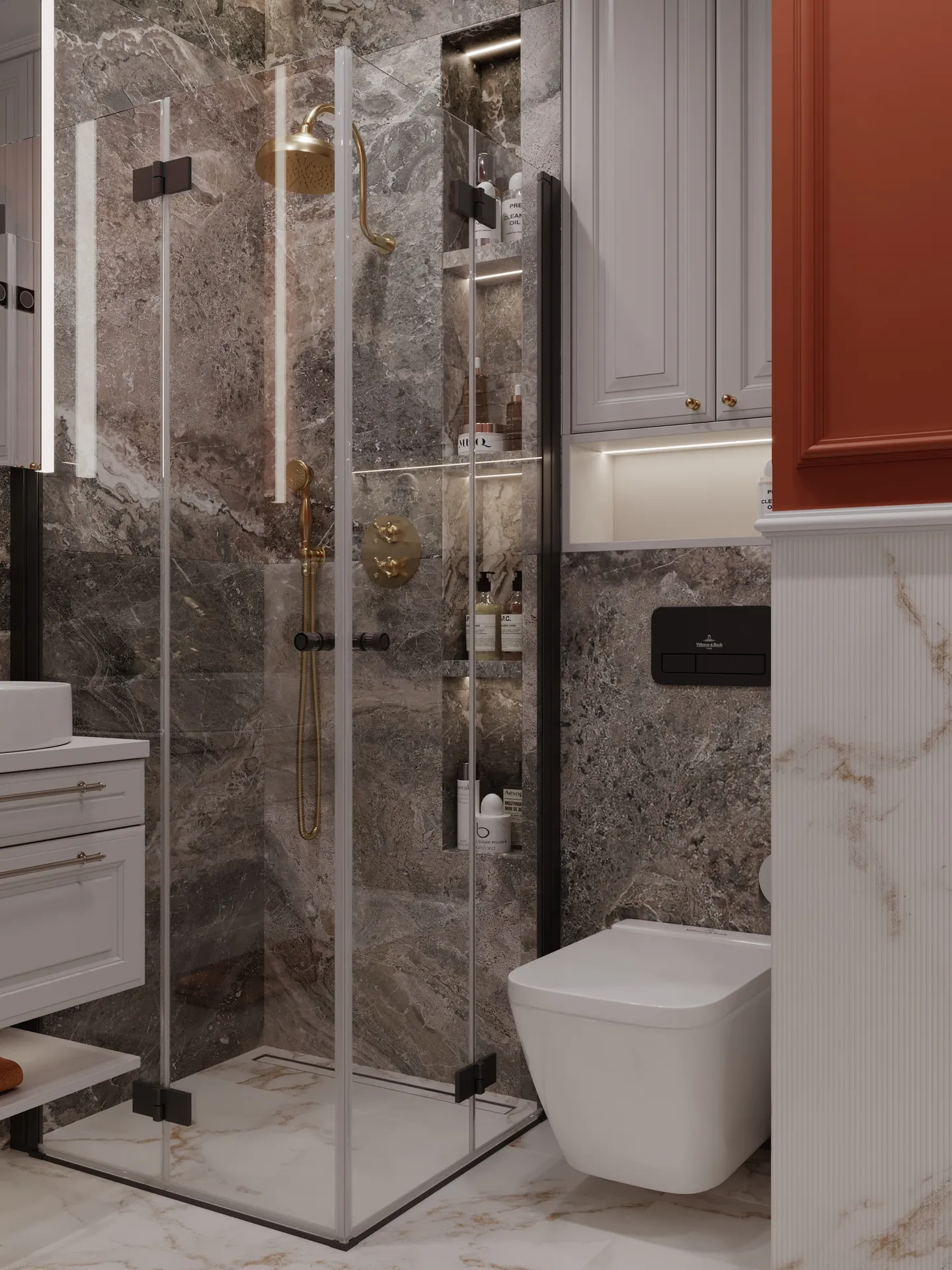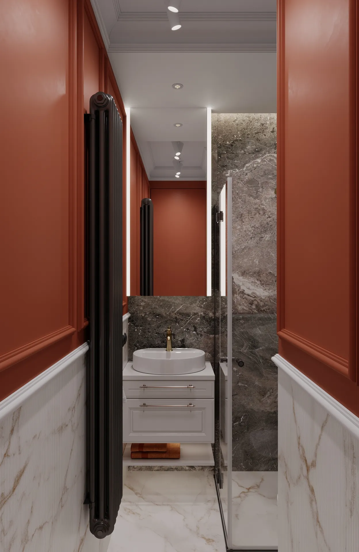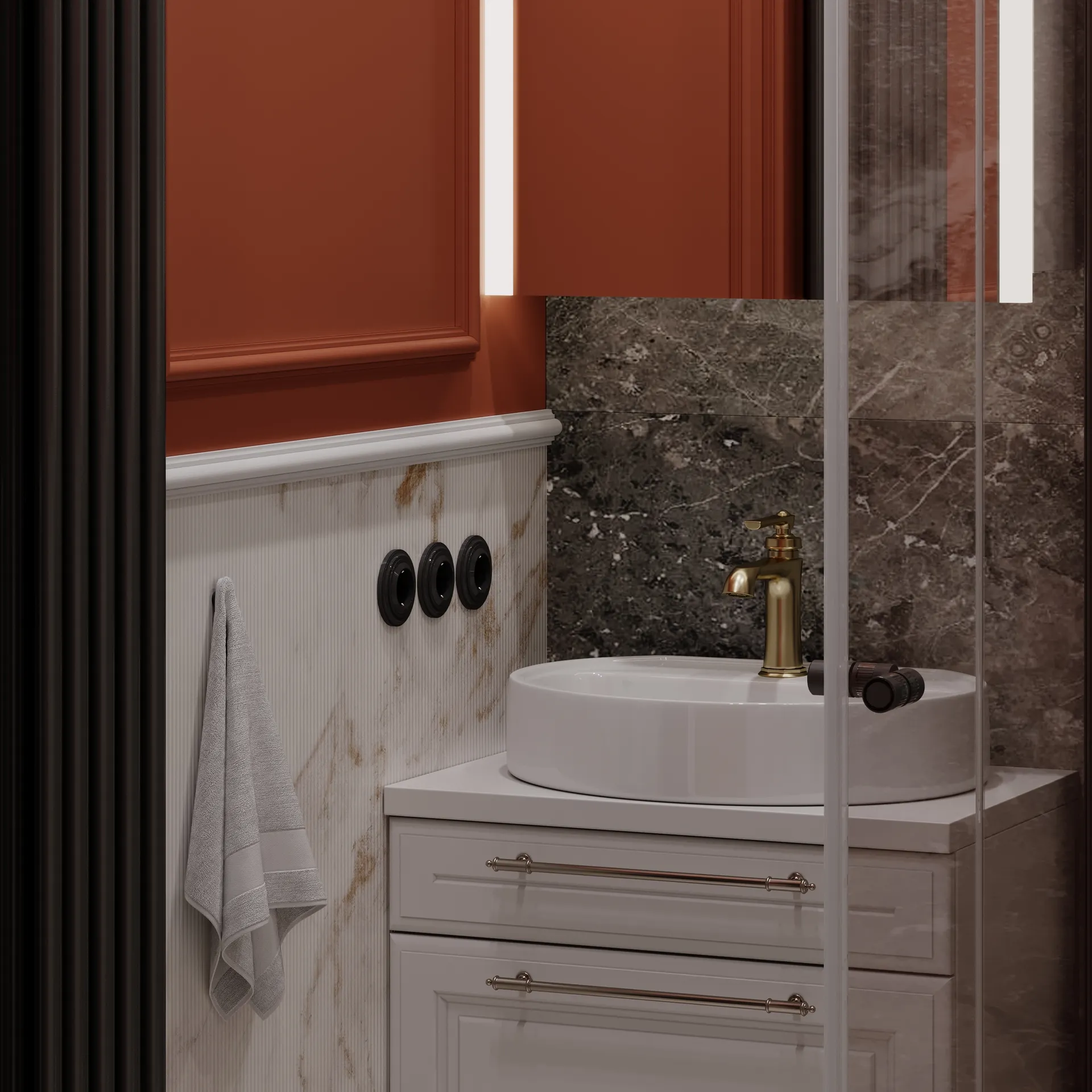 Całość dopełniają eleganckie płytki, drewniane podłogi i detale, które łączą historię z nowoczesnością.