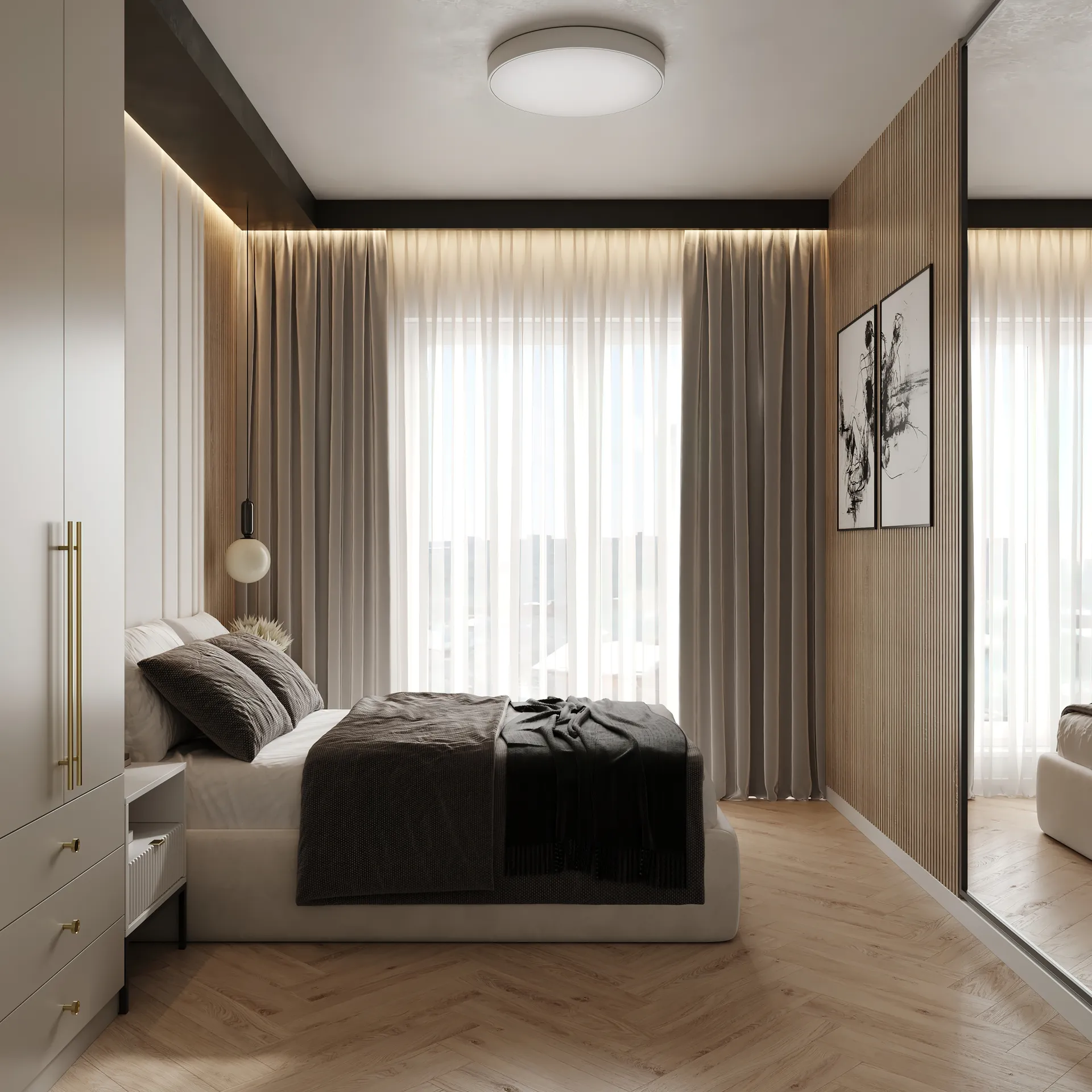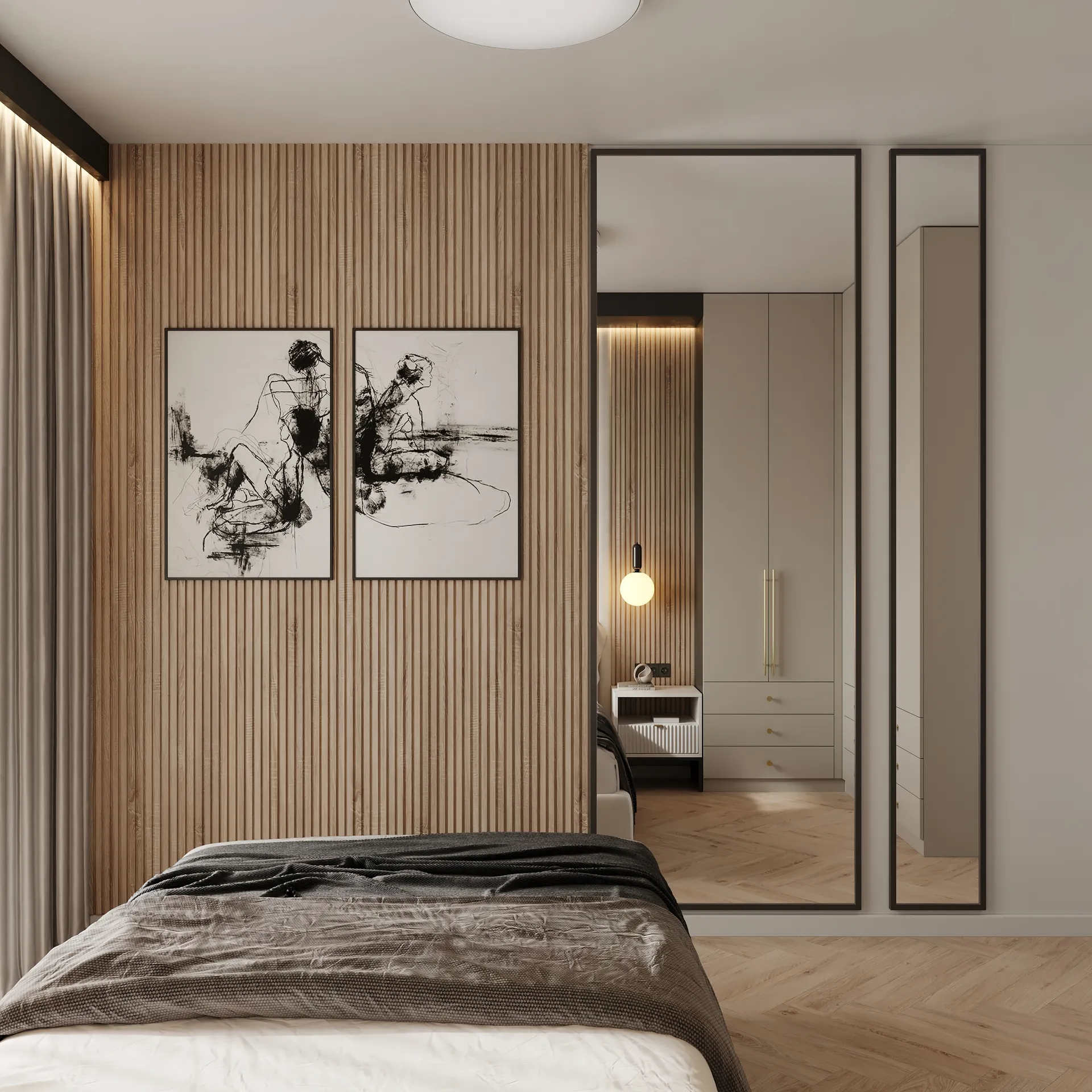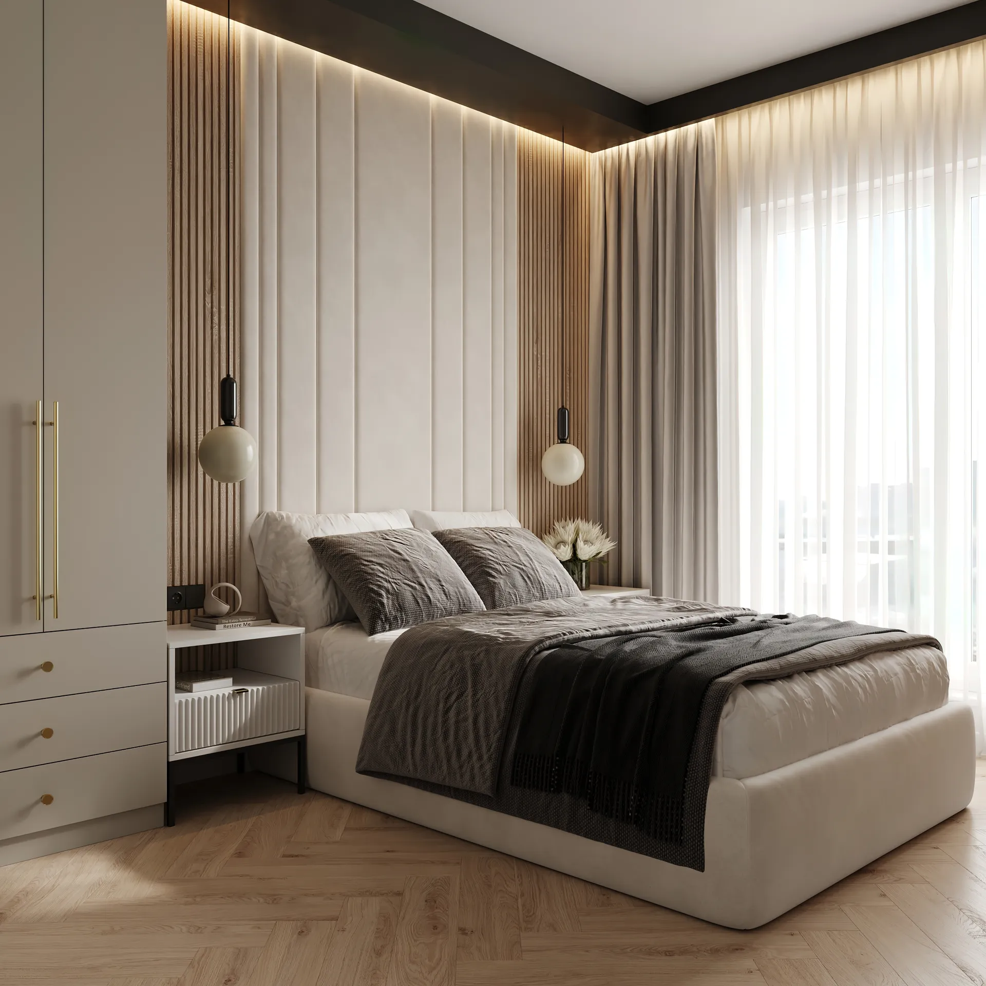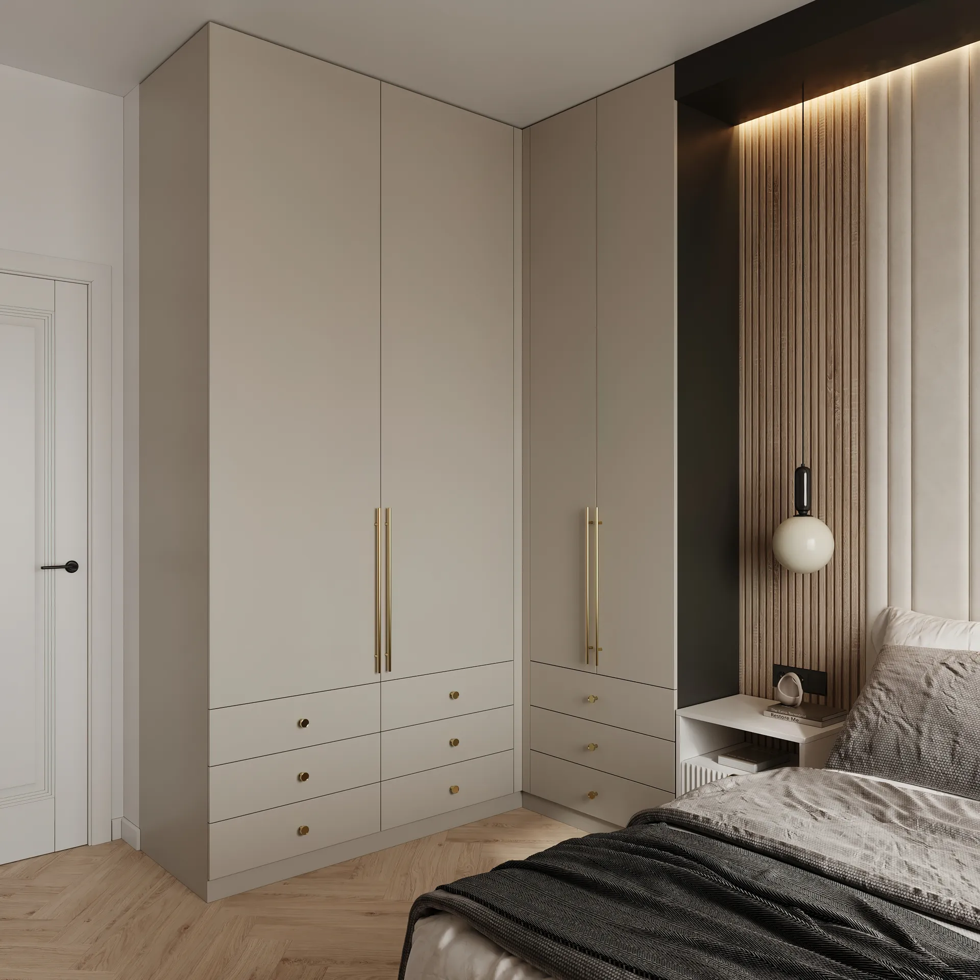Sypialnia główna to przestrzeń wyciszenia – stonowana kolorystyka, naturalne faktury i dobrze dobrane oświetlenie budują atmosferę sprzyjającą wypoczynkowi. W całym mieszkaniu widać dbałość o detale: elegancka armatura, starannie dobrane dodatki oraz spójna kolorystyka tworzą wnętrze, które nie poddaje się chwilowym trendom.