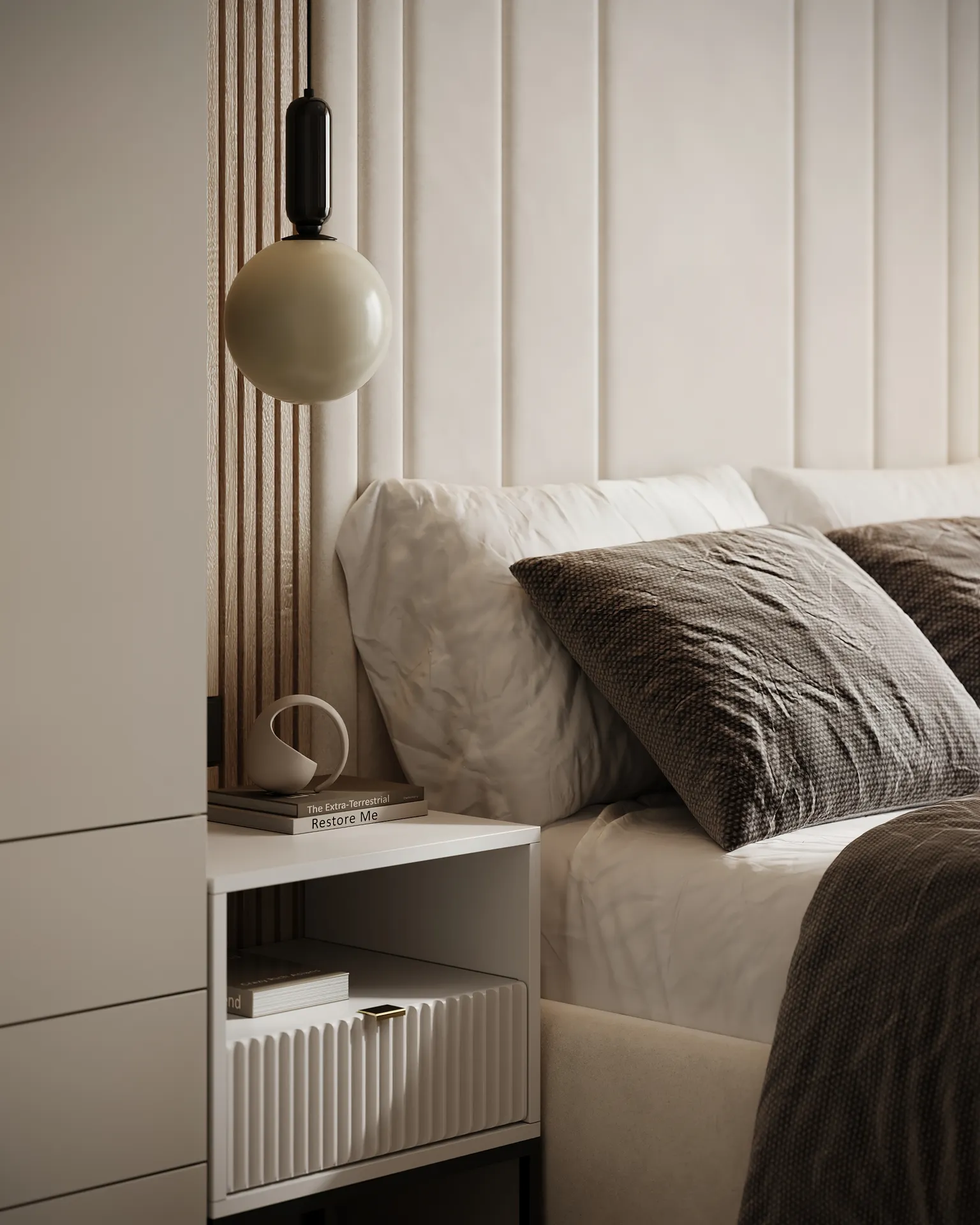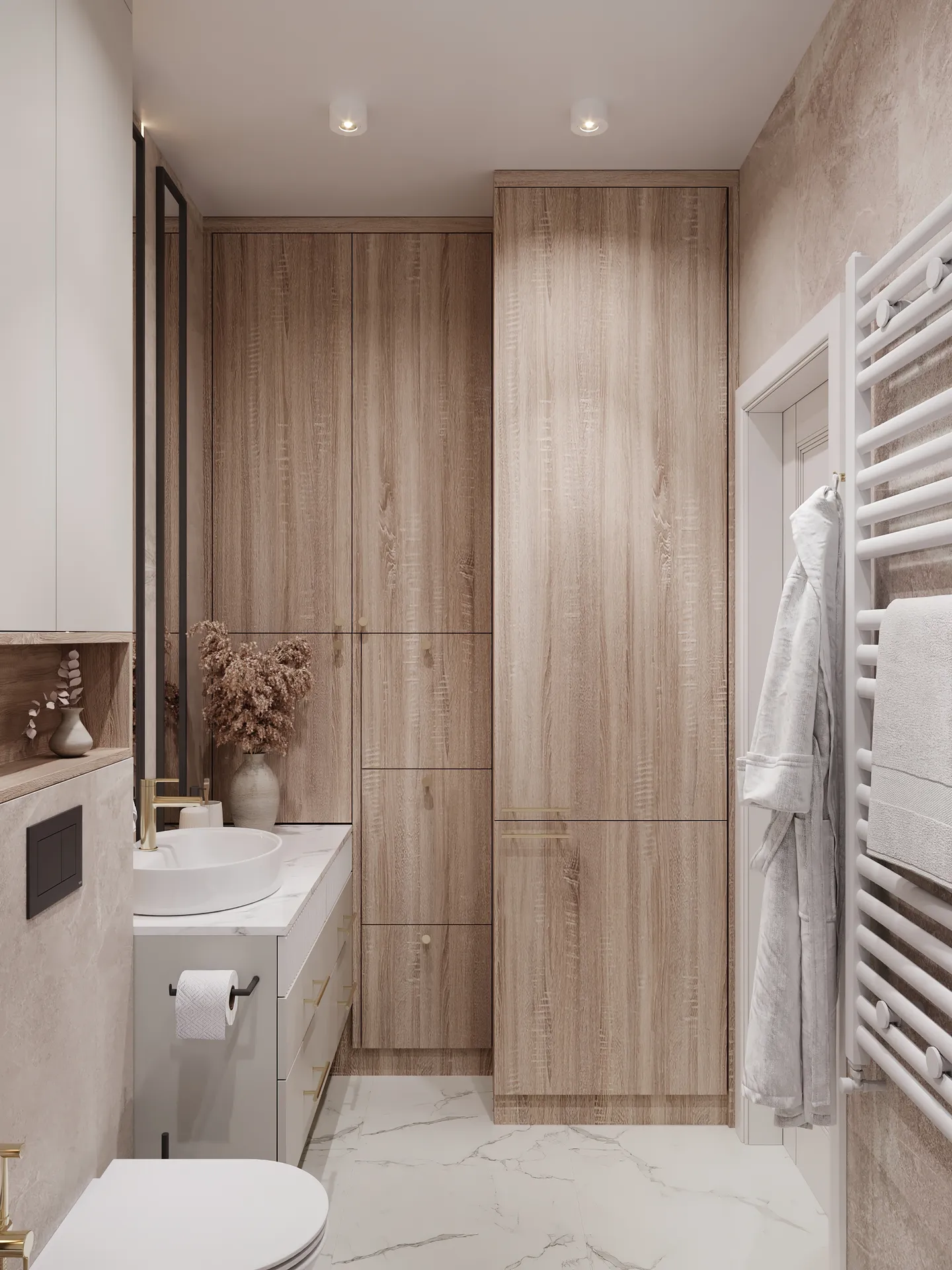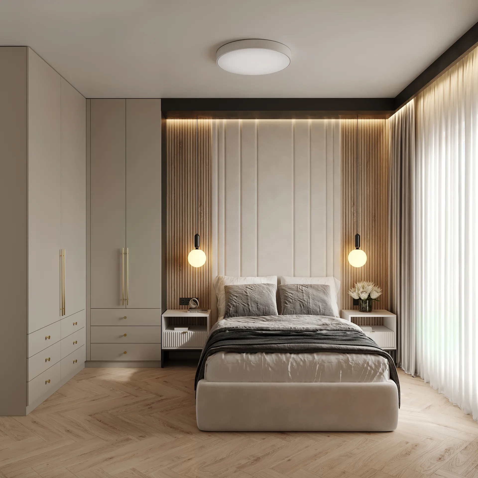 Sypialnia główna to przestrzeń wyciszenia – stonowana kolorystyka, naturalne faktury i dobrze dobrane oświetlenie budują atmosferę sprzyjającą wypoczynkowi. W całym mieszkaniu widać dbałość o detale: elegancka armatura, starannie dobrane dodatki oraz spójna kolorystyka tworzą wnętrze, które nie poddaje się chwilowym trendom.