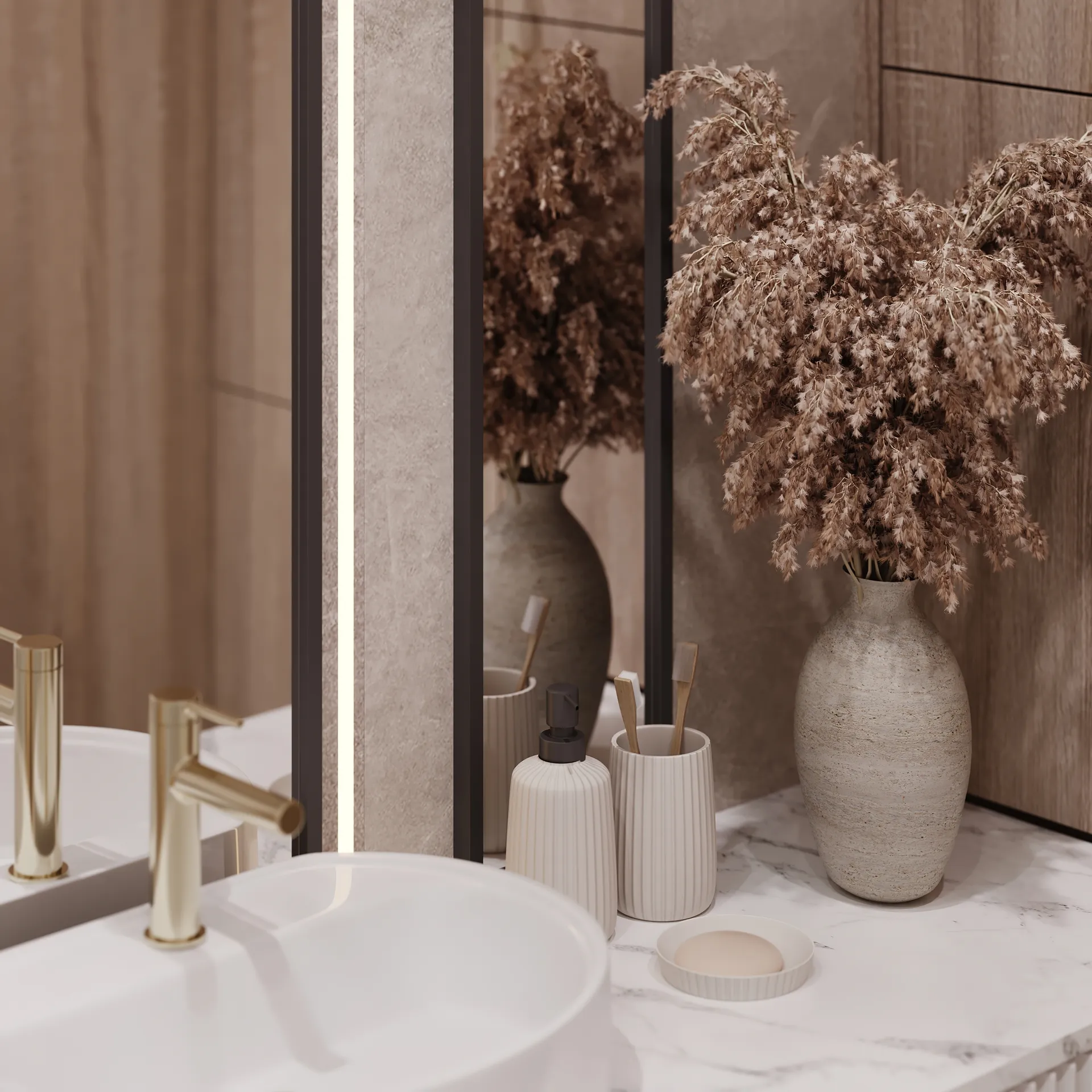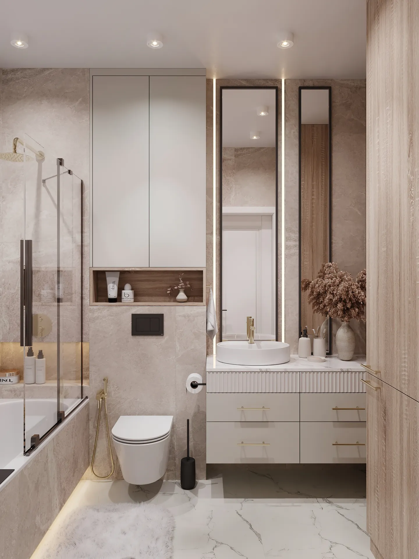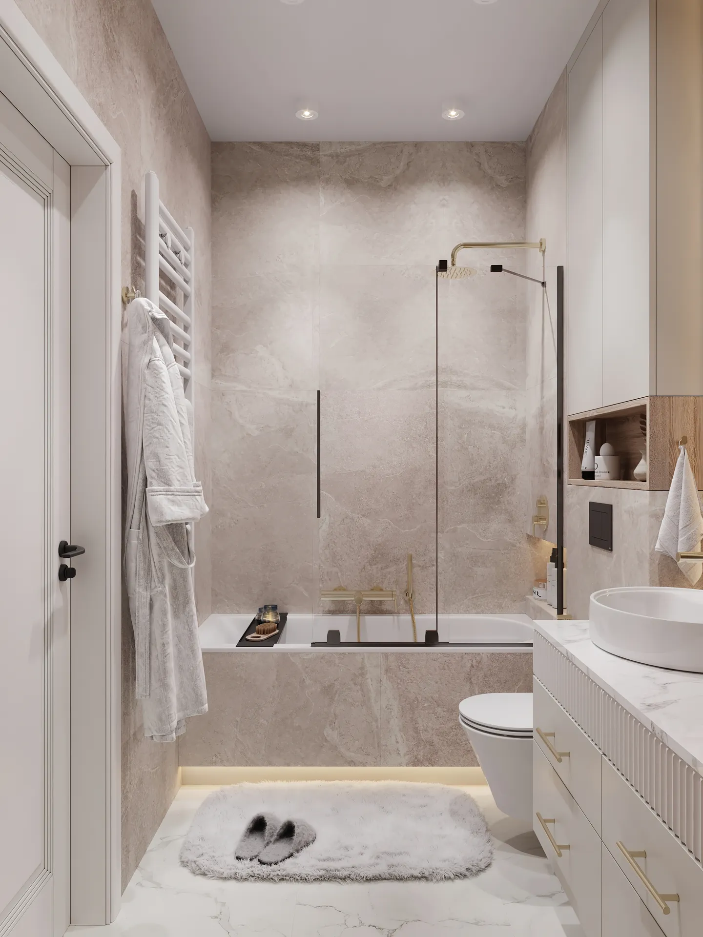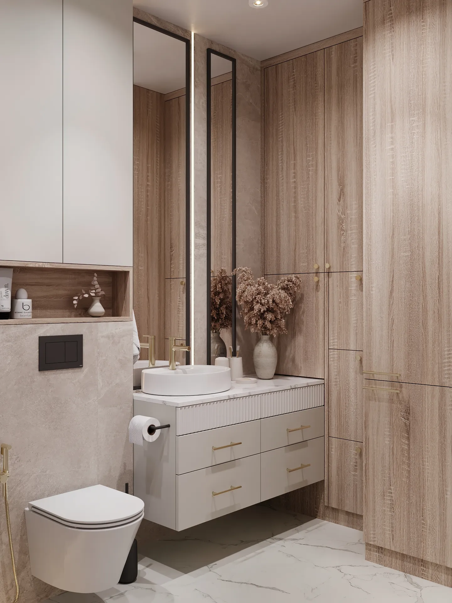Sypialnia główna to przestrzeń wyciszenia – stonowana kolorystyka, naturalne faktury i dobrze dobrane oświetlenie budują atmosferę sprzyjającą wypoczynkowi. W całym mieszkaniu widać dbałość o detale: elegancka armatura, starannie dobrane dodatki oraz spójna kolorystyka tworzą wnętrze, które nie poddaje się chwilowym trendom.