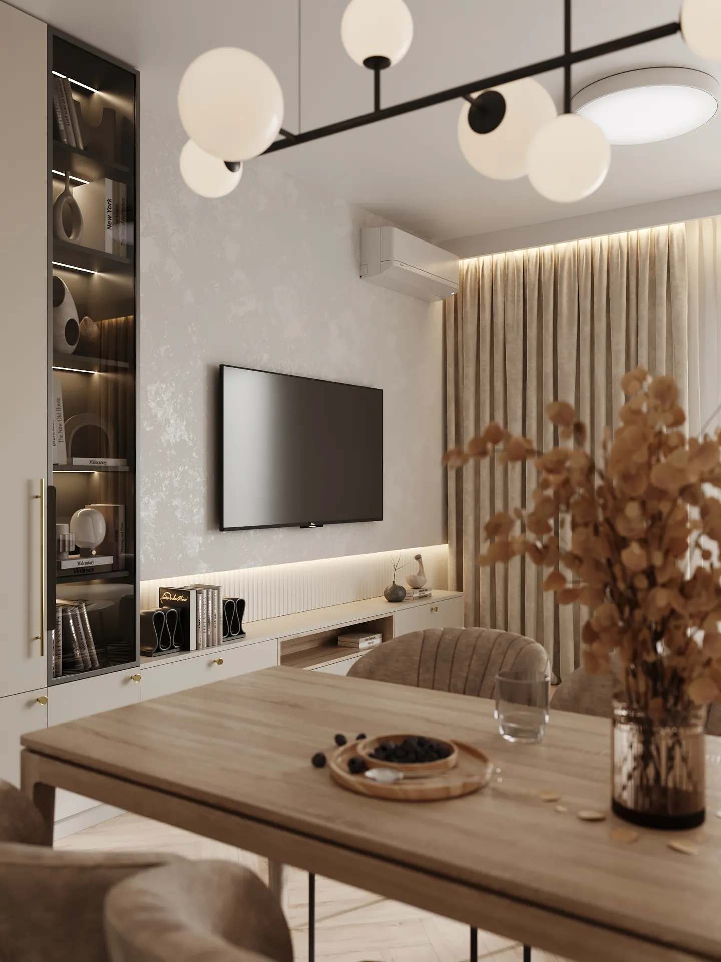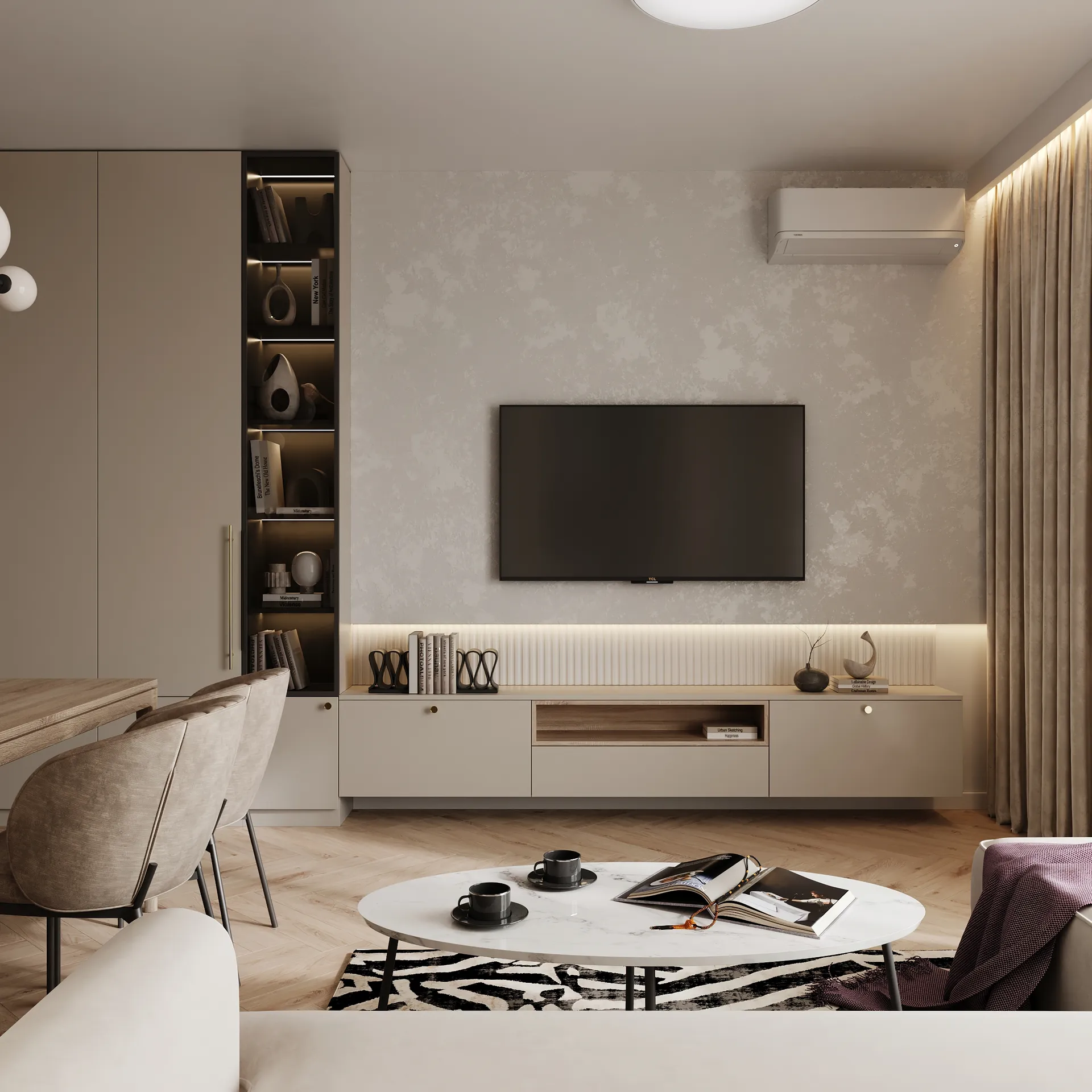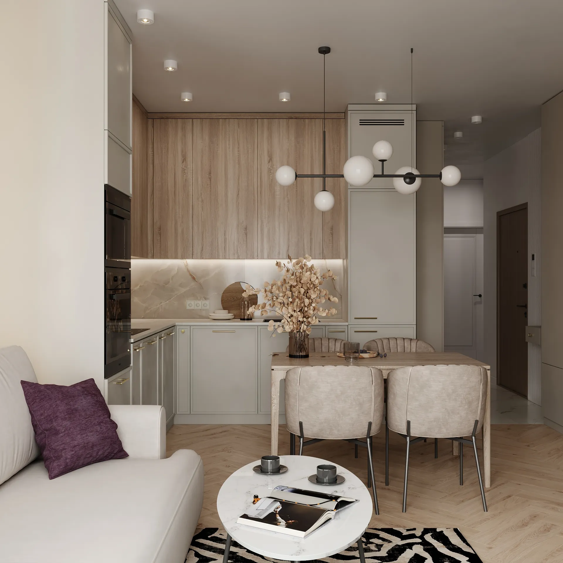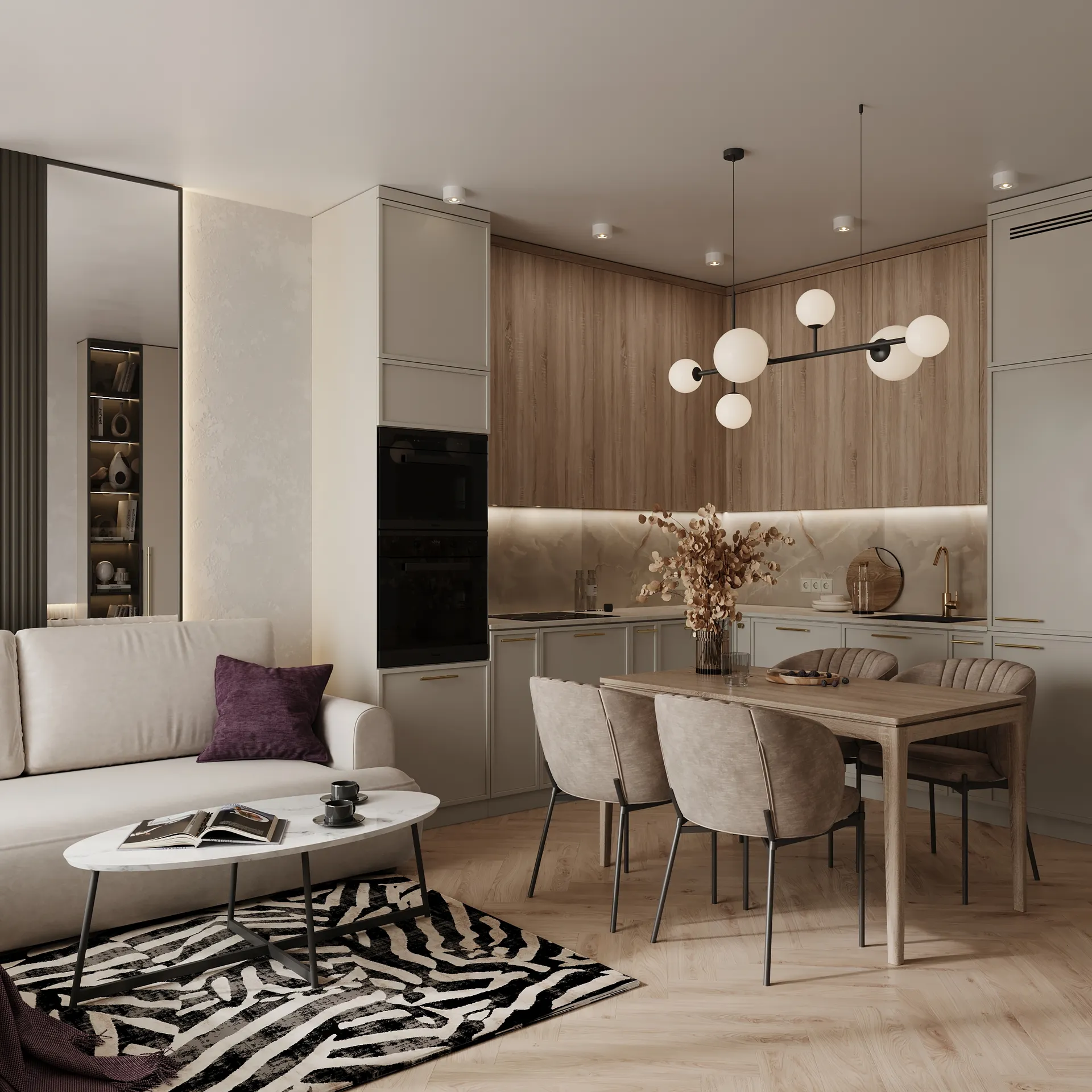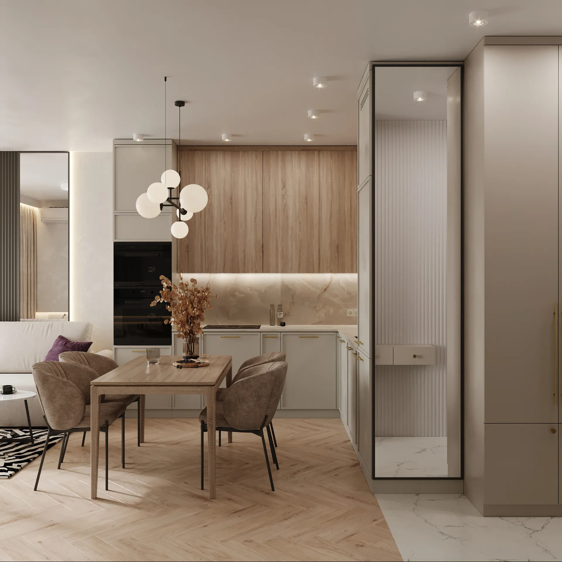 Sercem mieszkania jest jasny, otwarty salon, który płynnie łączy się z jadalnią i kuchnią. Całość utrzymana została w neutralnych, ciepłych tonach z naturalnymi wykończeniami, które wprowadzają atmosferę spokoju i elegancji. Zabudowa meblowa, miękkie tkaniny i delikatne światło budują klimat nowoczesnej przytulności.