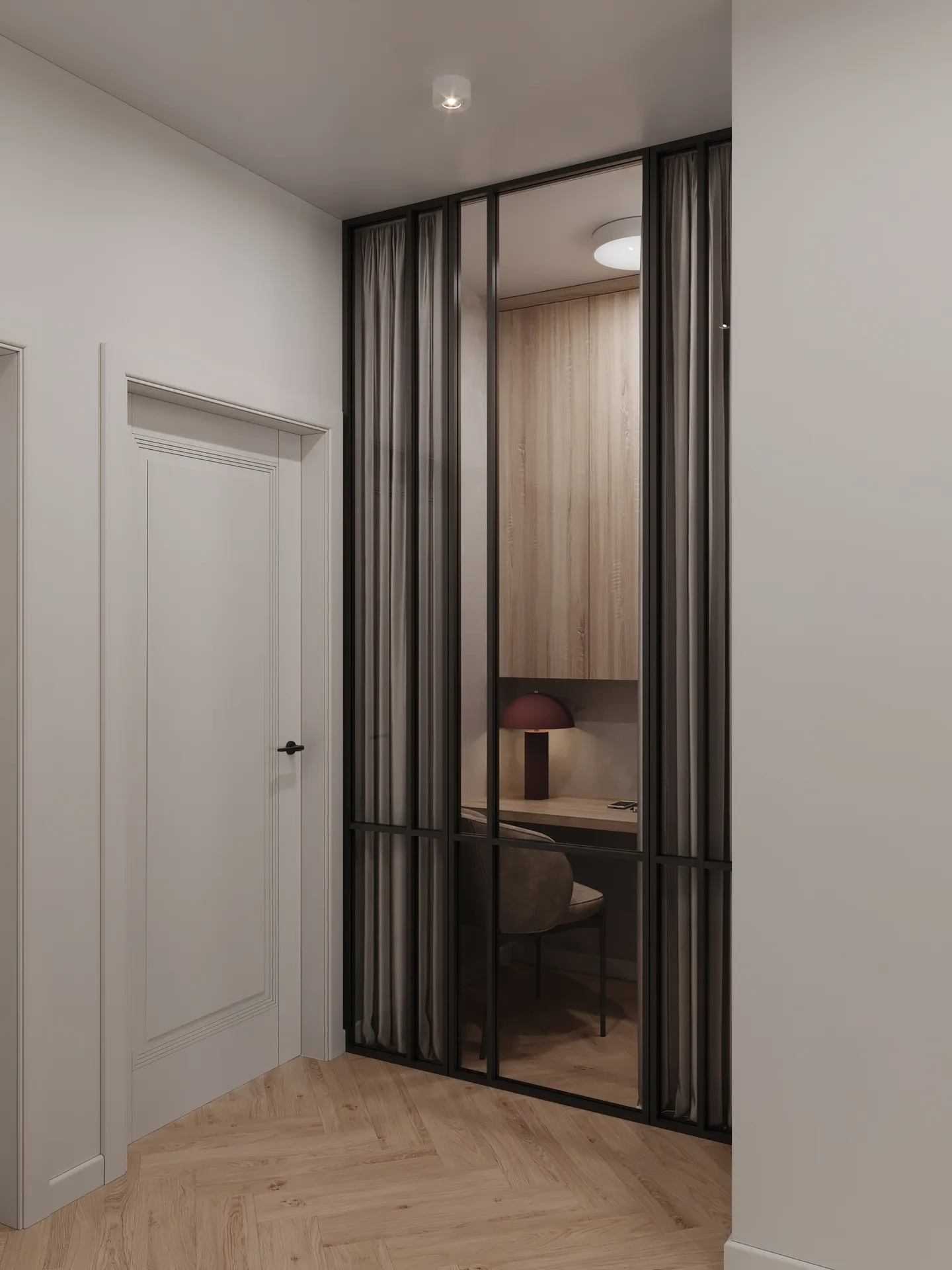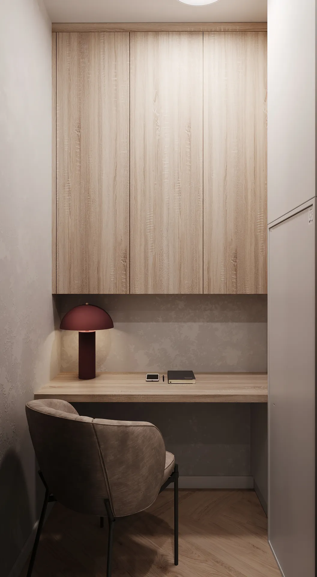 Jednym z kluczowych założeń projektowych było wydzielenie niewielkiej, ale wyraźnie oddzielonej strefy do pracy. Dzięki sprytnemu rozmieszczeniu zabudowy oraz użyciu wizualnych podziałów, udało się stworzyć ergonomiczne miejsce do pracy zdalnej, nie tracąc funkcjonalności wnętrza.
