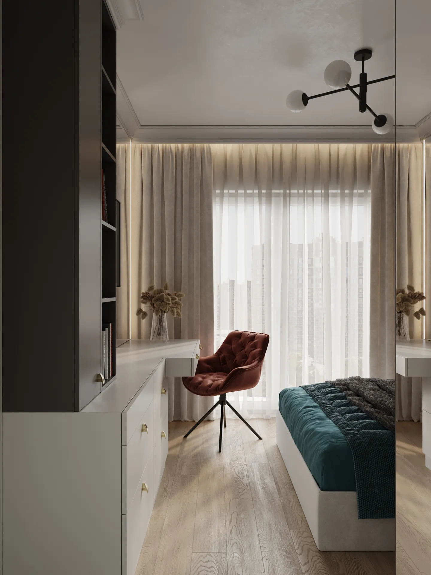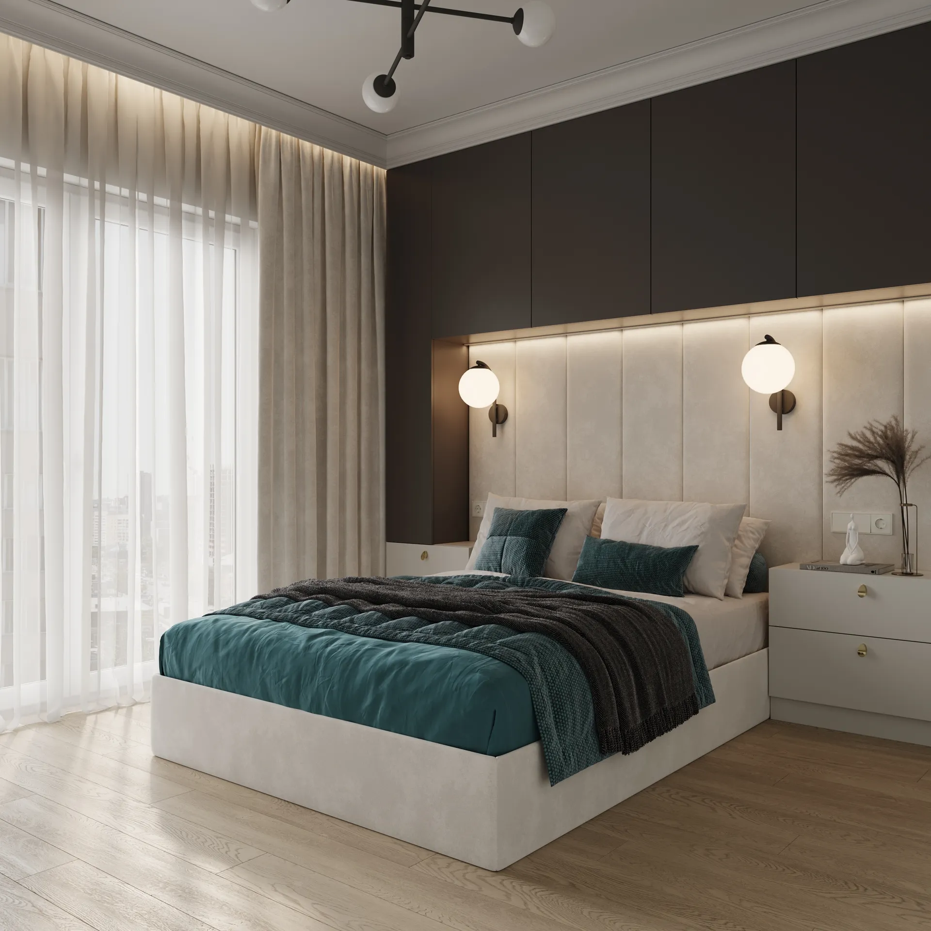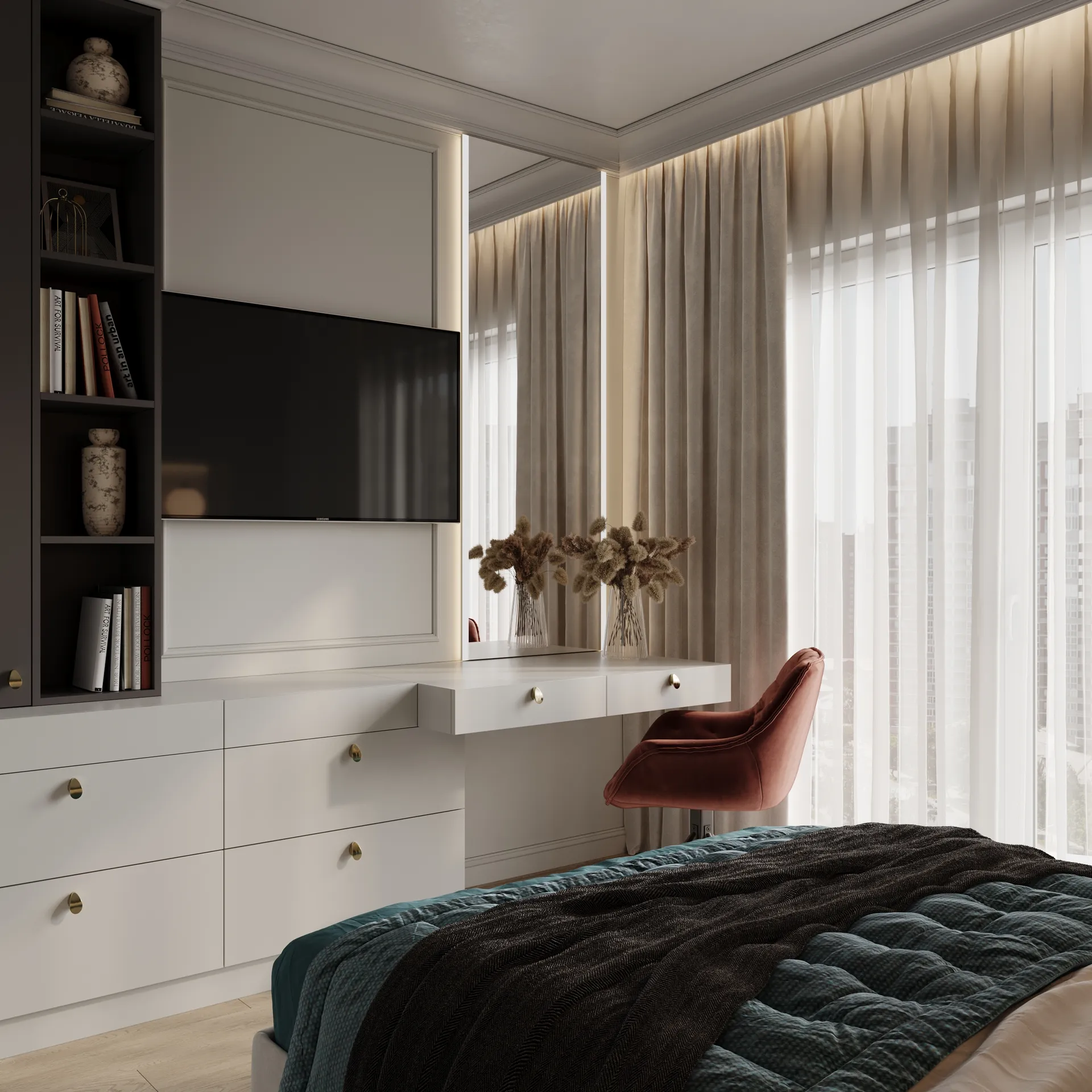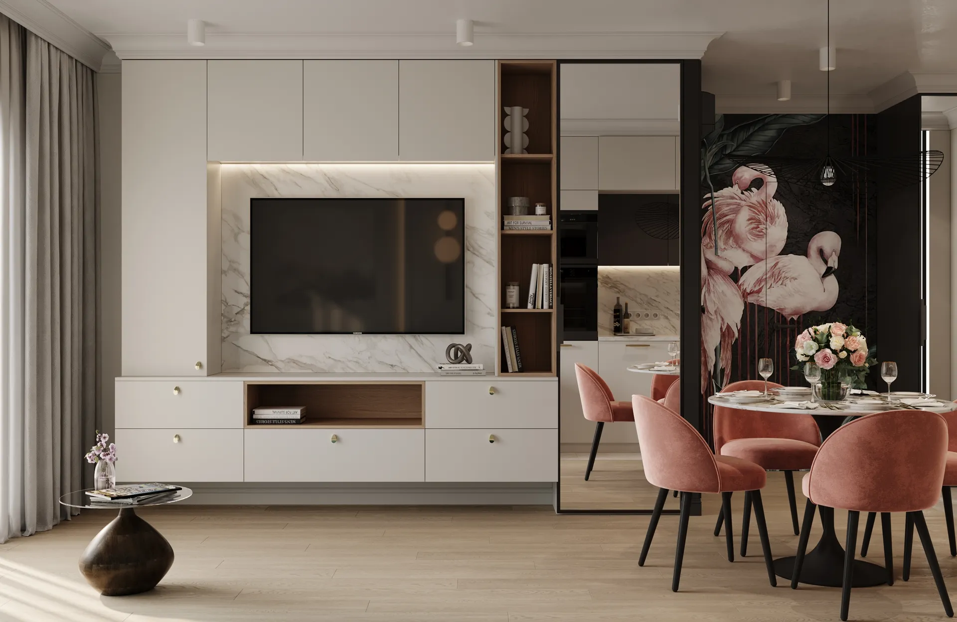 Duża zabudowa meblowa została zaprojektowana tak, by maksymalnie wykorzystać przestrzeń i jednocześnie nie przytłoczyć wnętrza. Dzięki temu mieszkanie jest wygodne, a wszystkie strefy – kuchnia, salon, sypialnia – pozostają dobrze zorganizowane.