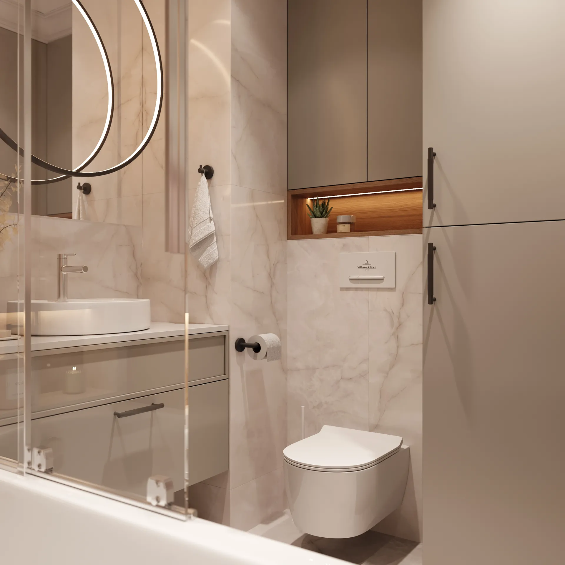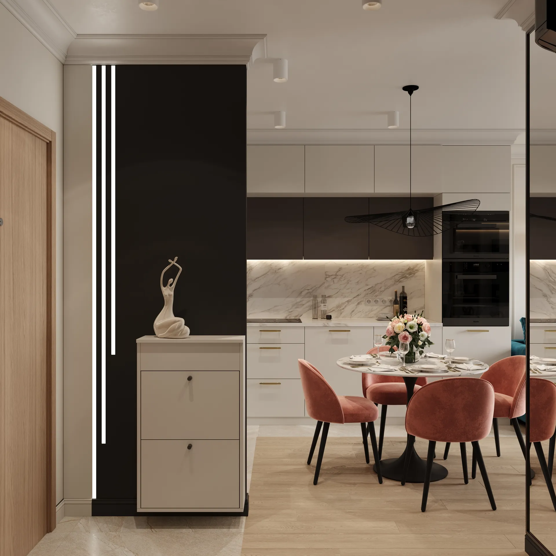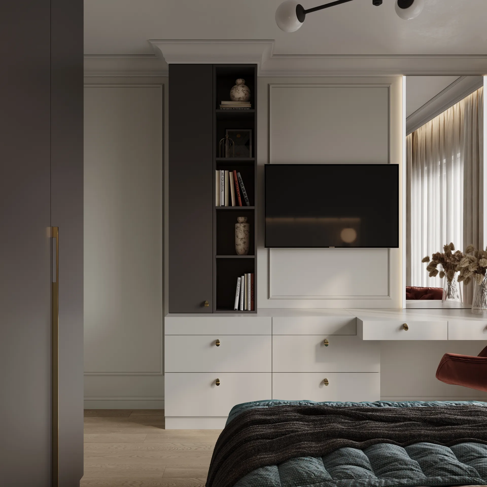 Styl modern classic został tutaj przełożony na kameralną skalę – eleganckie listwy, klasyczne uchwyty i nowoczesne bryły mebli tworzą spójną, dopracowaną całość.