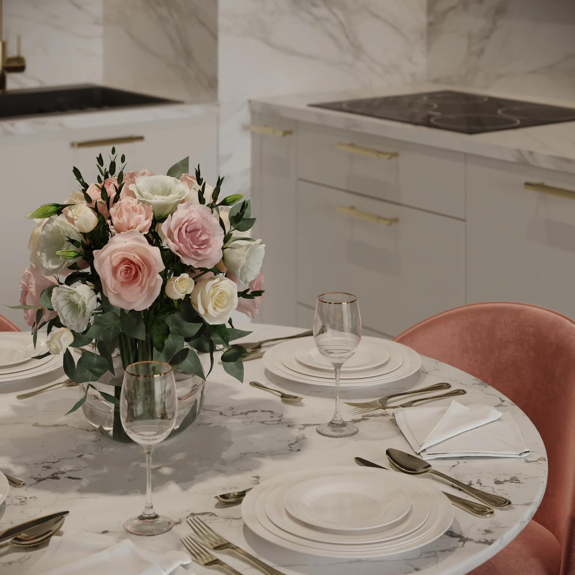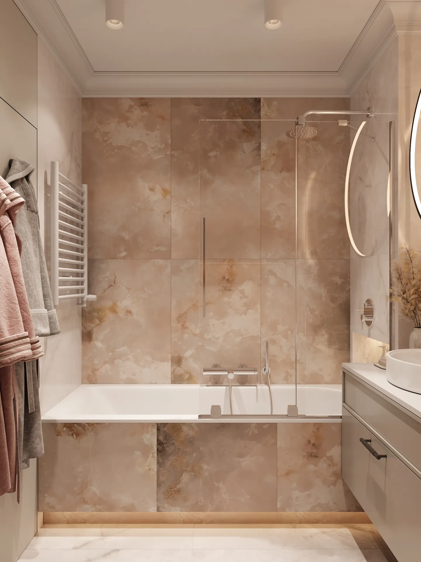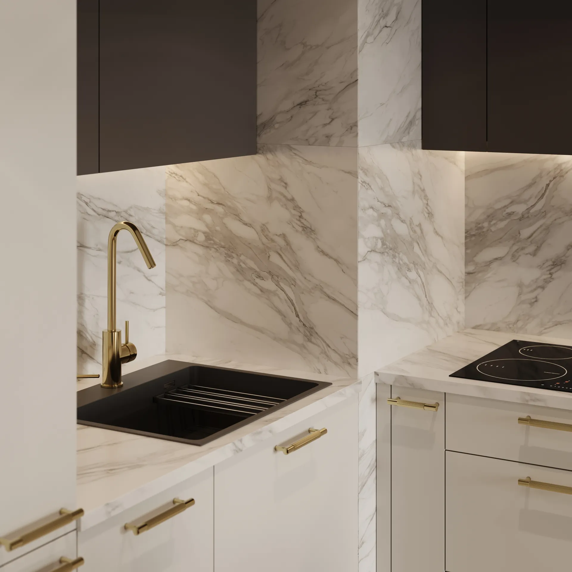 Styl modern classic został tutaj przełożony na kameralną skalę – eleganckie listwy, klasyczne uchwyty i nowoczesne bryły mebli tworzą spójną, dopracowaną całość.