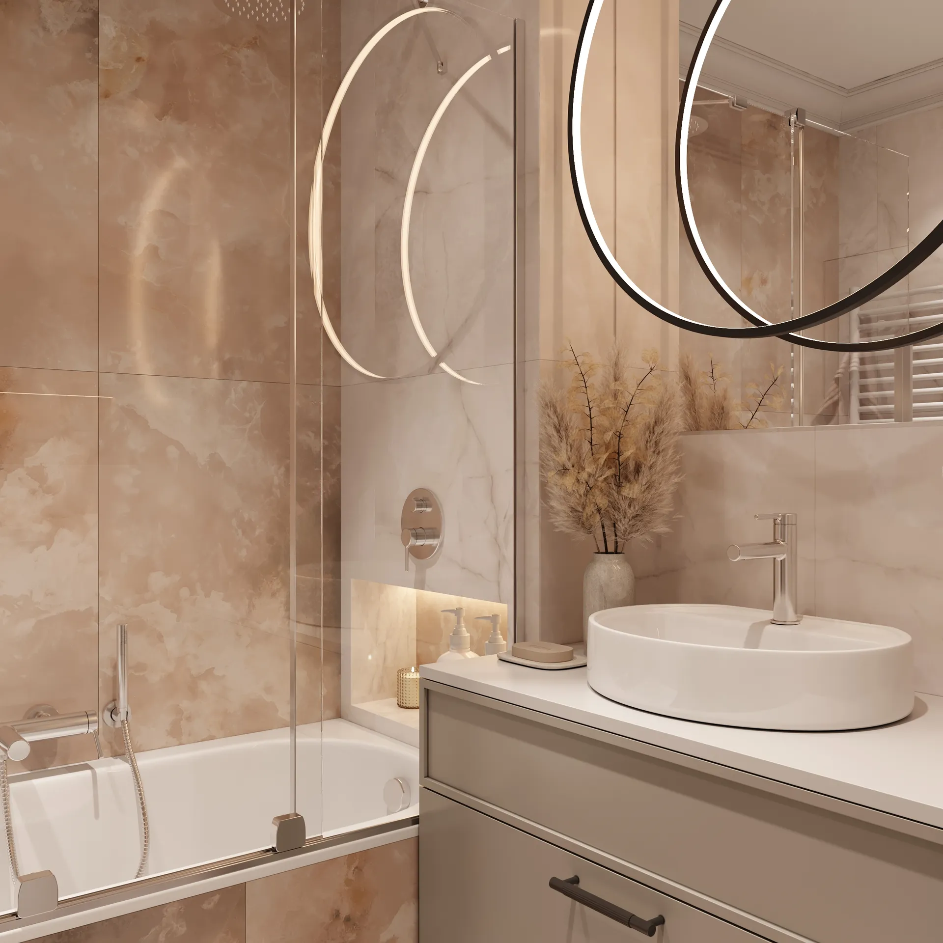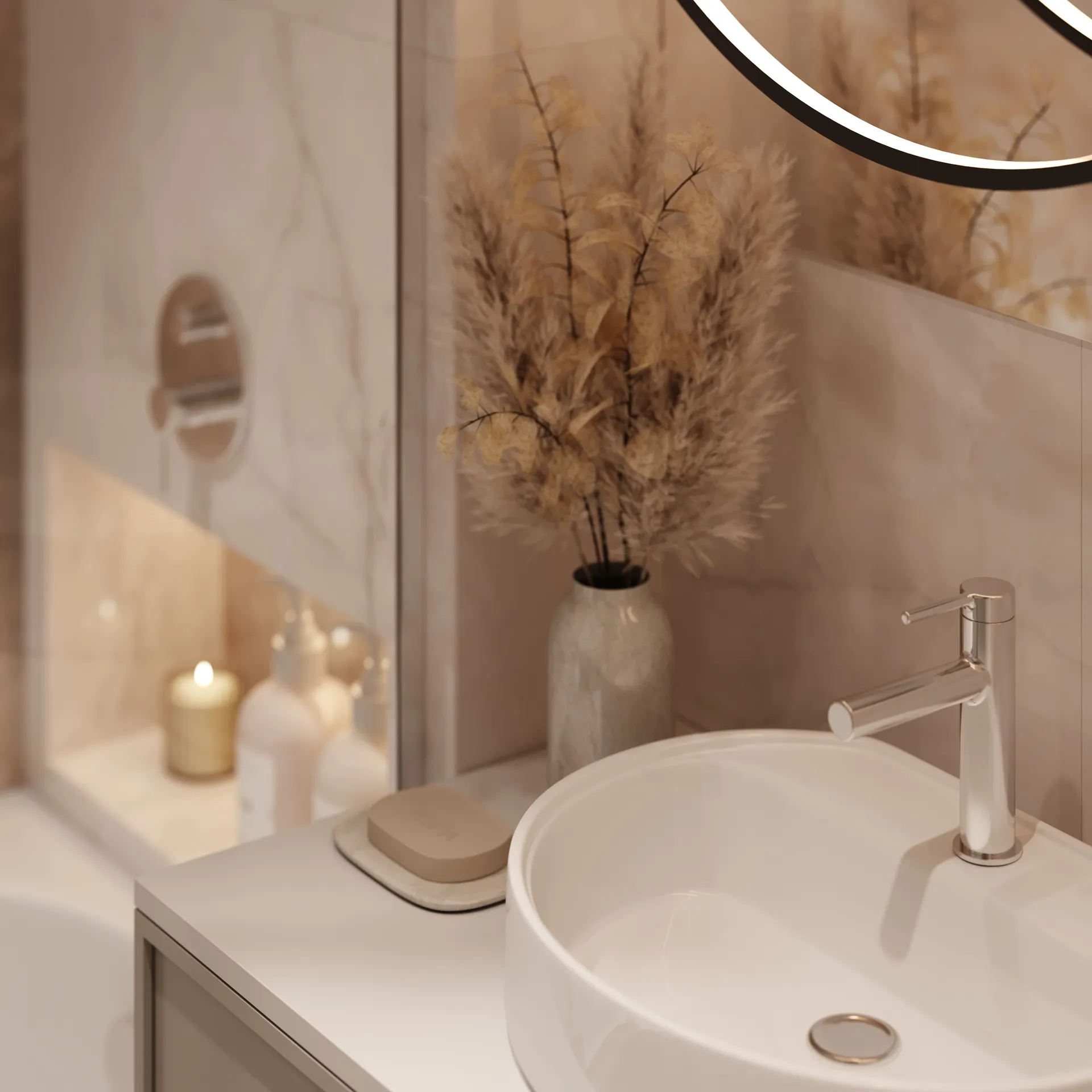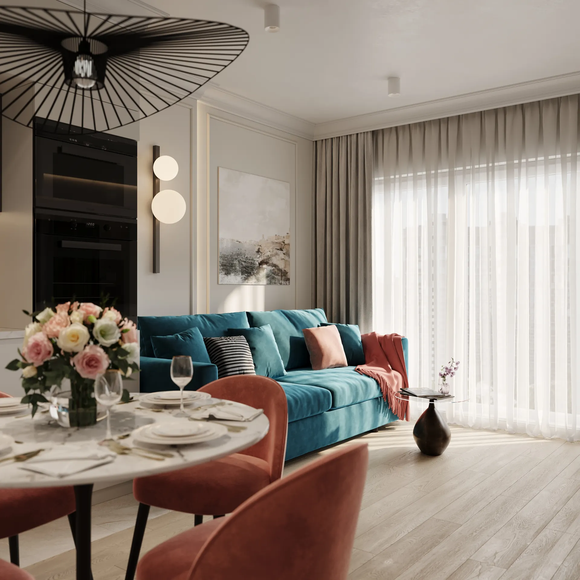 Całość utrzymana jest w stonowanej, ciepłej kolorystyce. Neutralne barwy, takie jak złamane biele, beże i szarości, stanowią tło dla wyrazistych akcentów kolorystycznych w postaci dodatków. Te mocniejsze elementy nadają wnętrzu indywidualny charakter i świeżość.