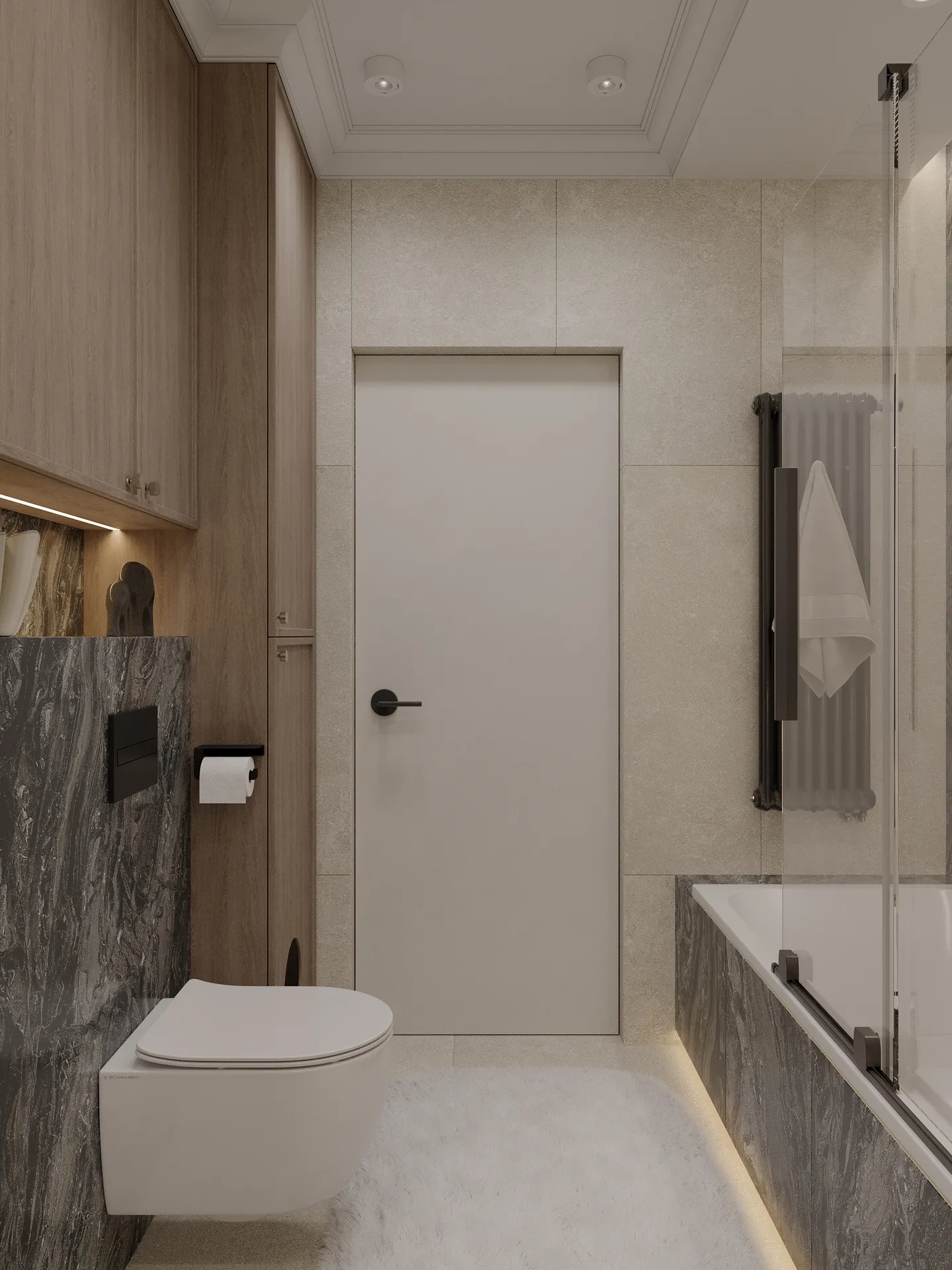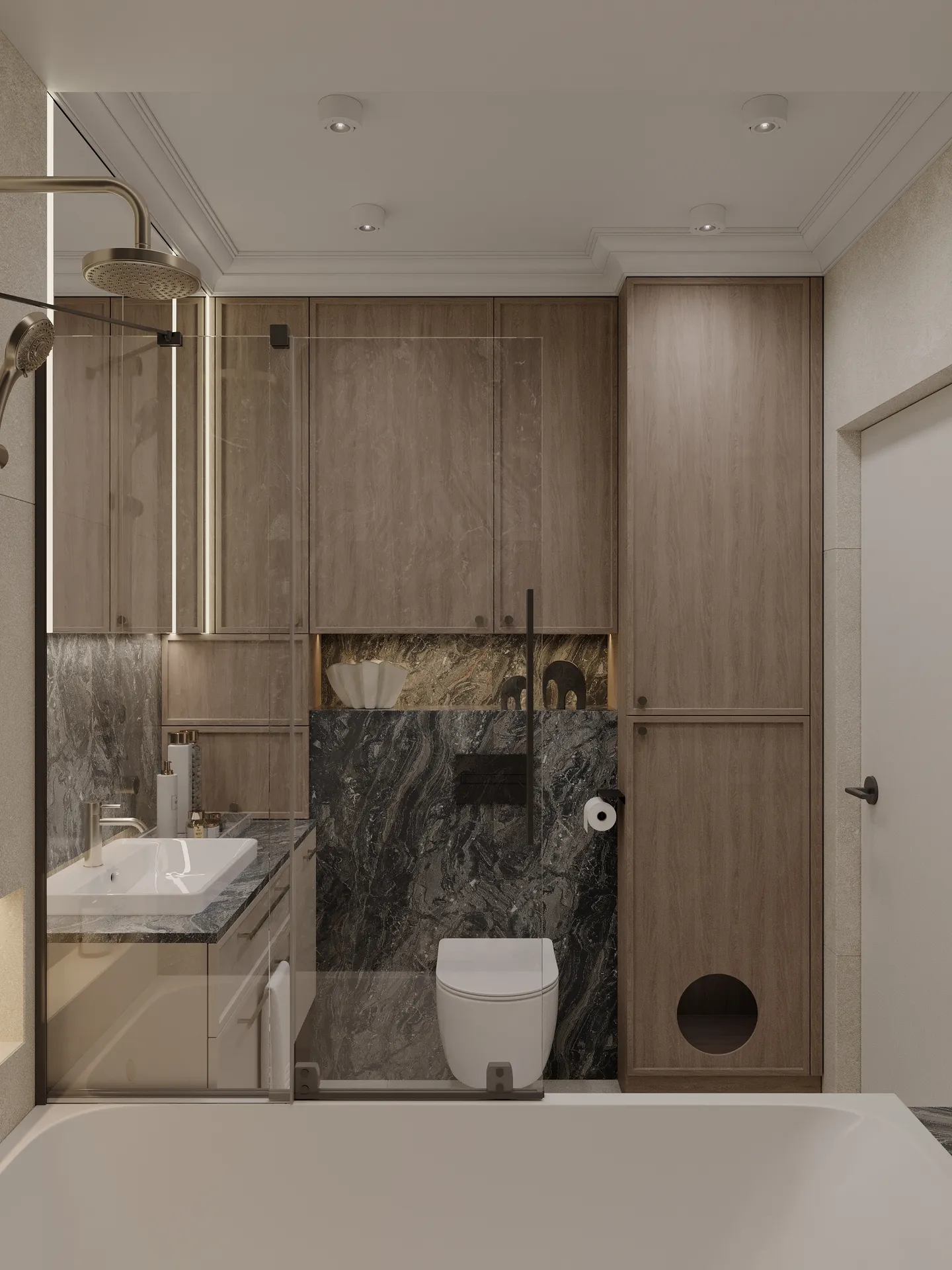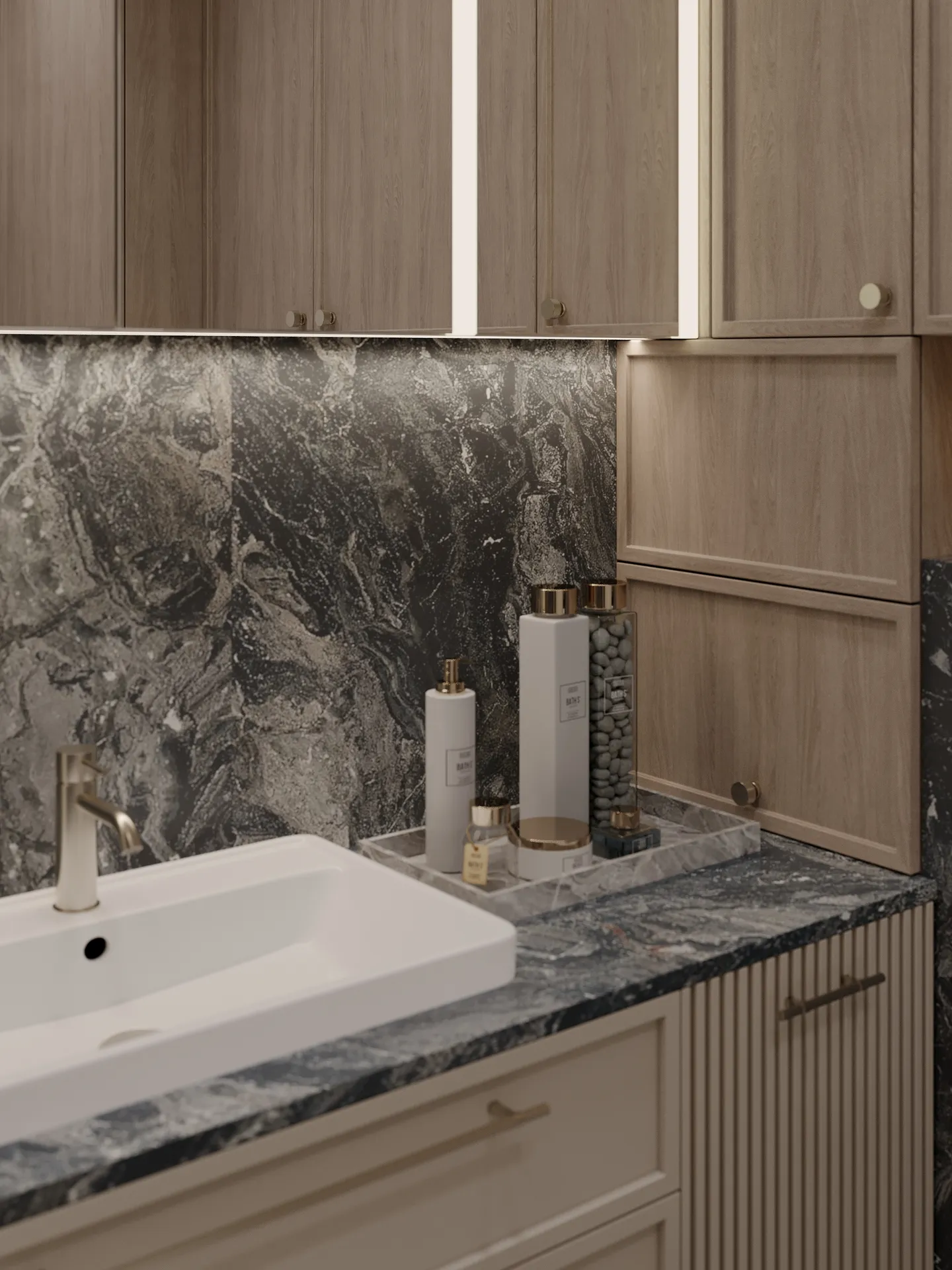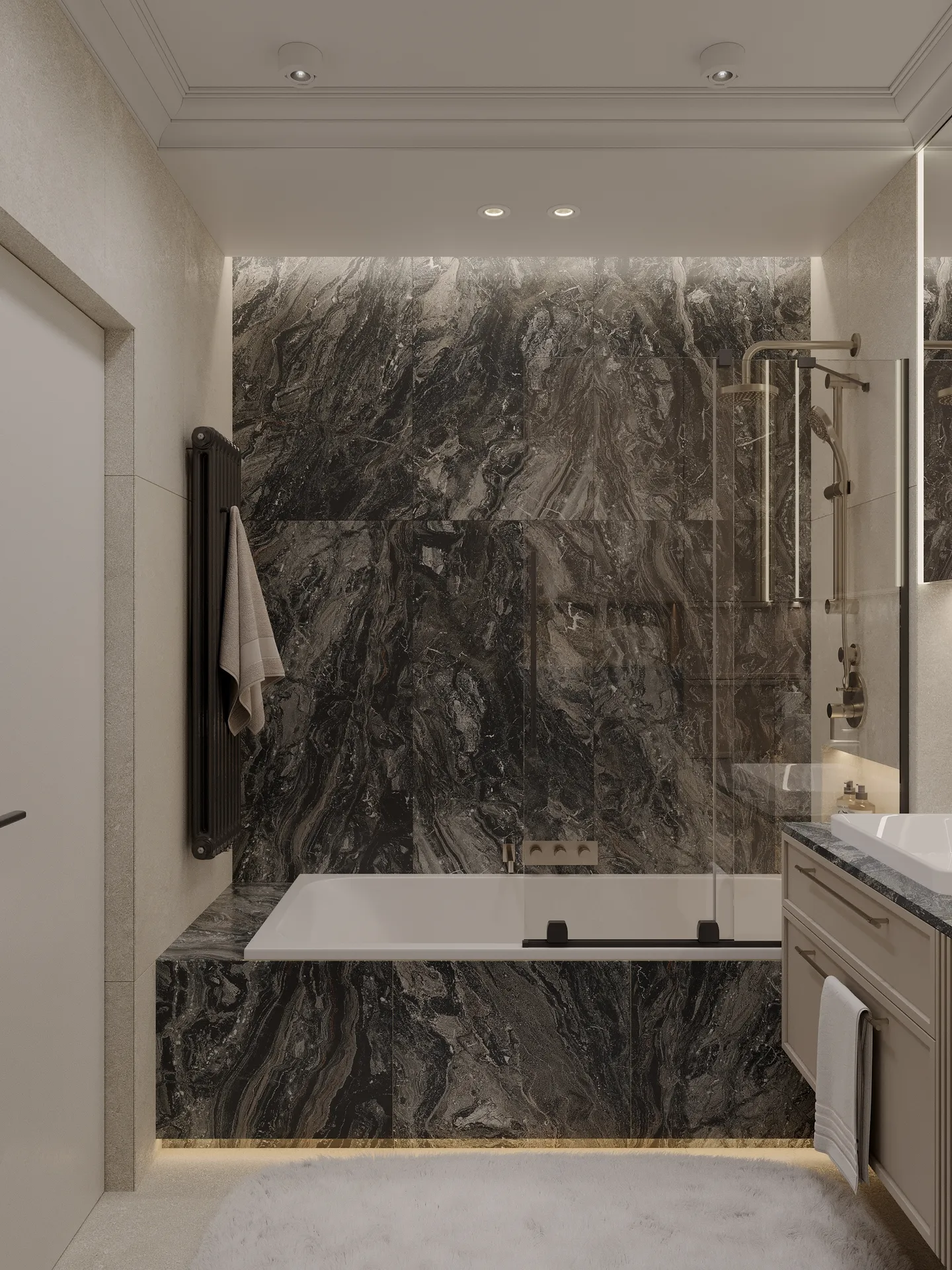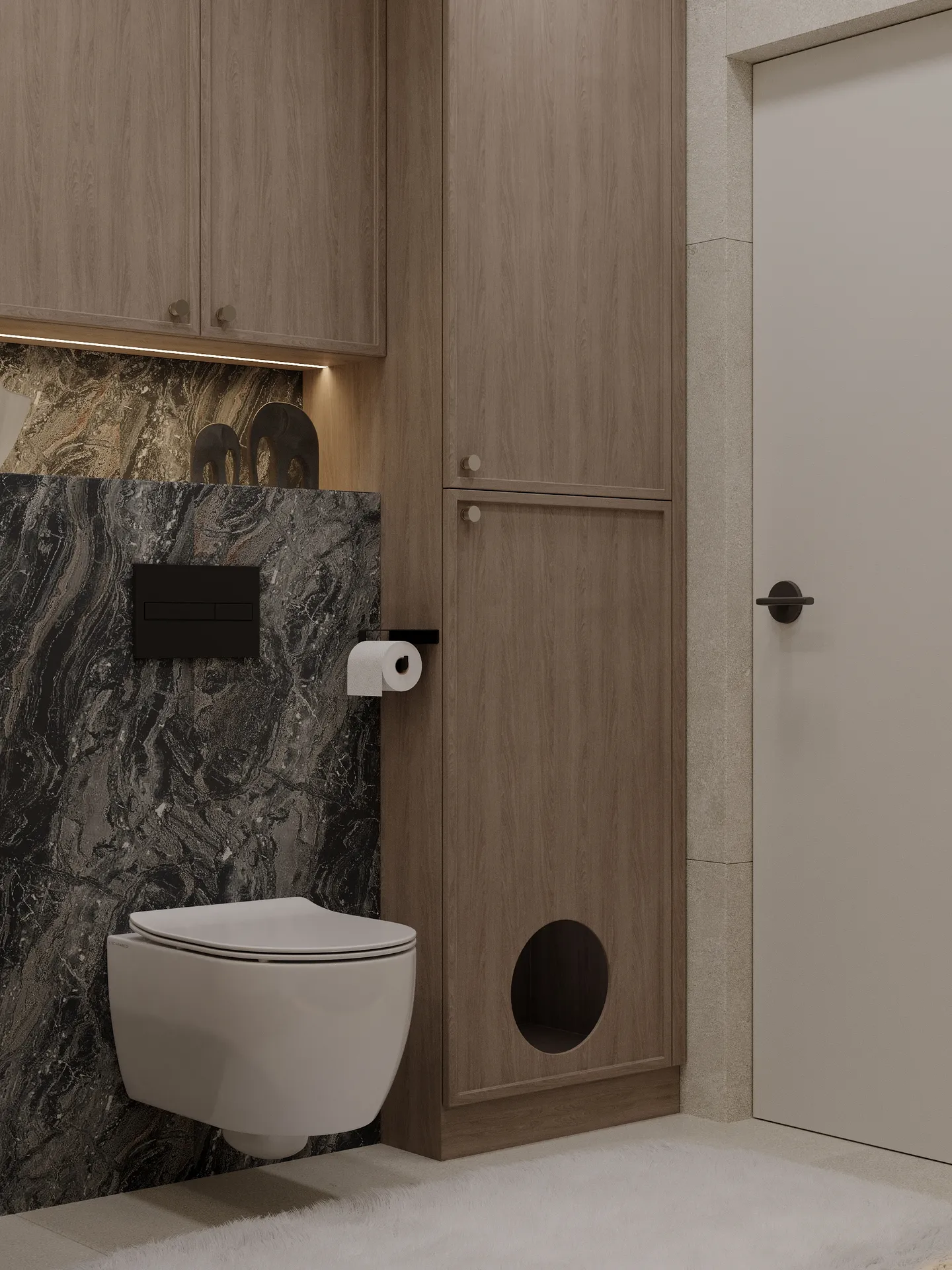 Łazienka z kamiennymi powierzchniami i nowoczesną armaturą dopełnia całości, łącząc estetykę z codzienną wygodą.