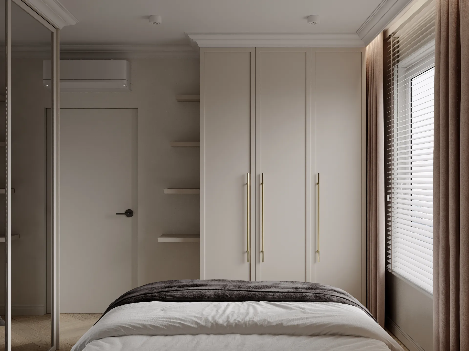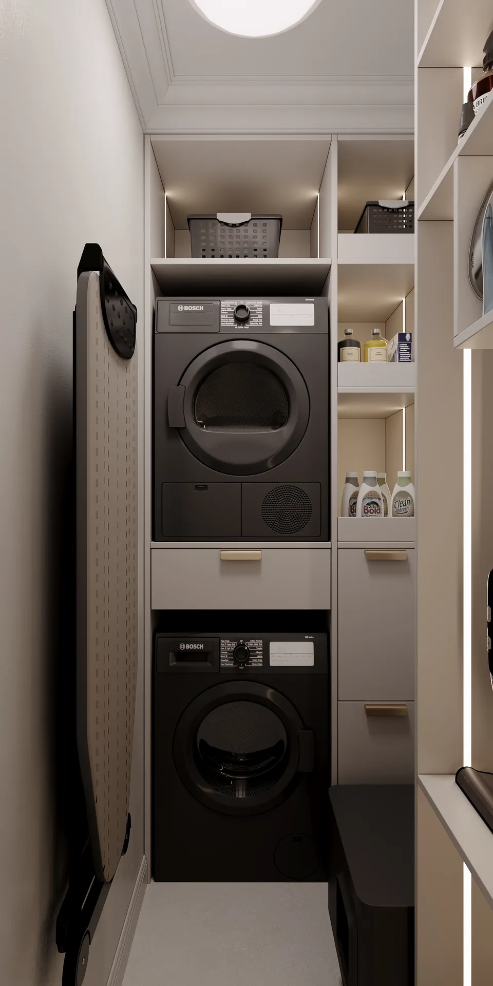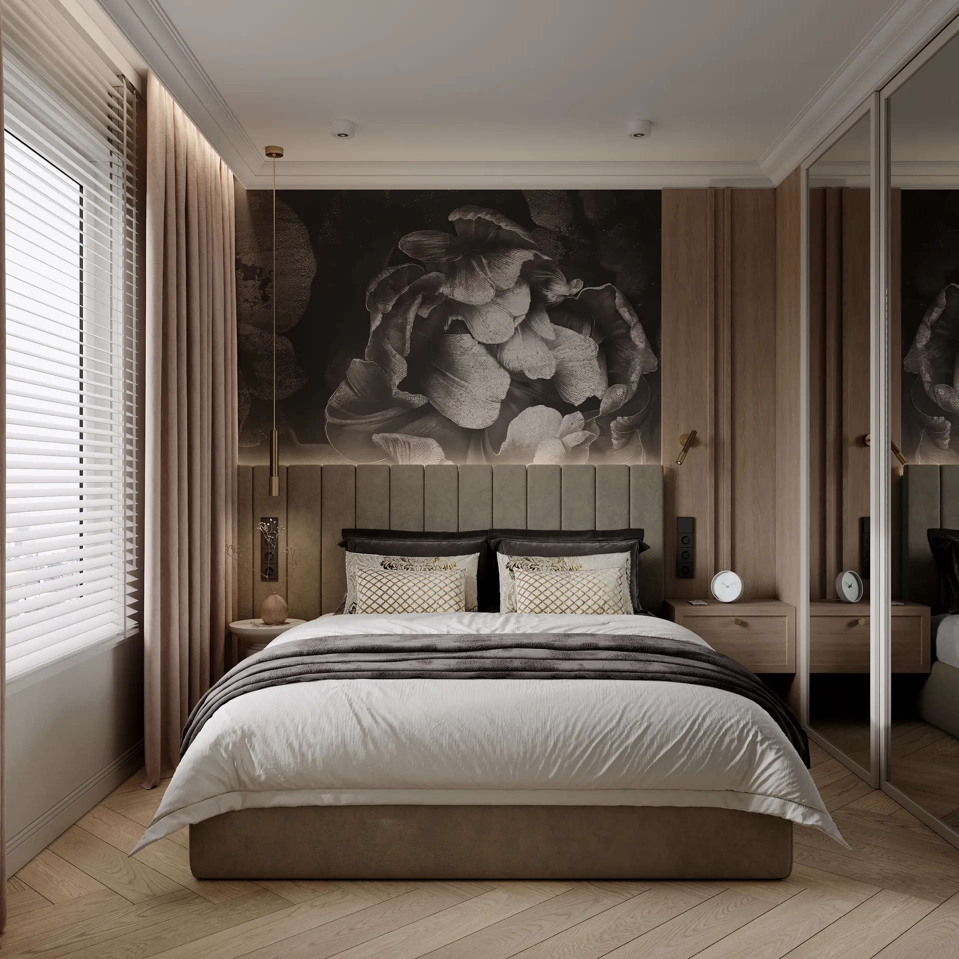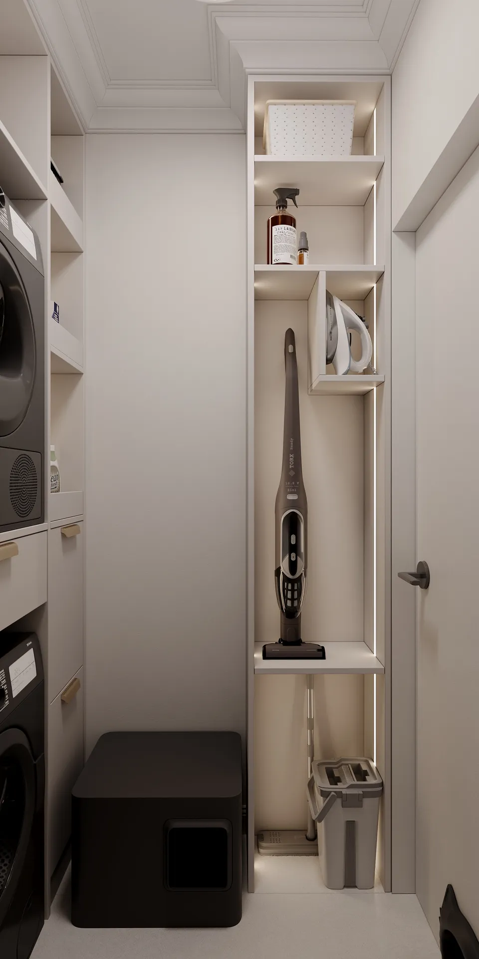 Sypialnia to strefa komfortu i spokoju – z elegancką tapetą, praktyczną zabudową i wydzieloną przestrzenią do przechowywania. Obok znajduje się kameralny schowek z pralnią – małe, ale bardzo funkcjonalne pomieszczenie.
