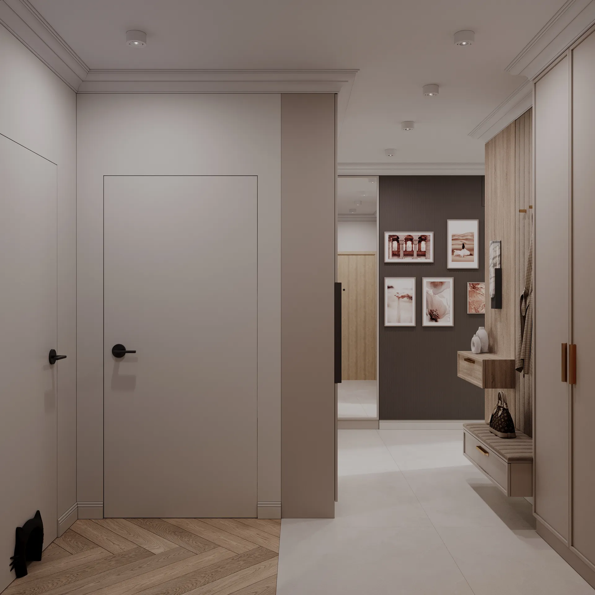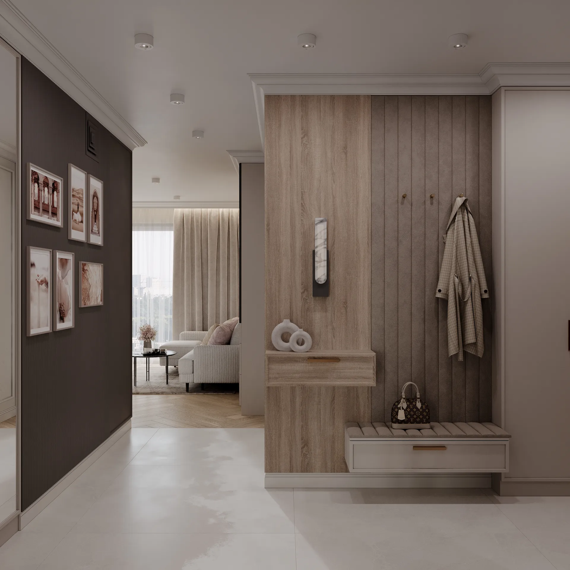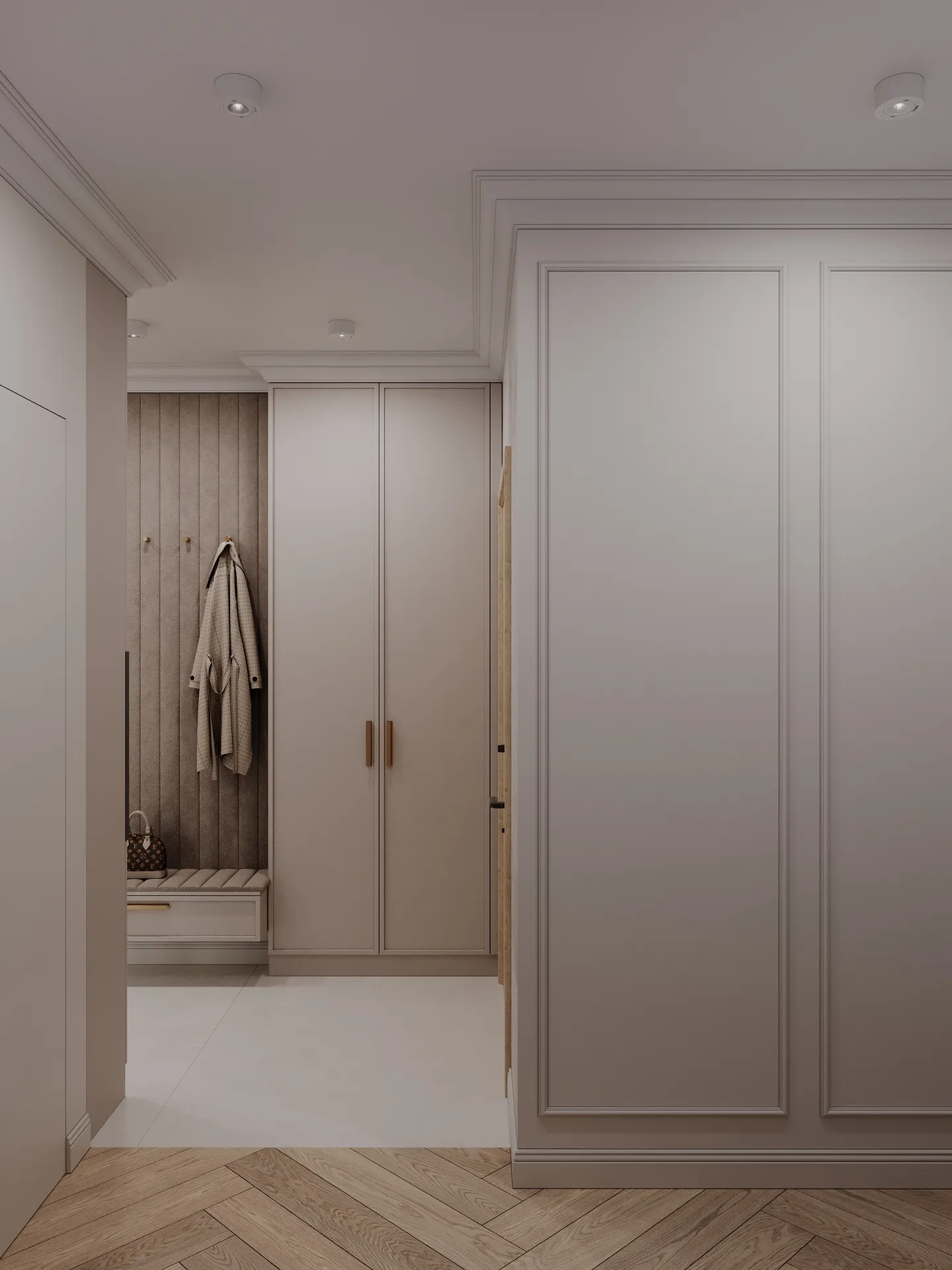 Projekt wnętrza modern classic Warszawa powstał z myślą o młodym małżeństwie z czwórką kotów. Całość utrzymana jest w subtelnych odcieniach beżu, uzupełnionych wyraźnymi, kontrastującymi detalami, które nadają przestrzeni wyrazistego, ale harmonijnego charakteru.