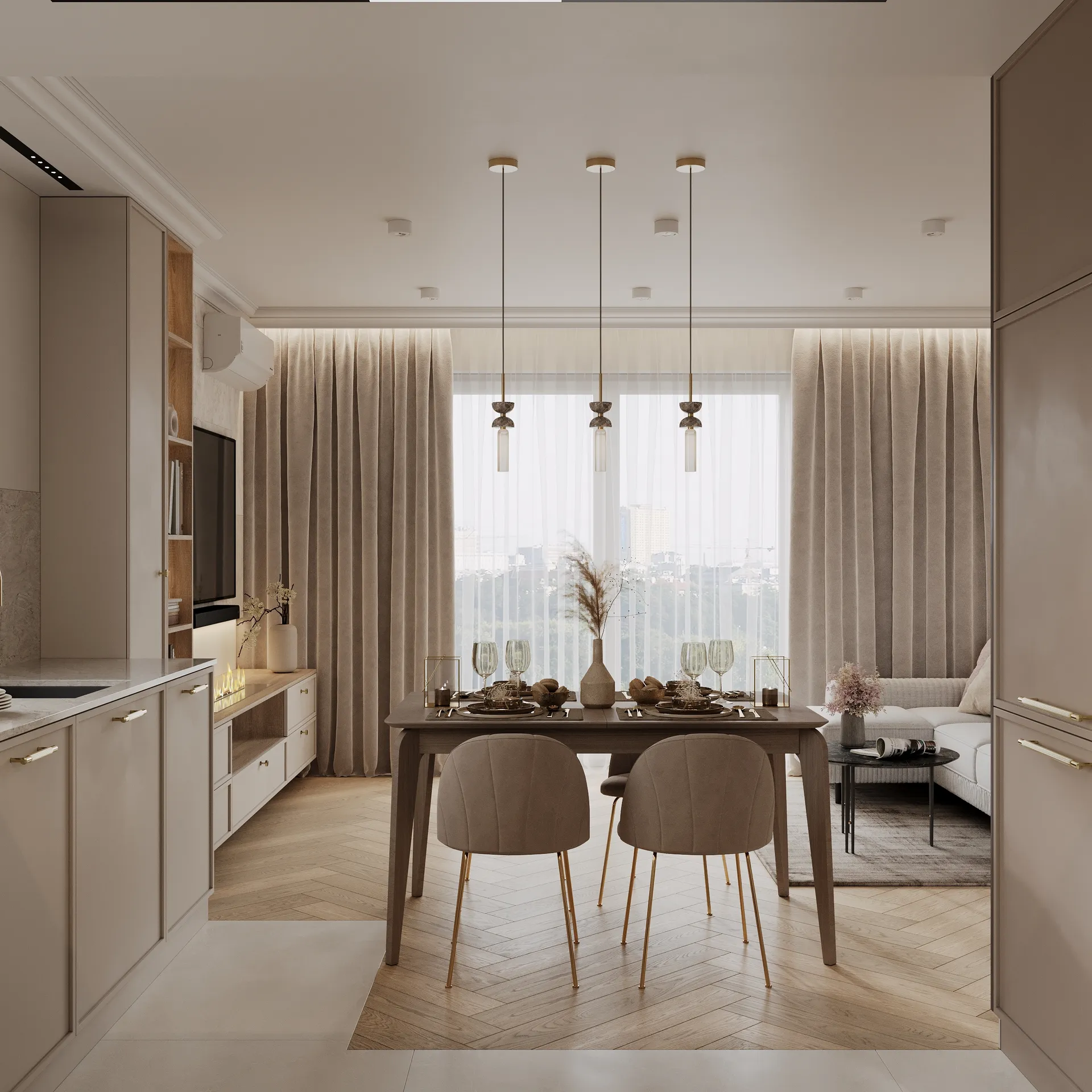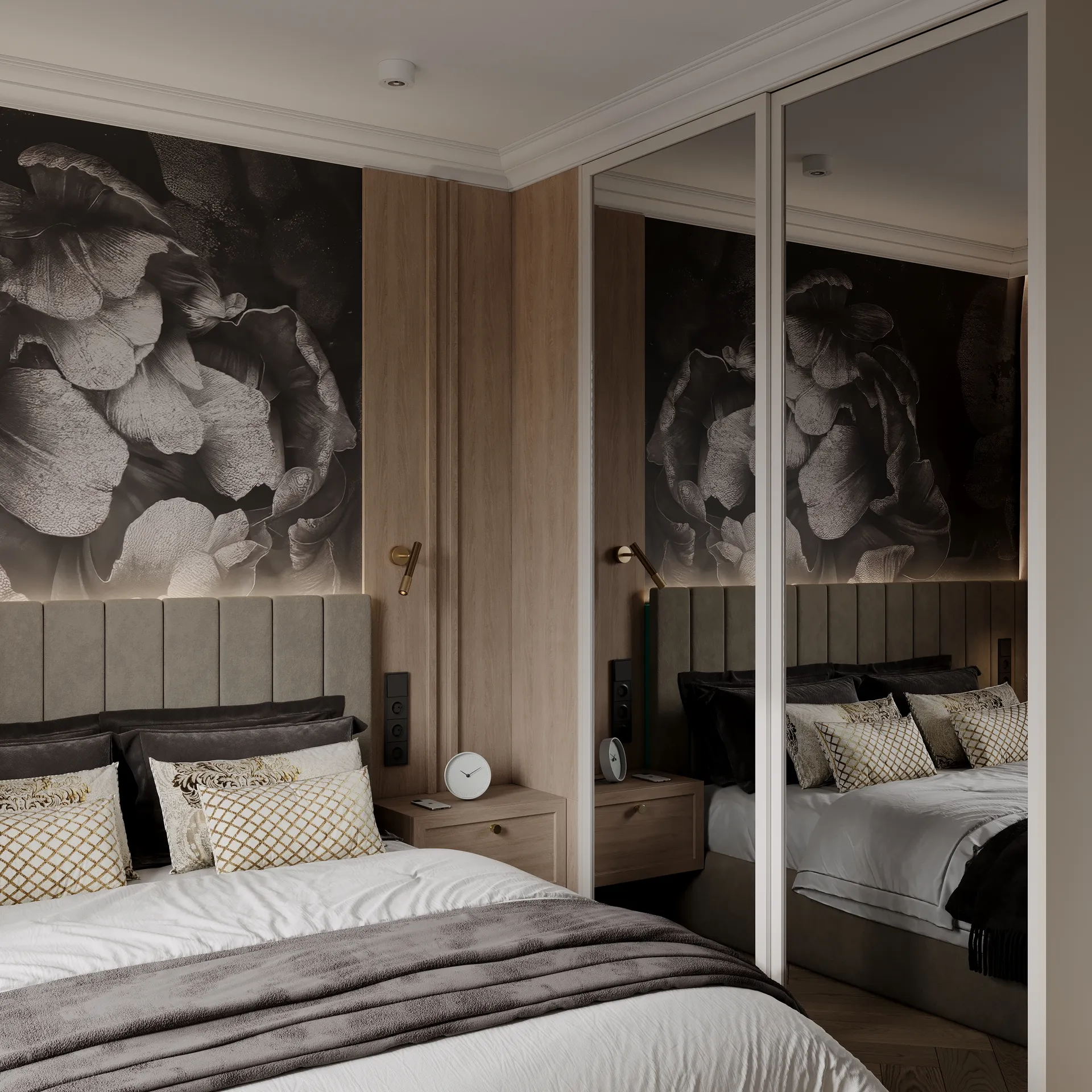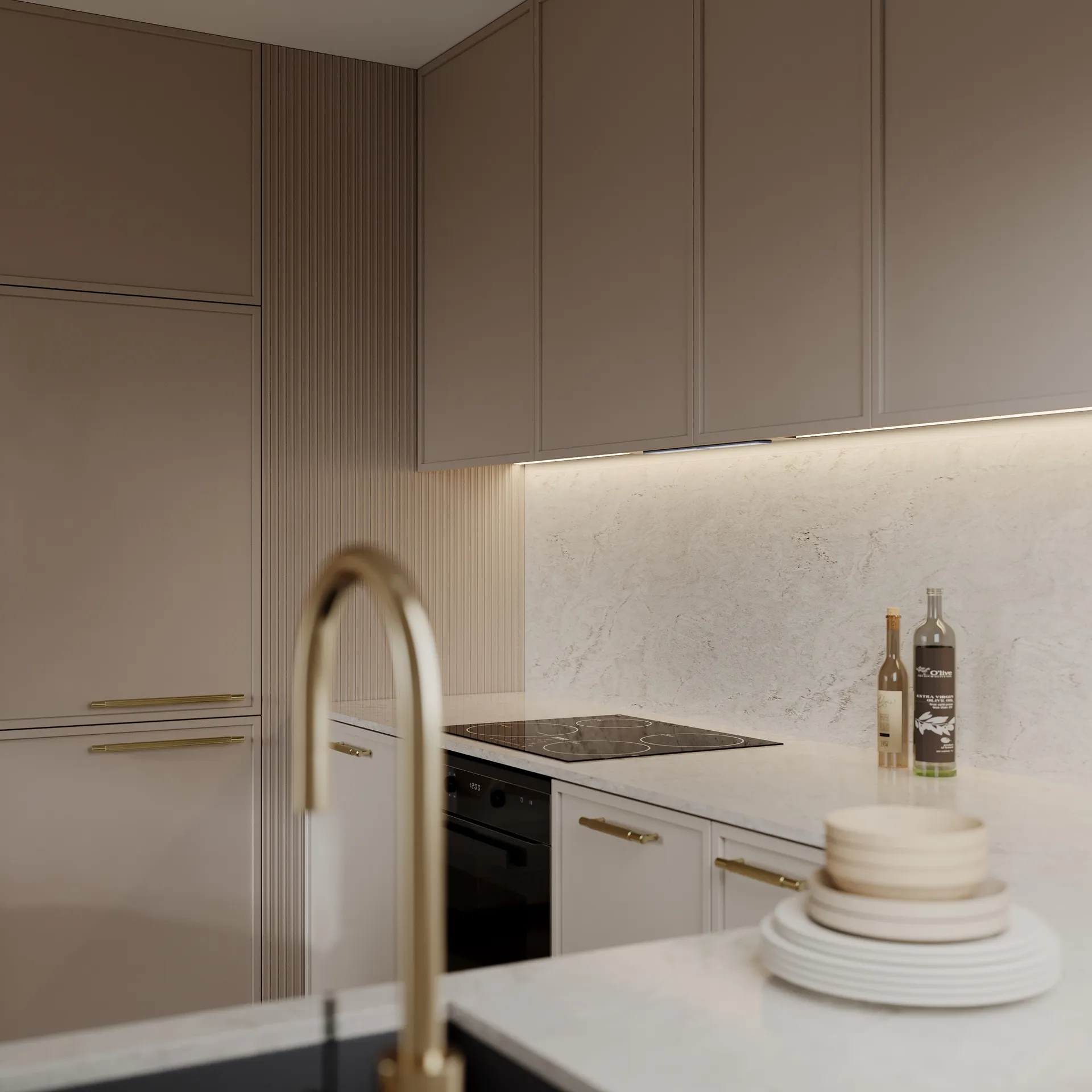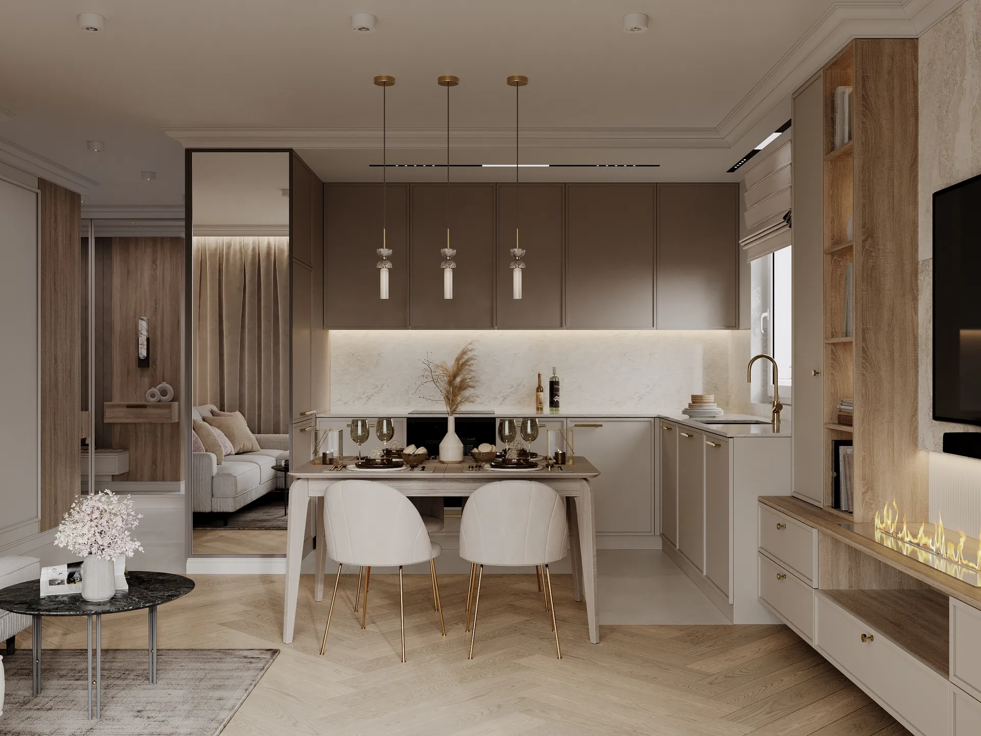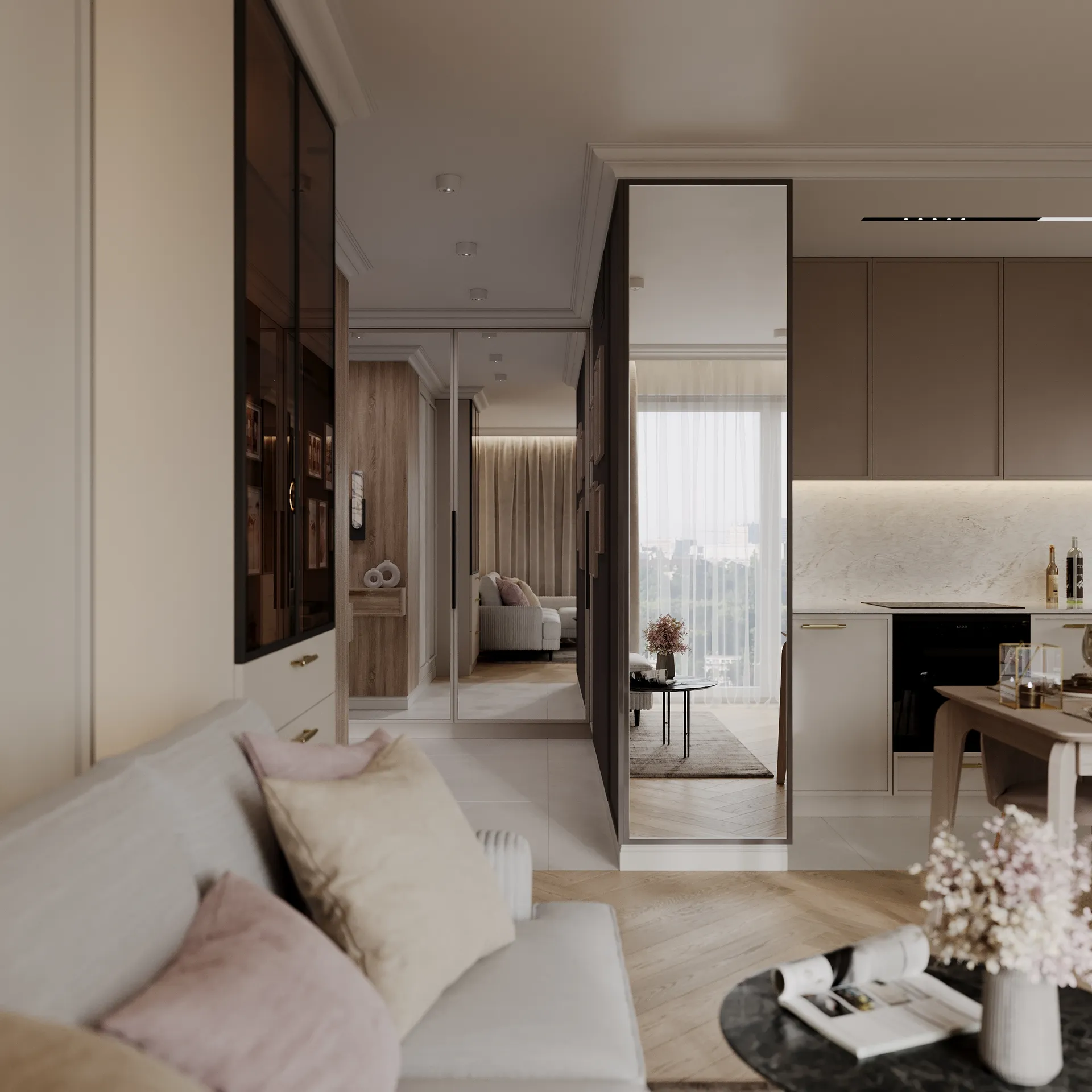 Kuchnia została zaprojektowana z myślą o funkcjonalności, a delikatne lustra i zabudowa meblowa spójnie łączą się z resztą wnętrza, nadając mu elegancki rytm.