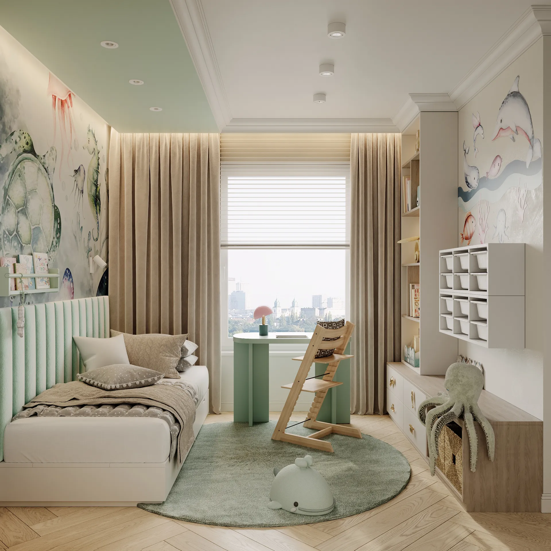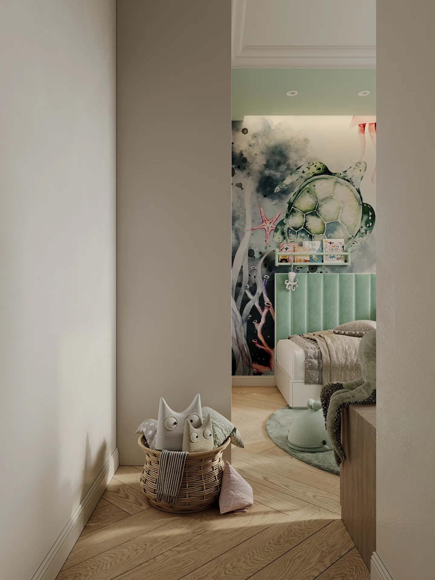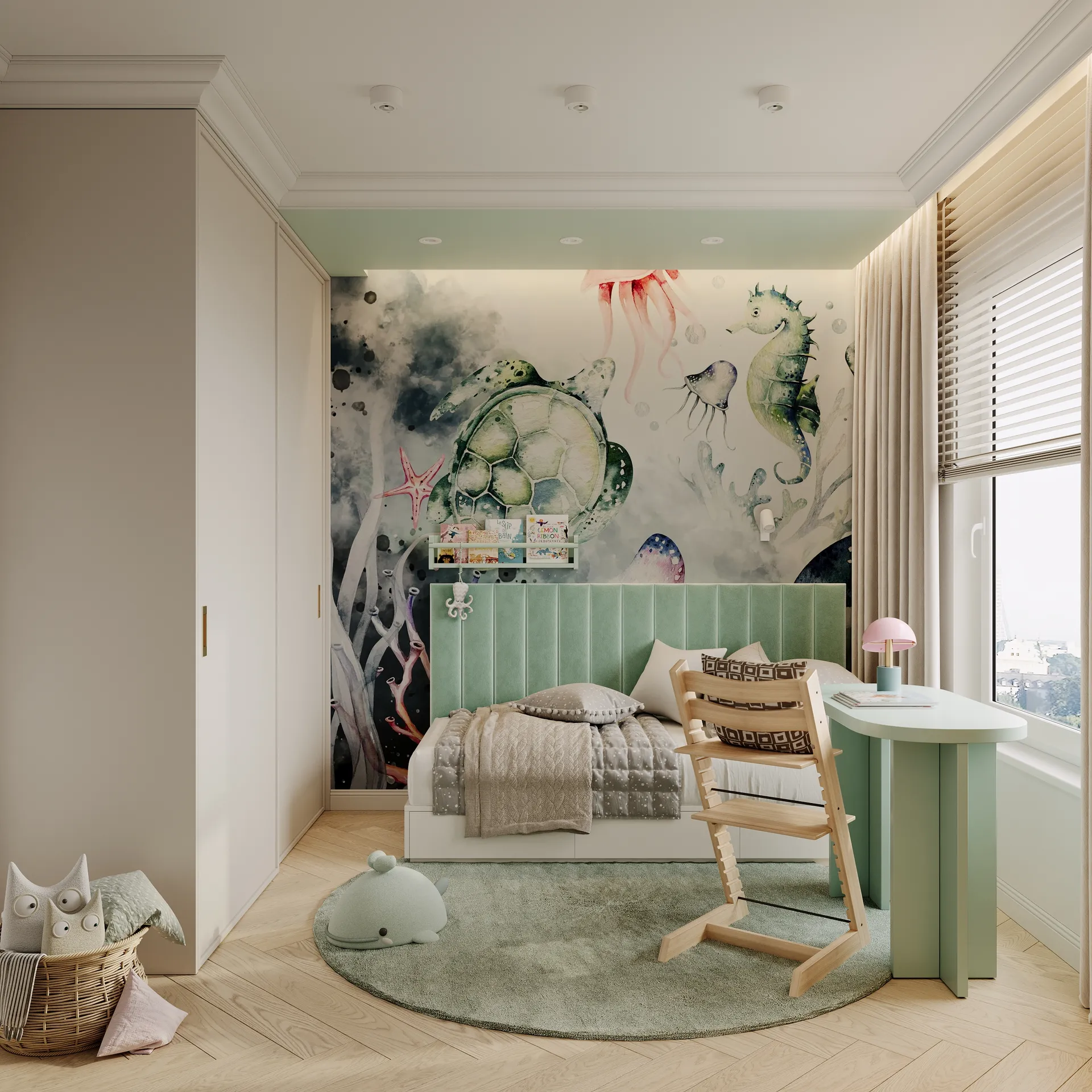Pokój dziecięcy utrzymany jest w mięcie, z wyjątkową tapetą przedstawiającą głębiny morskie – tworzy magiczny klimat dla najmłodszych domowników.