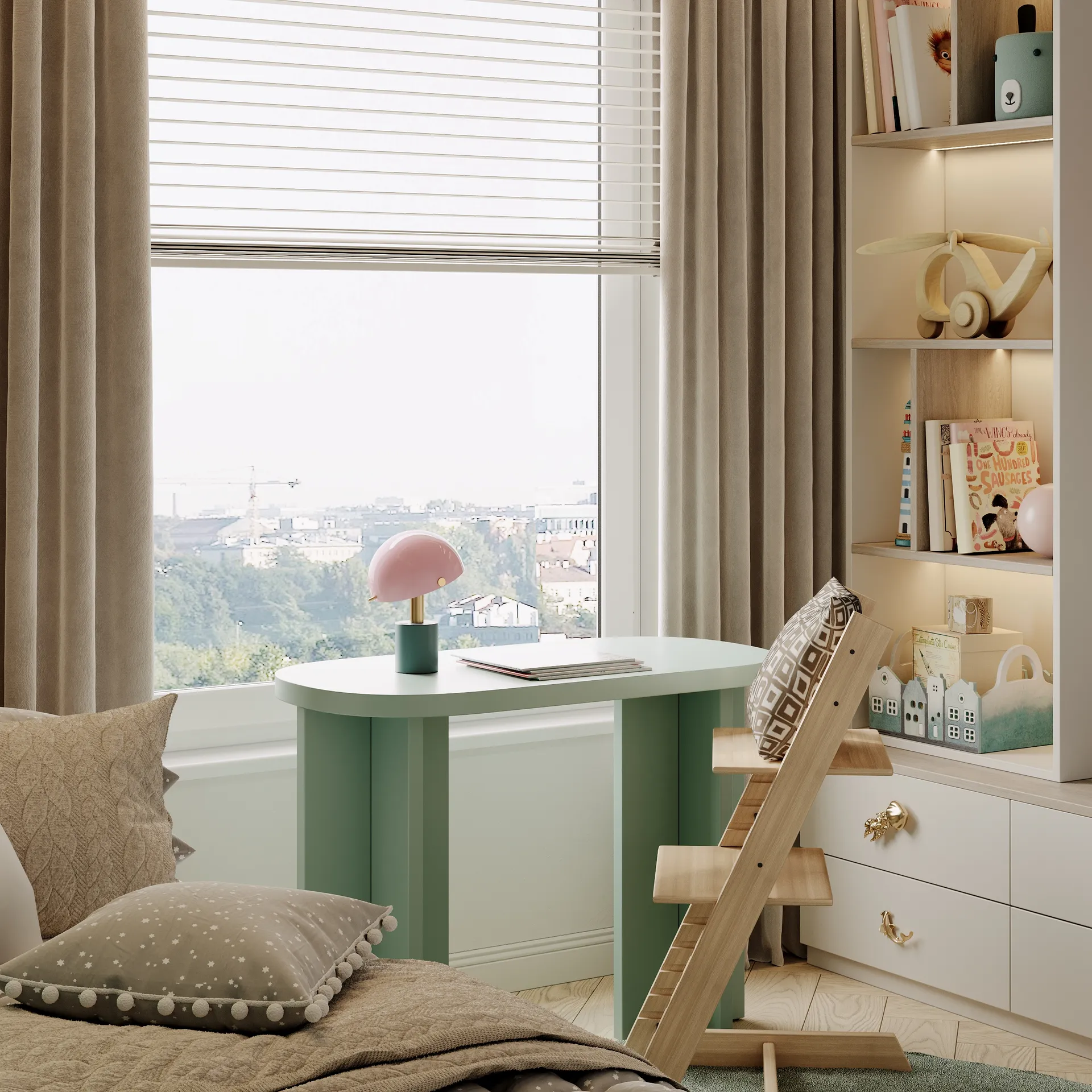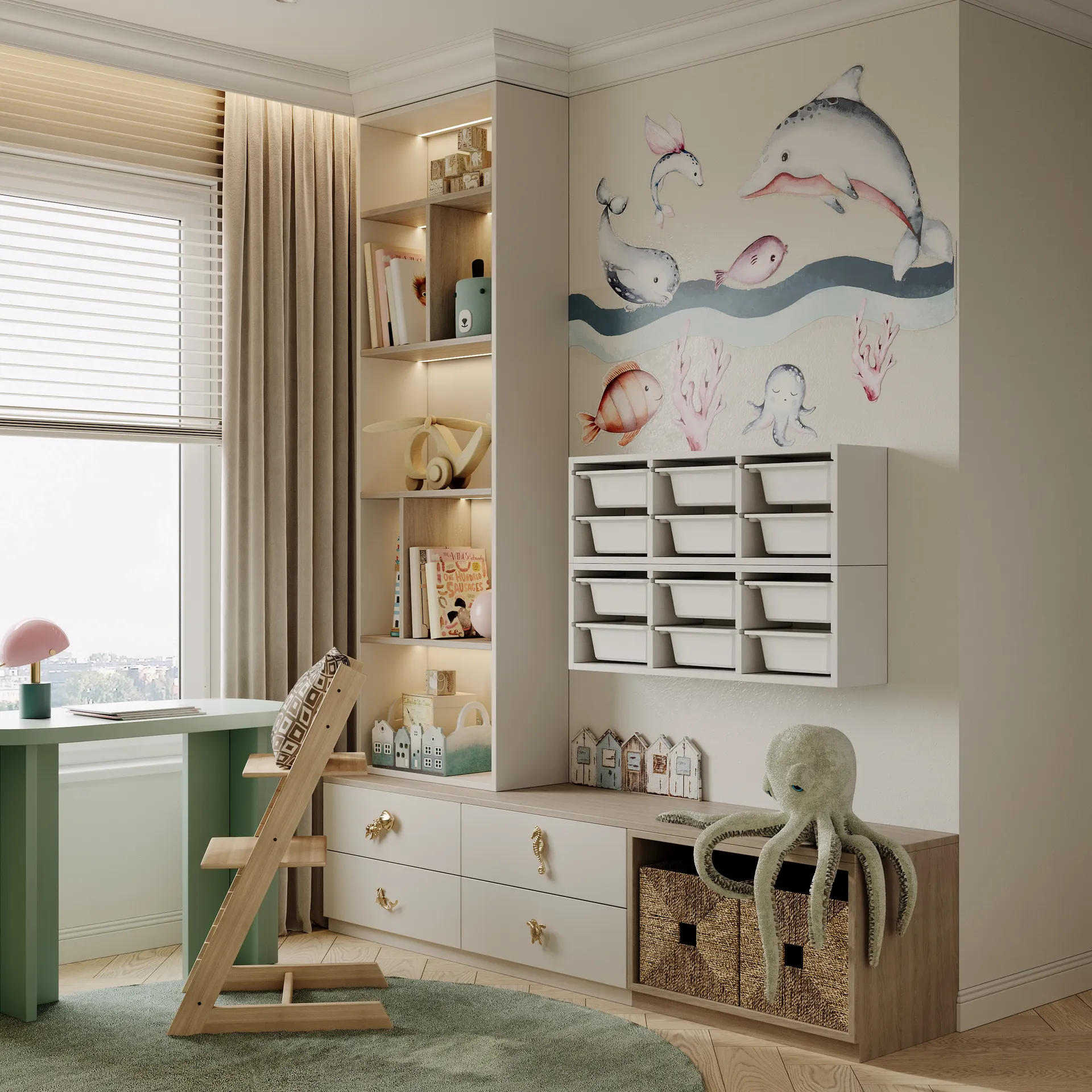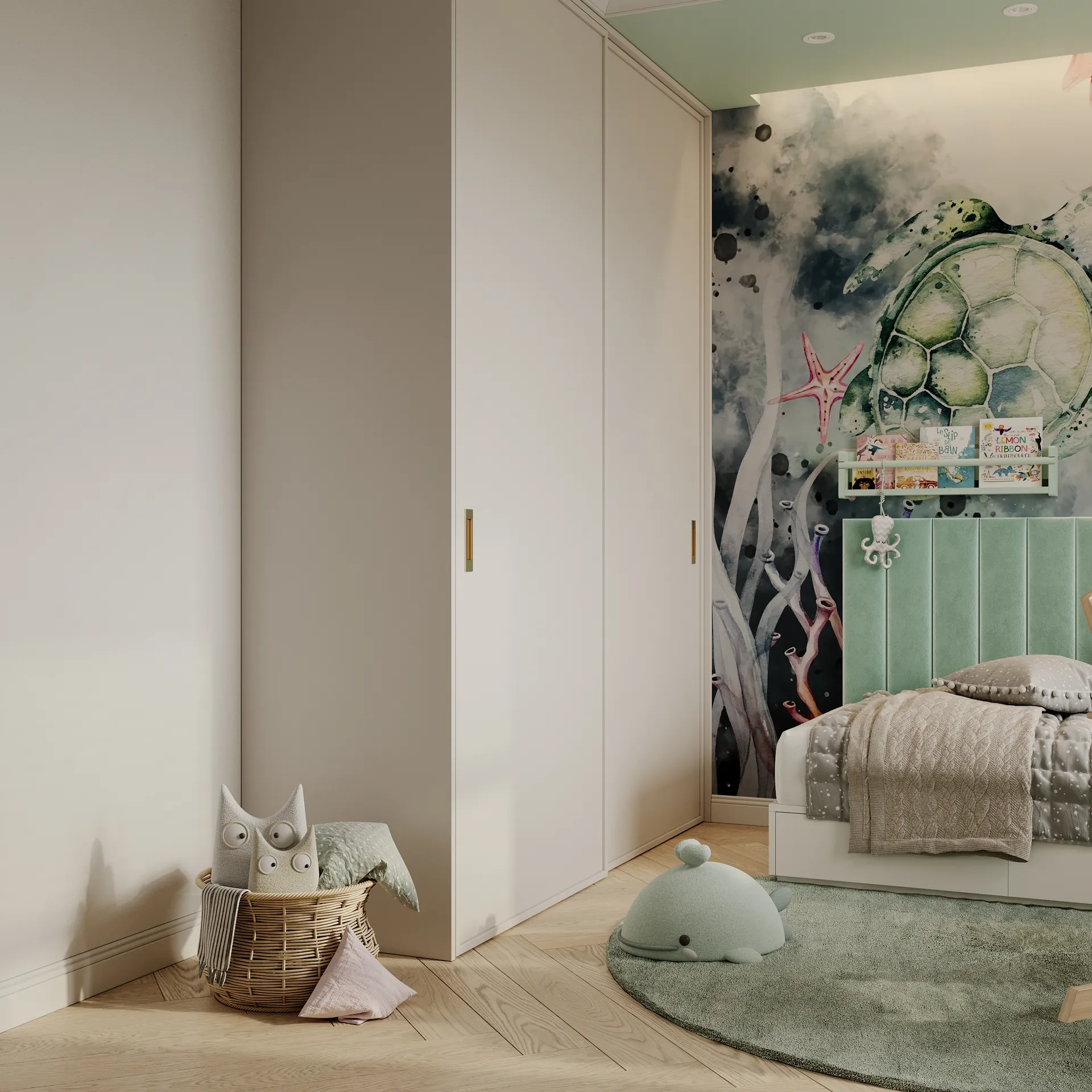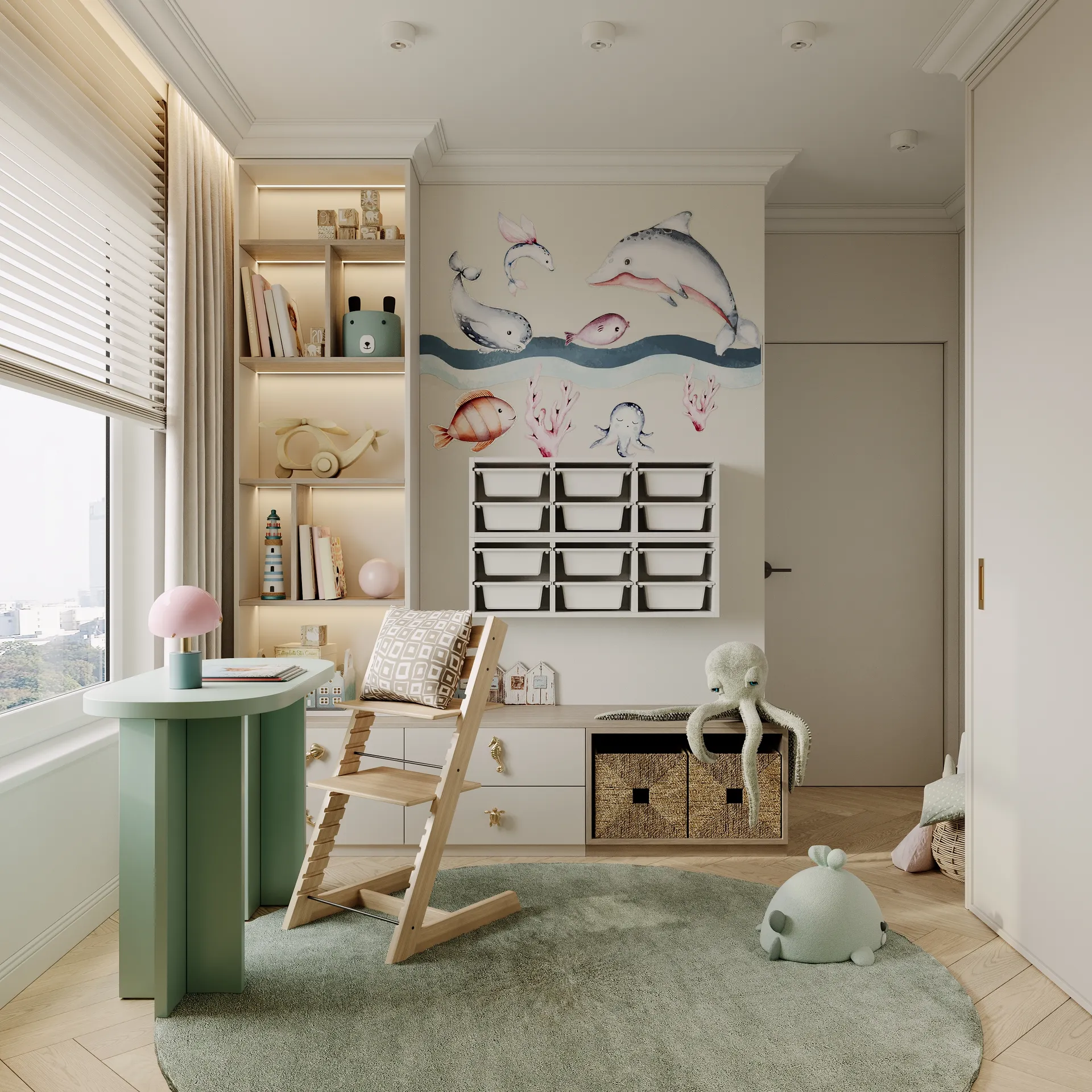 Pokój dziecięcy utrzymany jest w mięcie, z wyjątkową tapetą przedstawiającą głębiny morskie – tworzy magiczny klimat dla najmłodszych domowników.