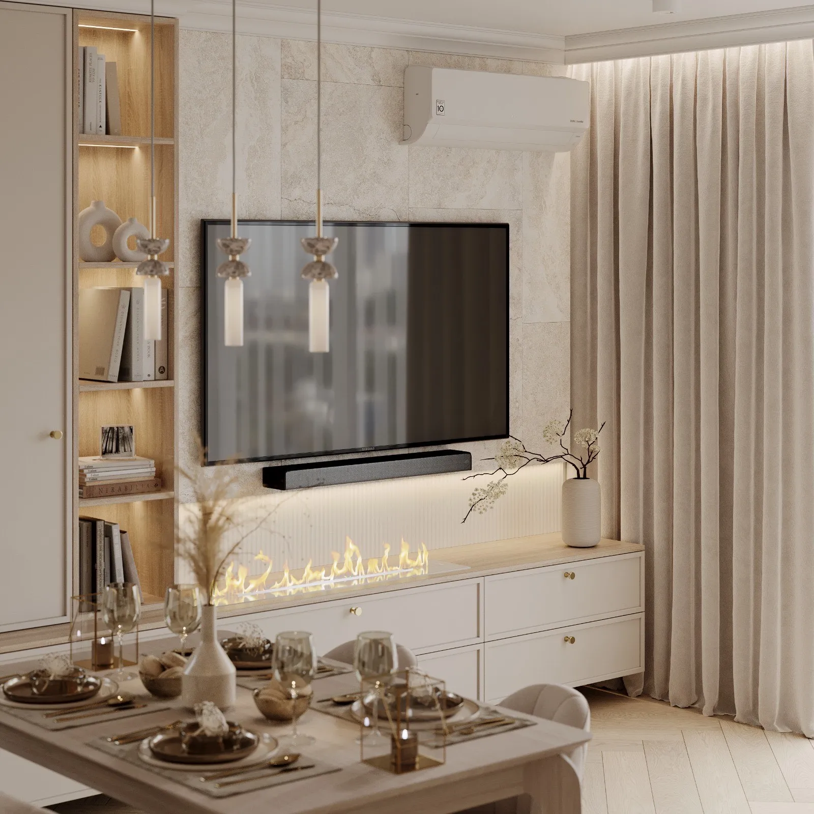 Projekt wnętrza modern classic Warszawa – beżowa elegancja z kontrastami i kominkiem pod TV