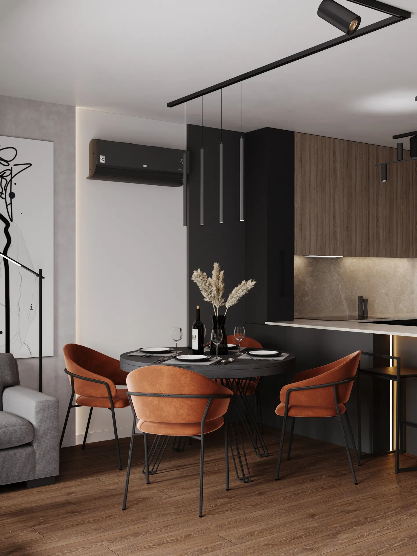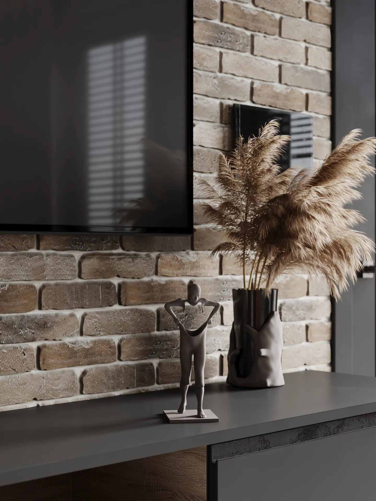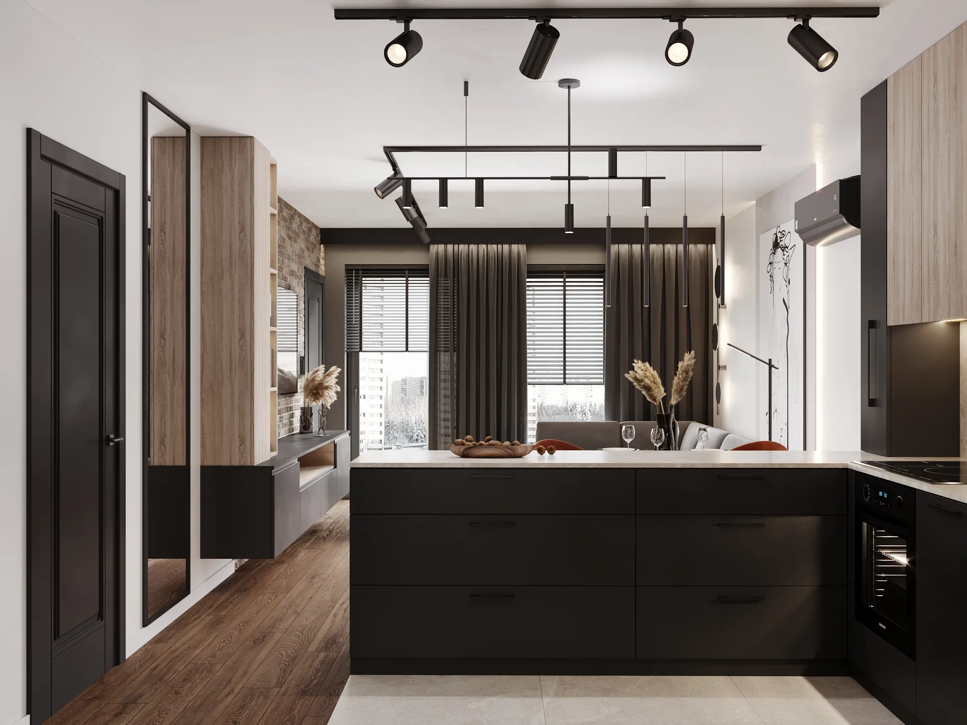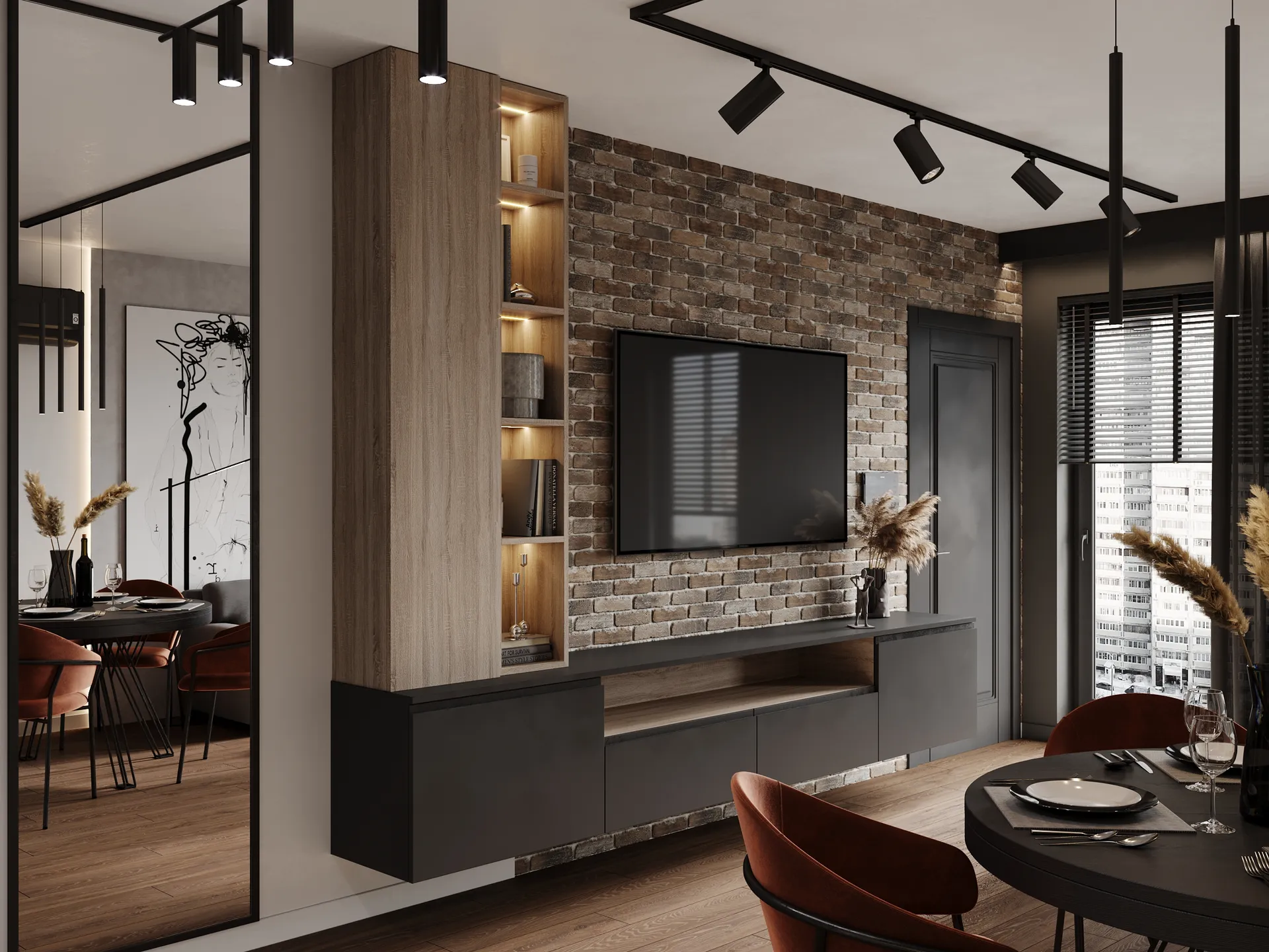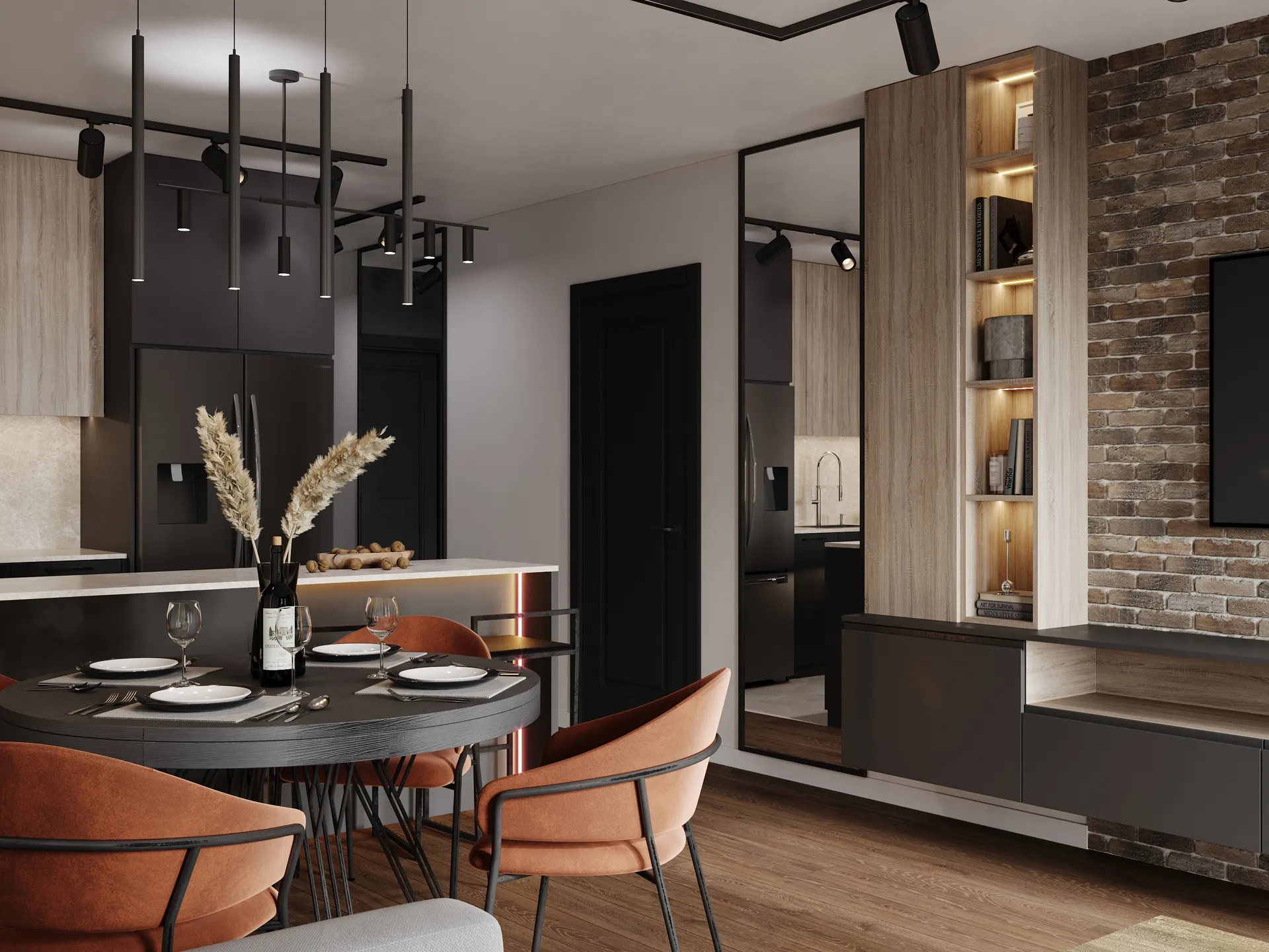 60-metrowe mieszkanie w stylu soft loftu, zaprojektowane dla pary, zlokalizowane pod Warszawą. We wnętrzu dominują ciemne dekory, cegła, beton i głęboka kolorystyka – od ciemnej podłogi po zabudowę meblową. Salon z aneksem mieści rozkładany stół, duży narożnik i funkcjonalną kuchnię z dodatkowymi miejscami do siedzenia. Całość uzupełniają sypialnia z garderobą, łazienka i domowe biuro, utrzymane w tej samej estetyce dla pełnej spójności projektu.