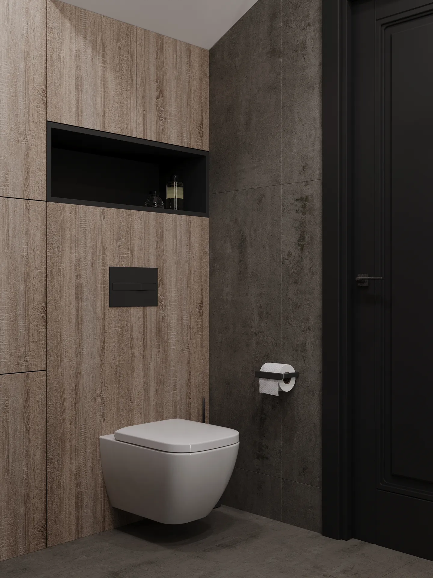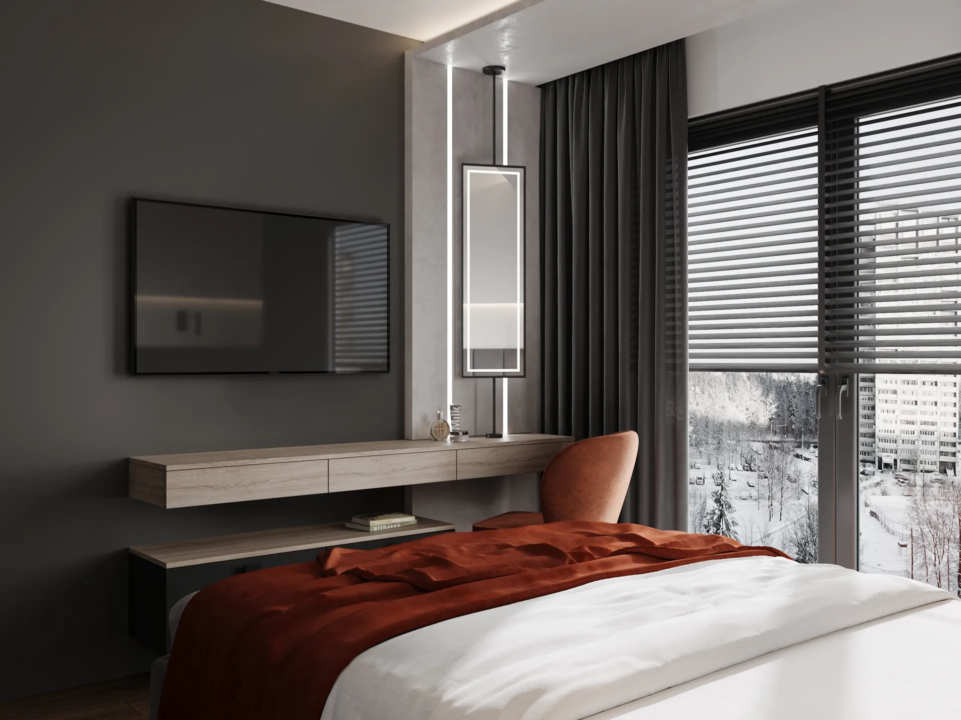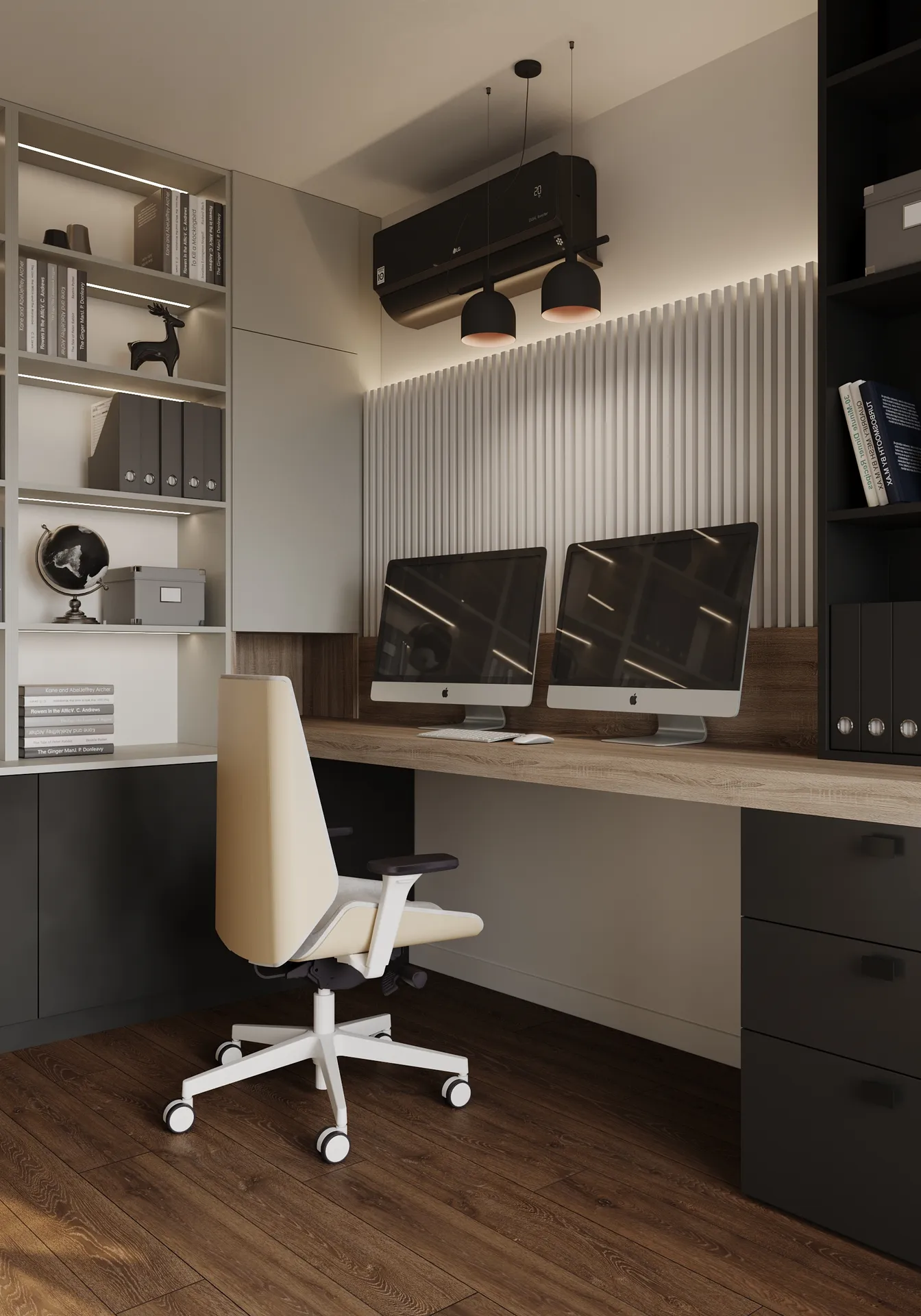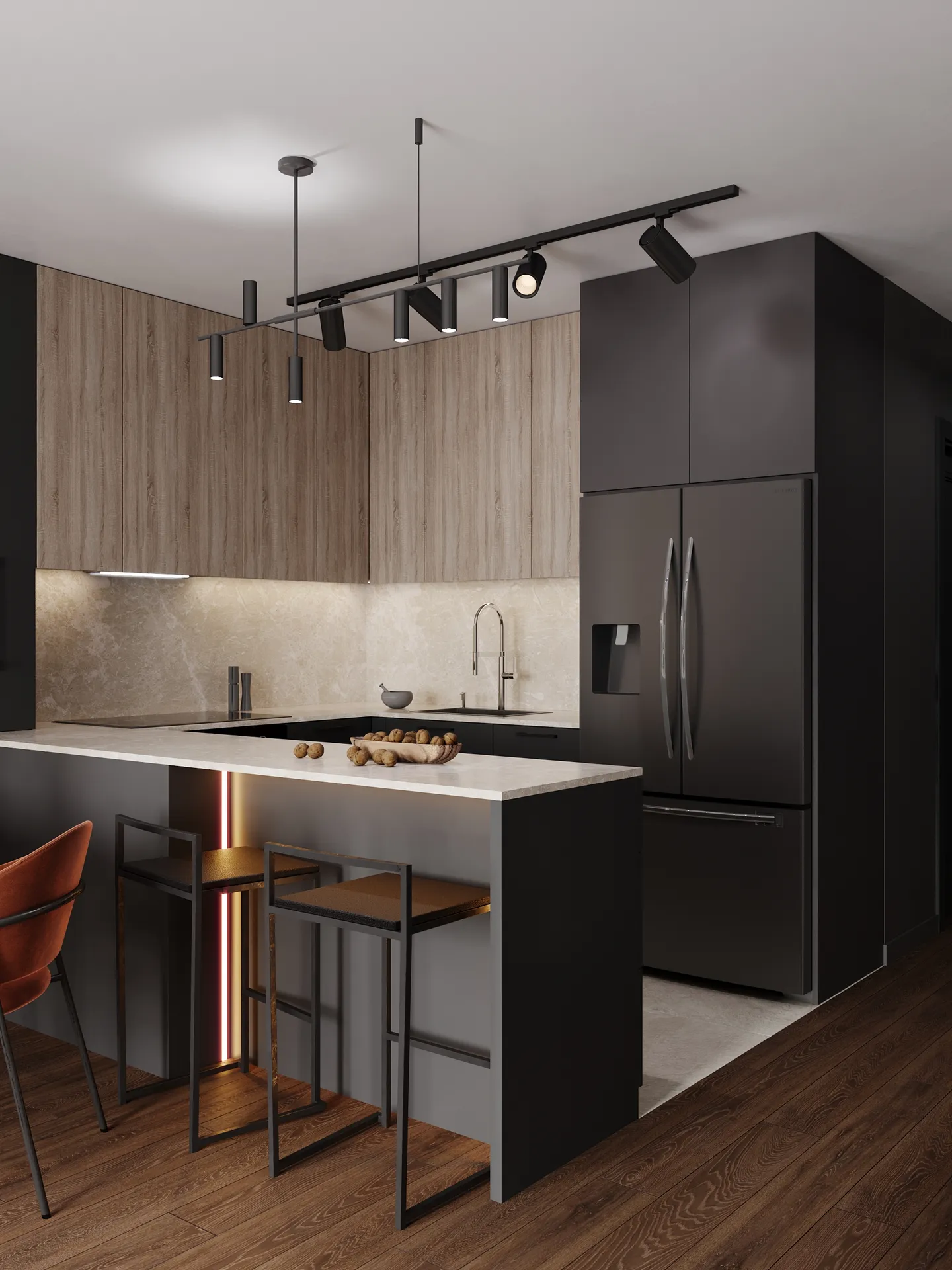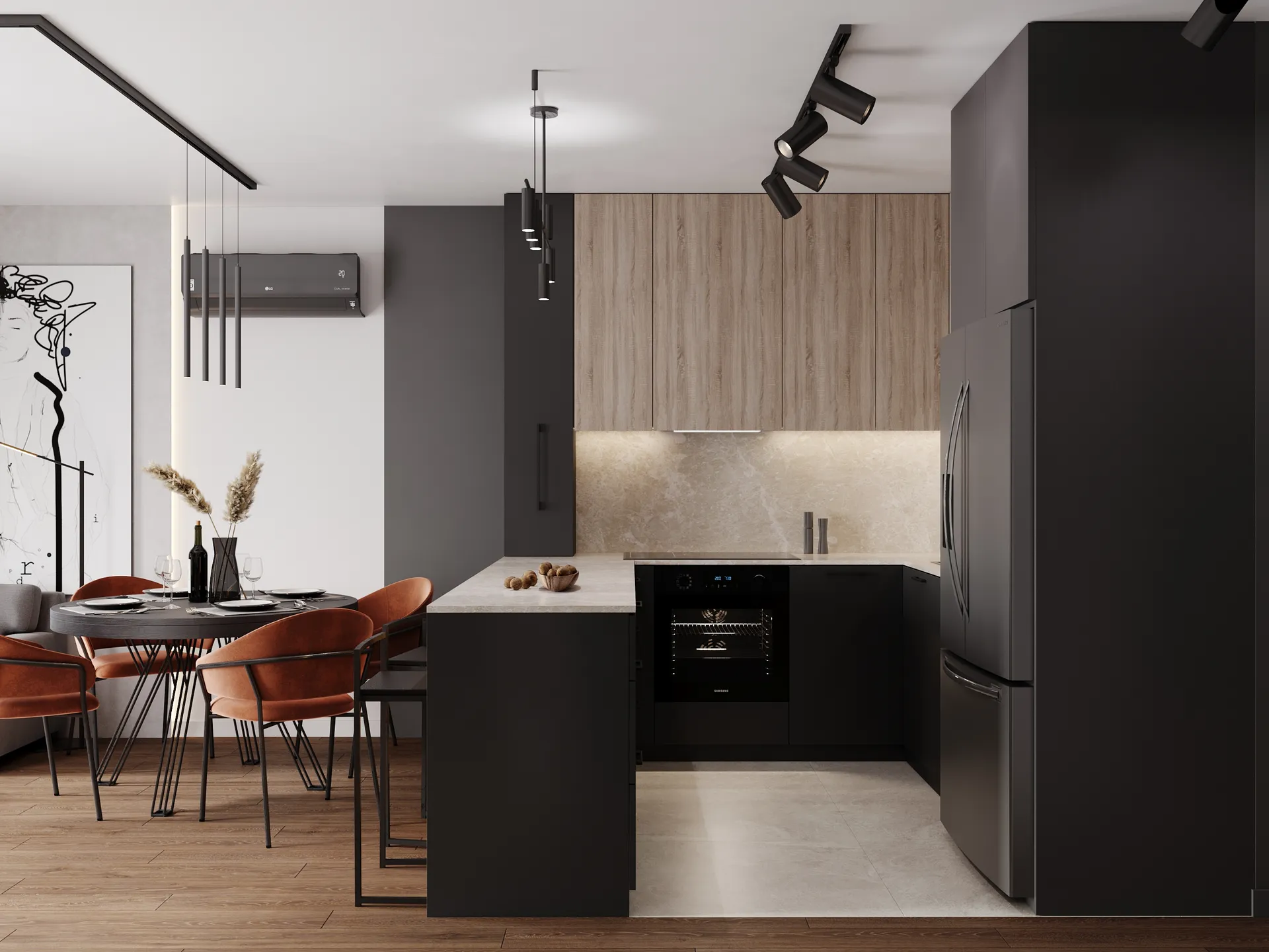 60-metrowe mieszkanie w stylu soft loftu, zaprojektowane dla pary, zlokalizowane pod Warszawą. We wnętrzu dominują ciemne dekory, cegła, beton i głęboka kolorystyka – od ciemnej podłogi po zabudowę meblową. Salon z aneksem mieści rozkładany stół, duży narożnik i funkcjonalną kuchnię z dodatkowymi miejscami do siedzenia. Całość uzupełniają sypialnia z garderobą, łazienka i domowe biuro, utrzymane w tej samej estetyce dla pełnej spójności projektu.