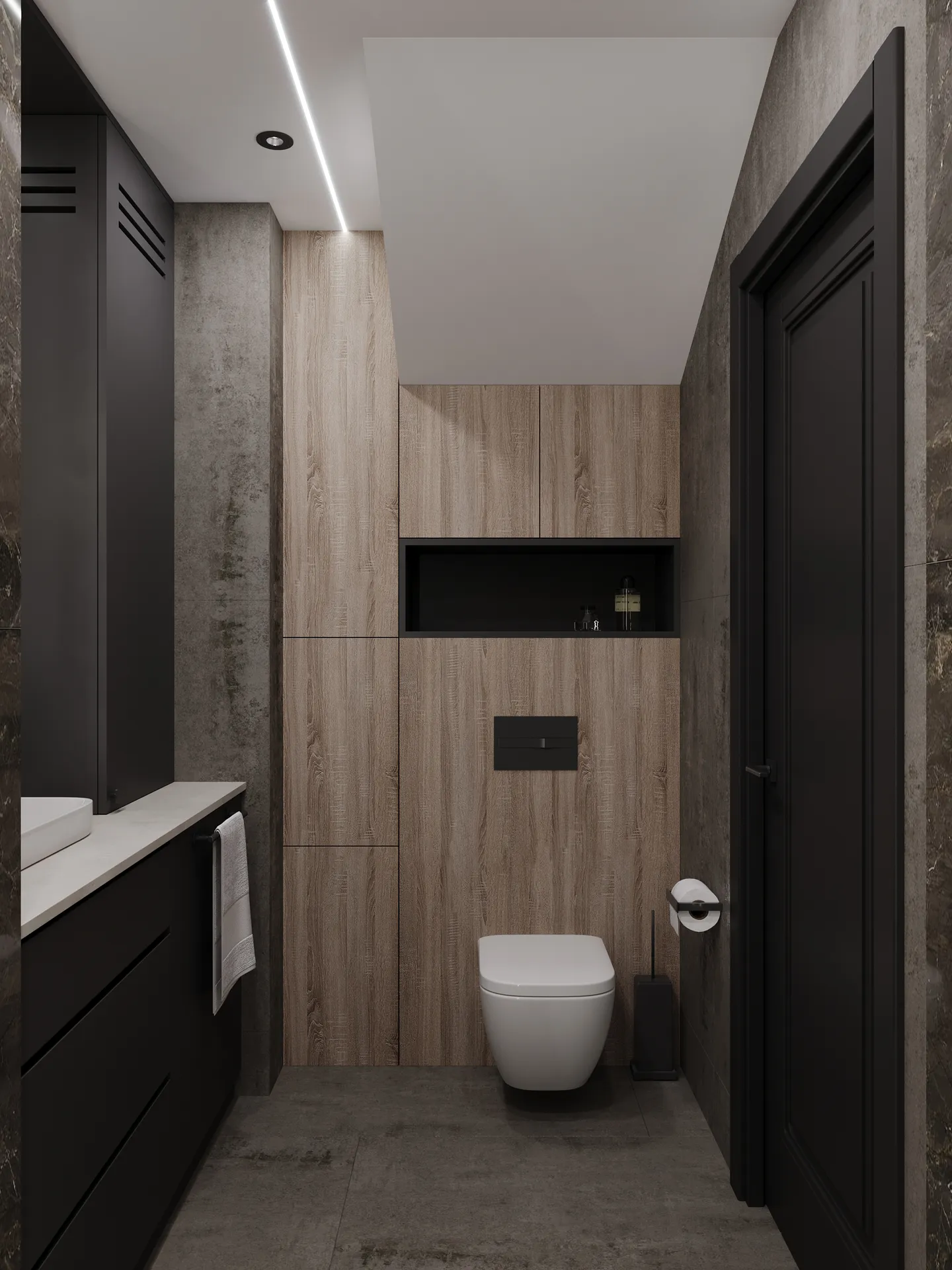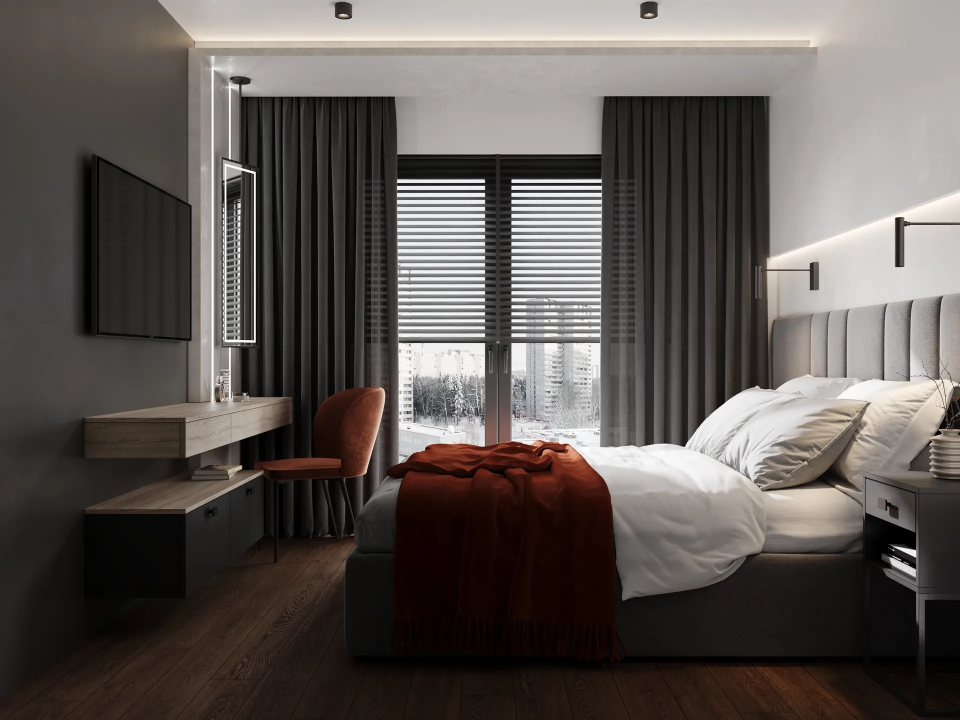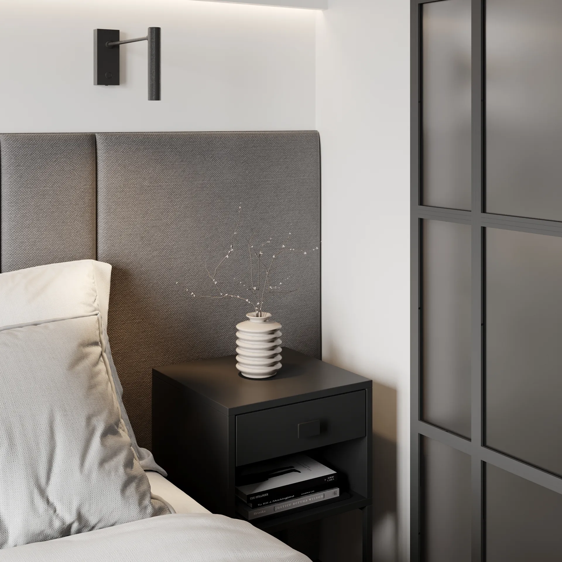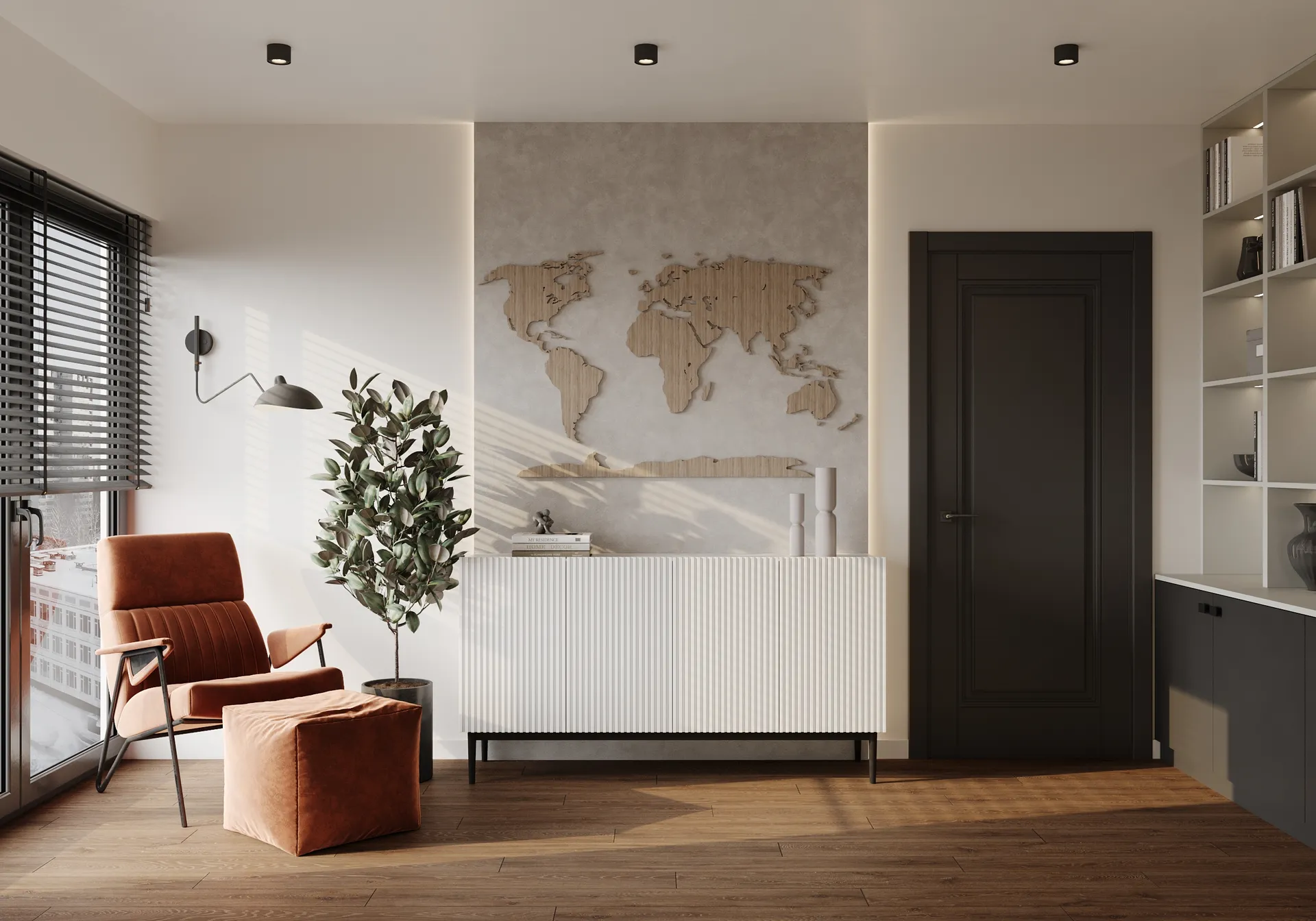 60-metrowe mieszkanie w stylu soft loftu, zaprojektowane dla pary, zlokalizowane pod Warszawą. We wnętrzu dominują ciemne dekory, cegła, beton i głęboka kolorystyka – od ciemnej podłogi po zabudowę meblową. Salon z aneksem mieści rozkładany stół, duży narożnik i funkcjonalną kuchnię z dodatkowymi miejscami do siedzenia. Całość uzupełniają sypialnia z garderobą, łazienka i domowe biuro, utrzymane w tej samej estetyce dla pełnej spójności projektu.
