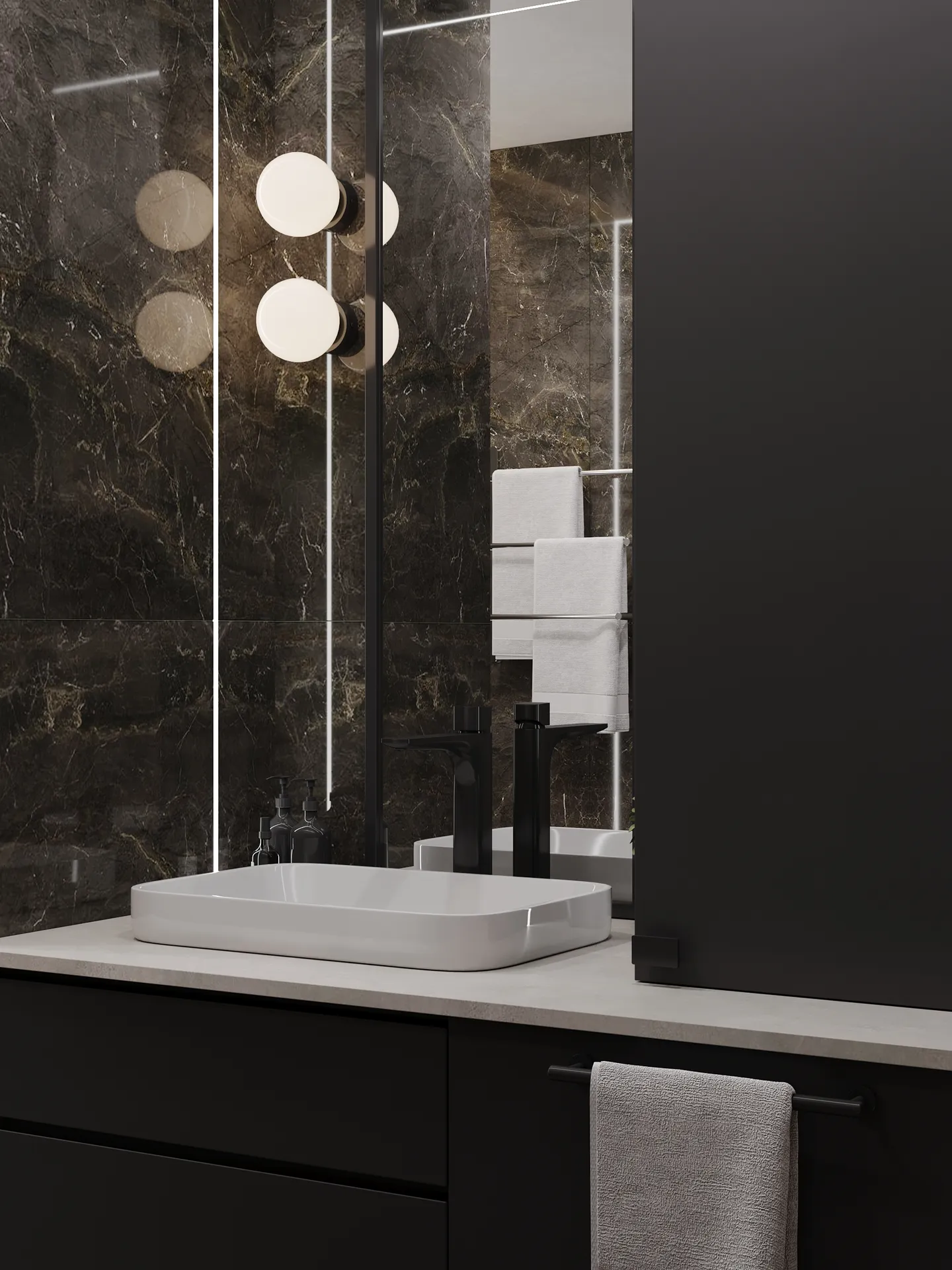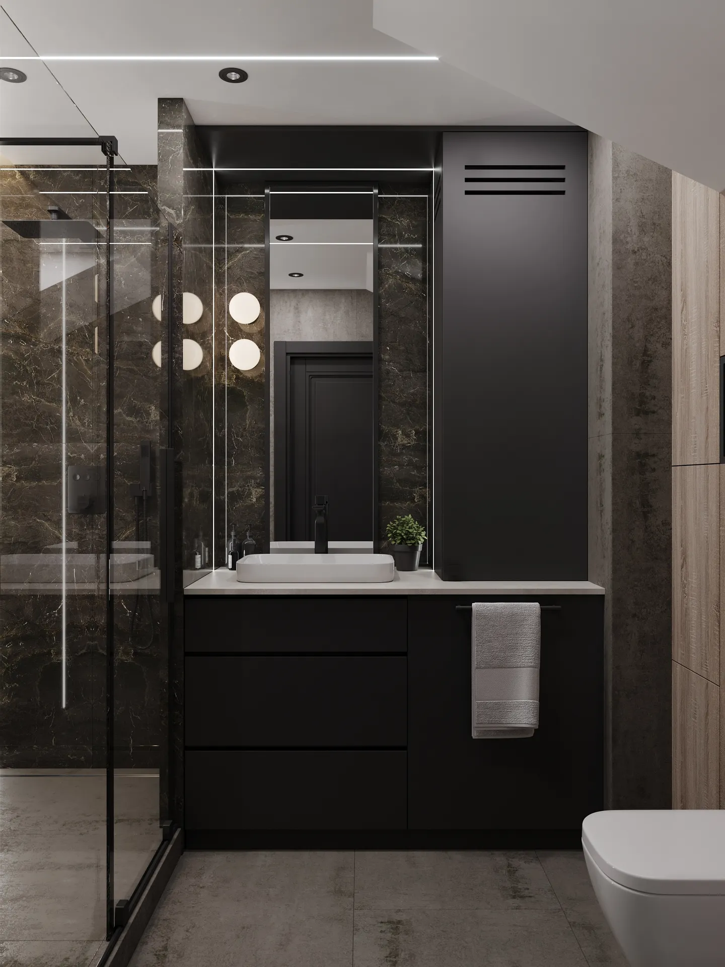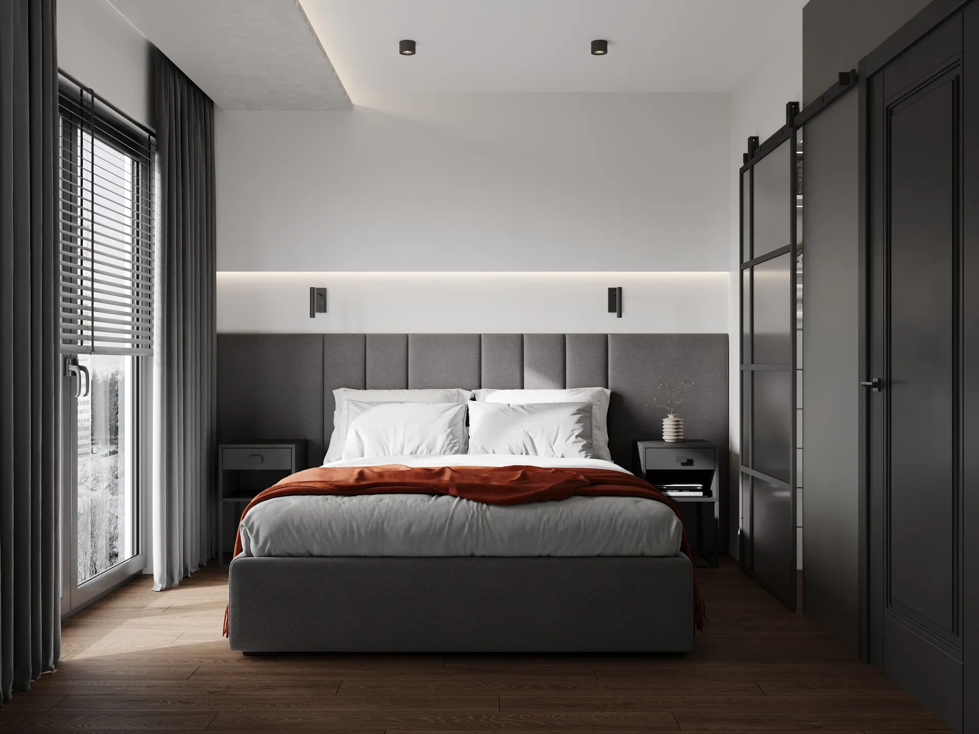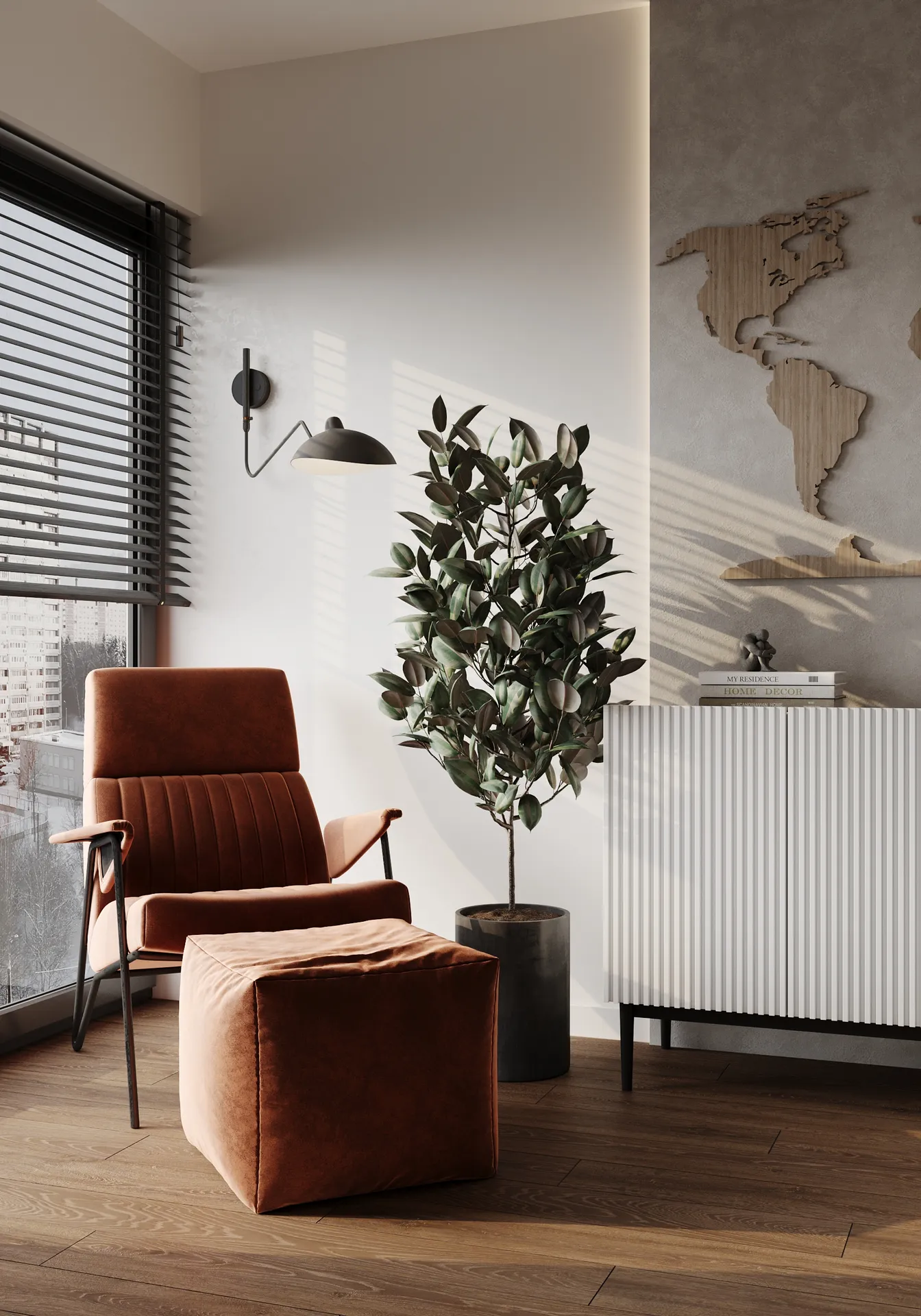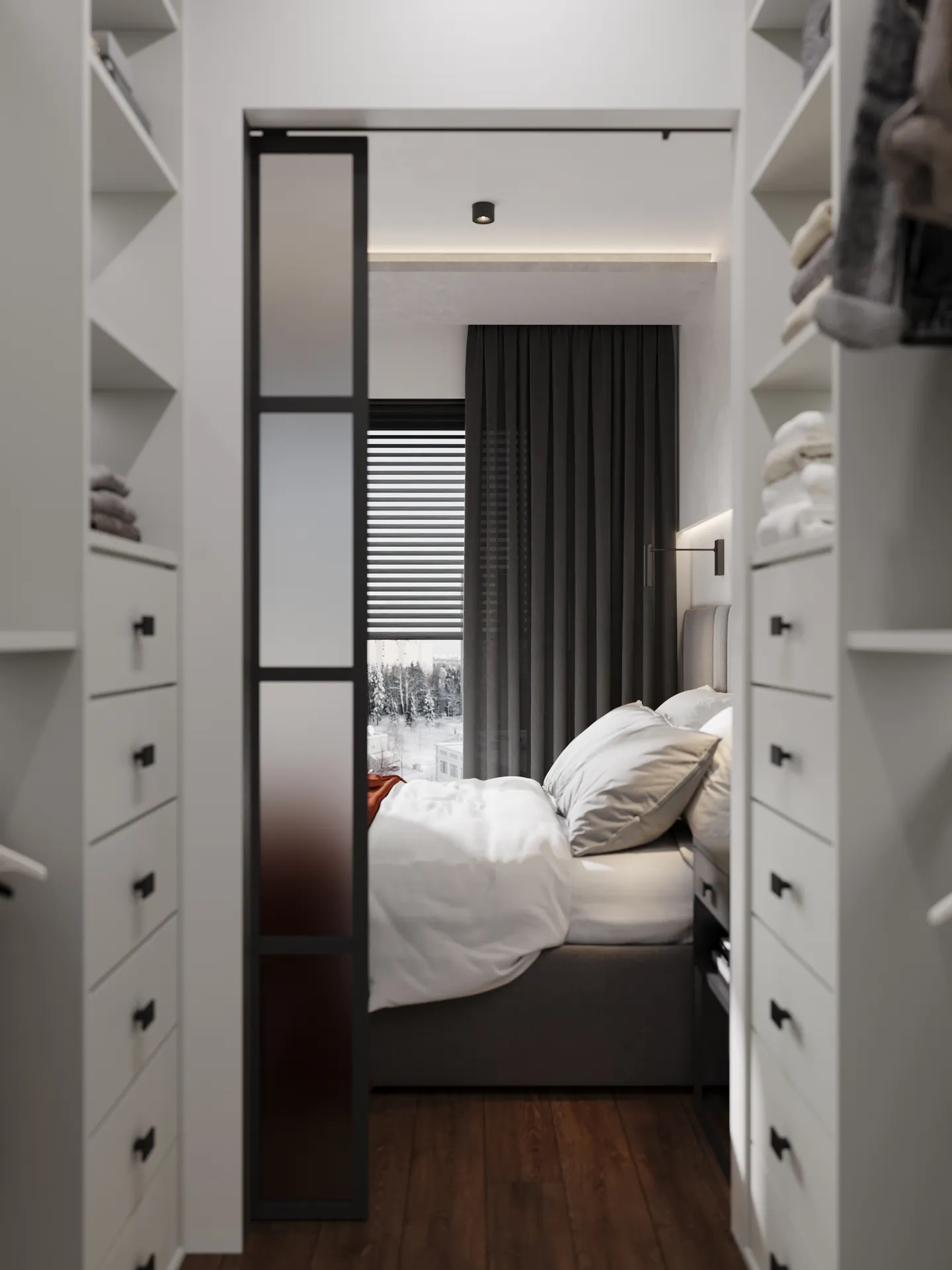 60-metrowe mieszkanie w stylu soft loftu, zaprojektowane dla pary, zlokalizowane pod Warszawą. We wnętrzu dominują ciemne dekory, cegła, beton i głęboka kolorystyka – od ciemnej podłogi po zabudowę meblową. Salon z aneksem mieści rozkładany stół, duży narożnik i funkcjonalną kuchnię z dodatkowymi miejscami do siedzenia. Całość uzupełniają sypialnia z garderobą, łazienka i domowe biuro, utrzymane w tej samej estetyce dla pełnej spójności projektu.