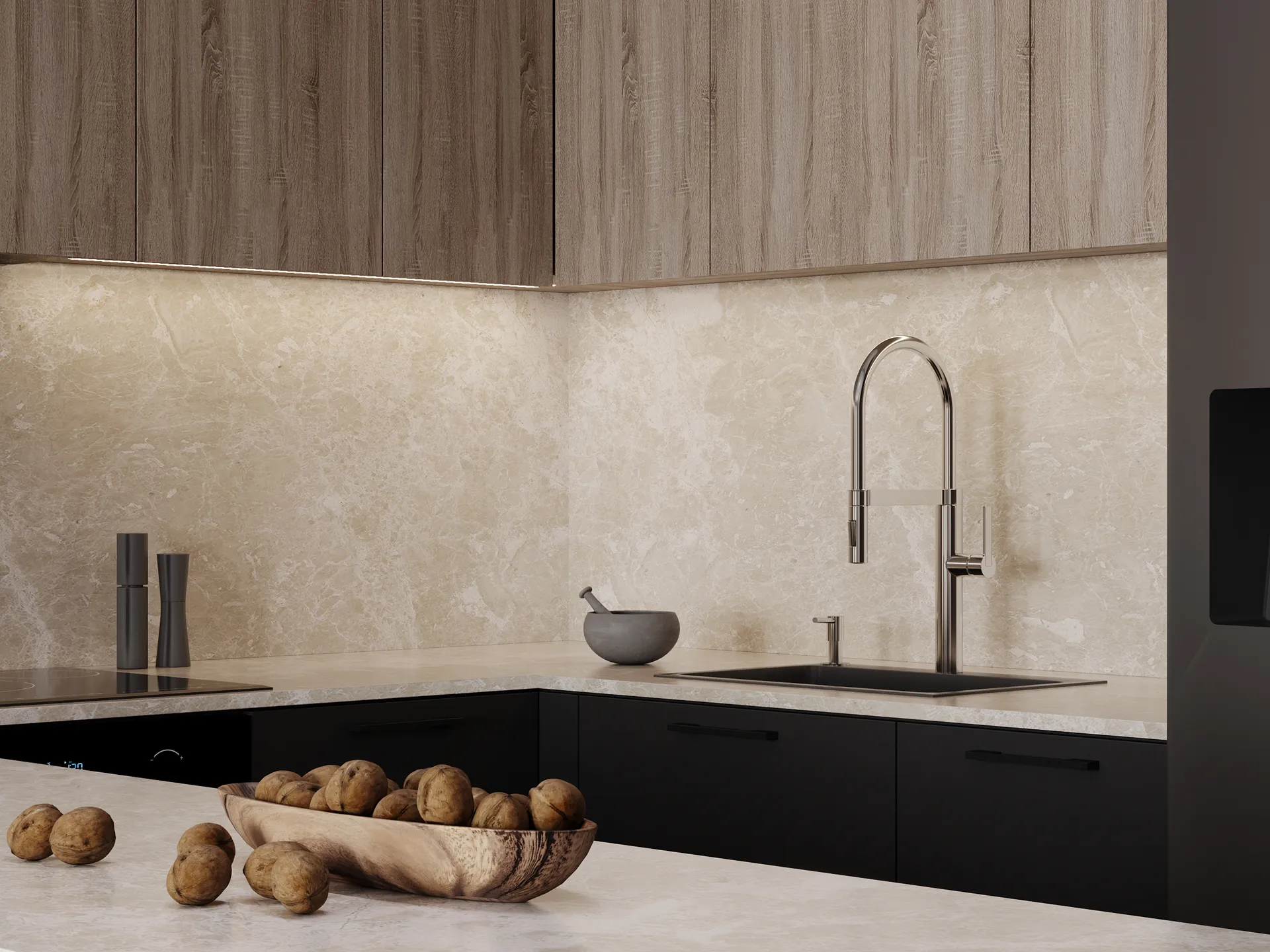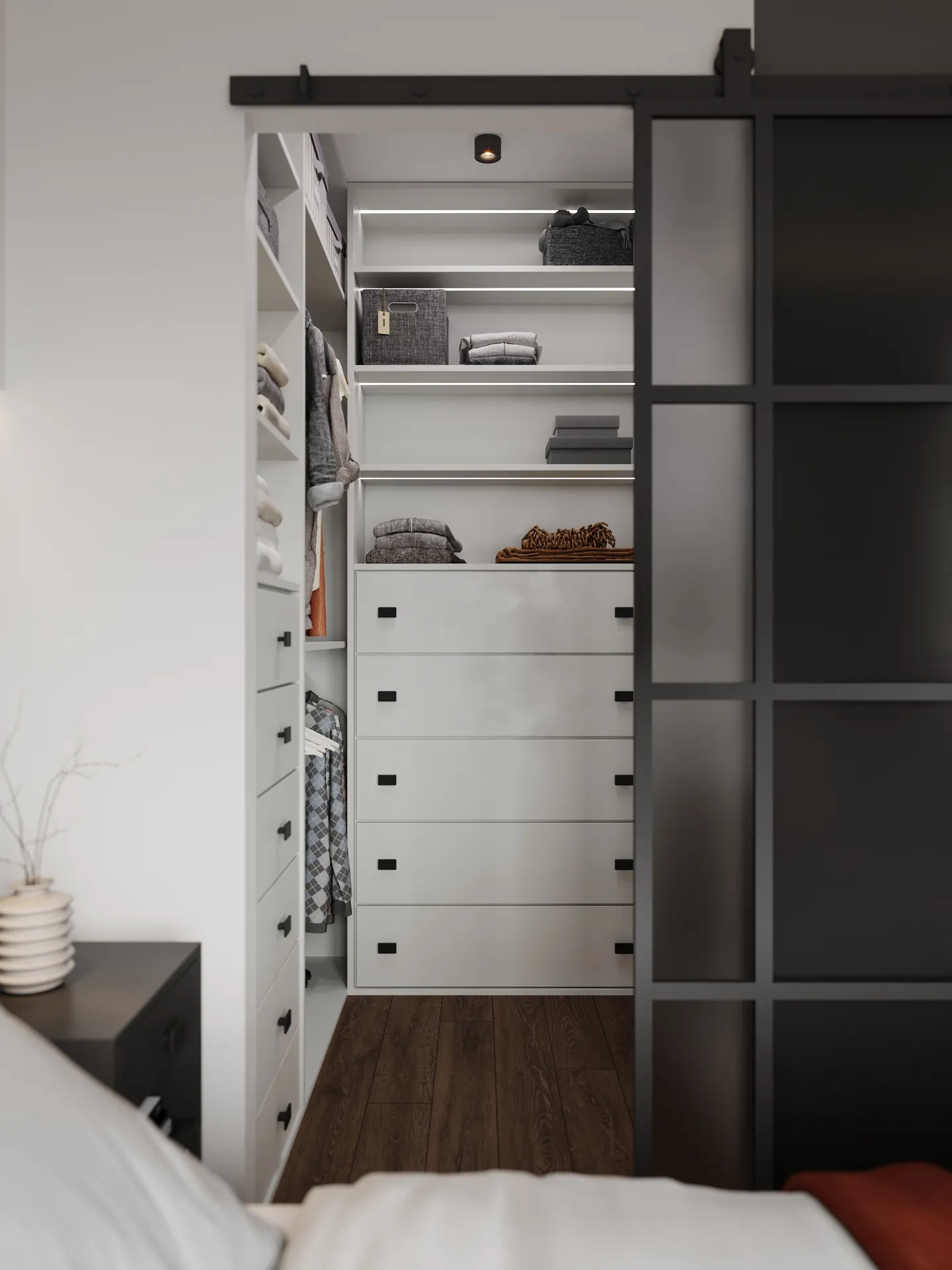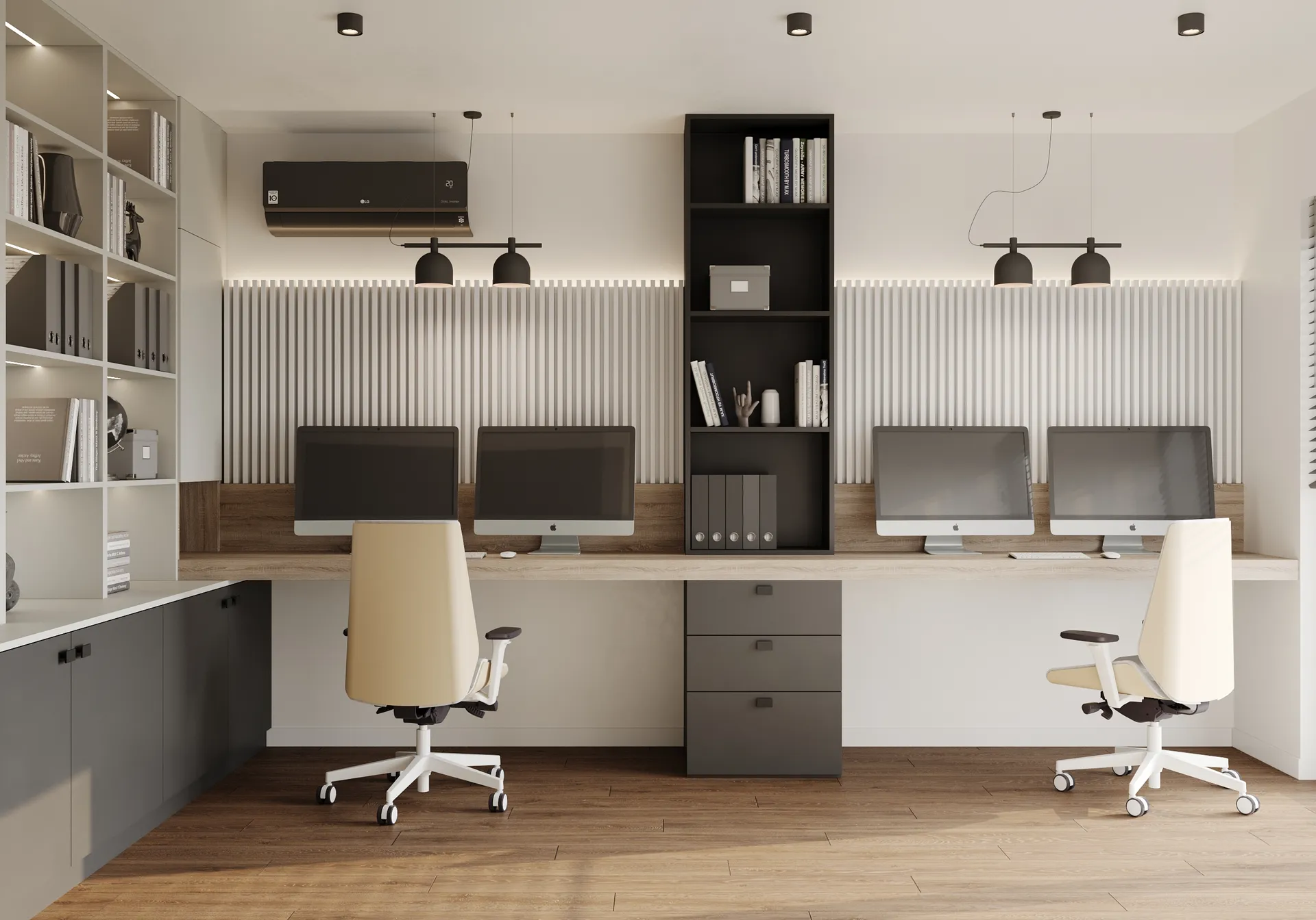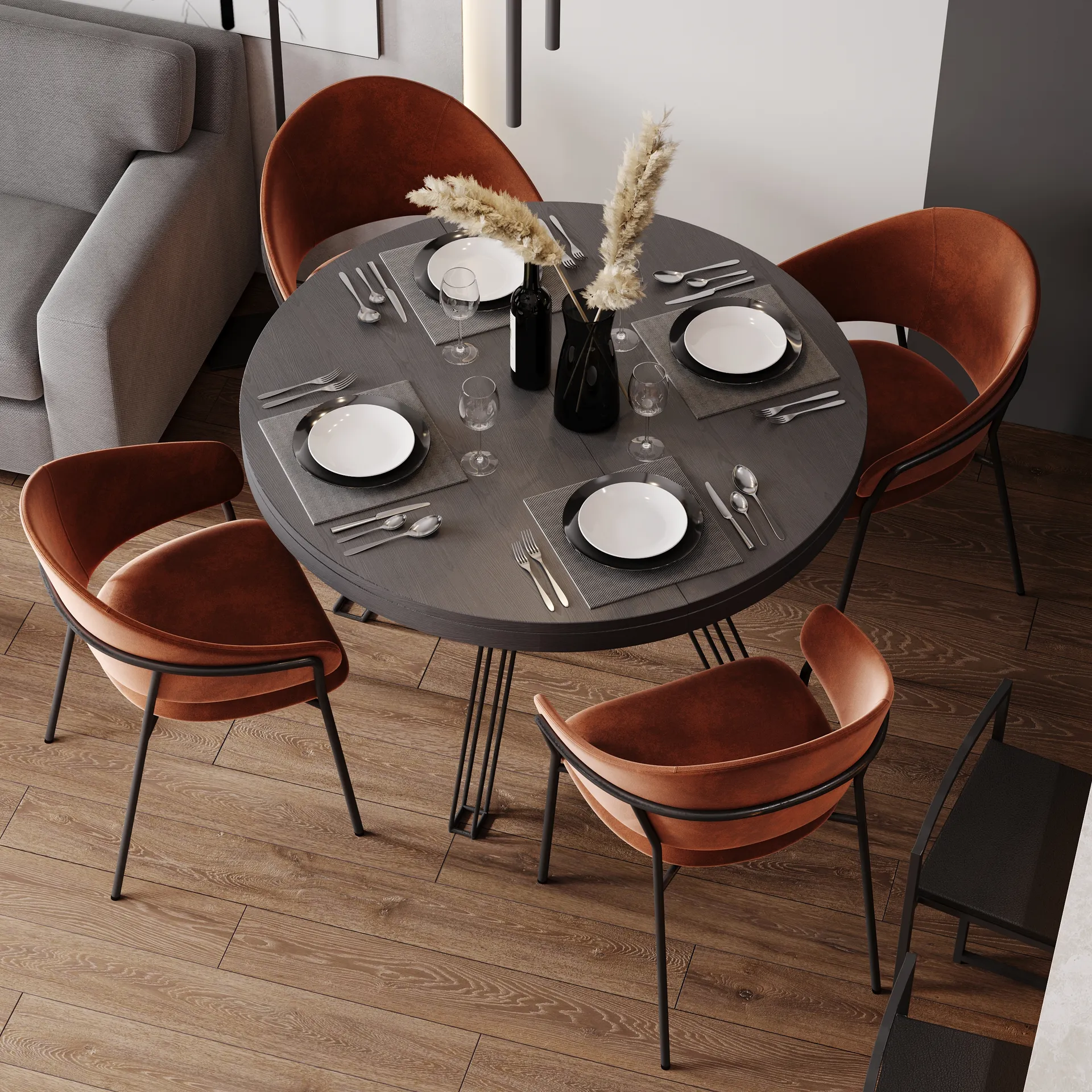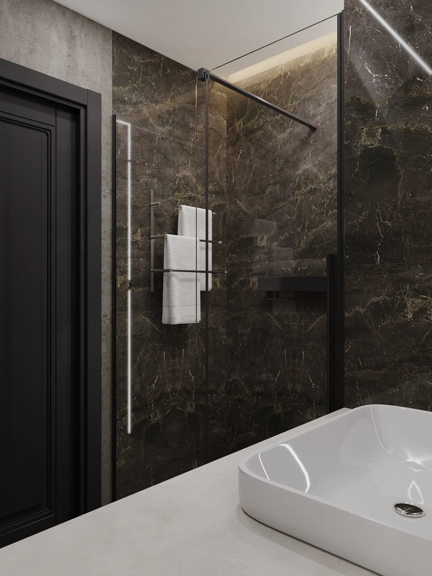 60-metrowe mieszkanie w stylu soft loftu, zaprojektowane dla pary, zlokalizowane pod Warszawą. We wnętrzu dominują ciemne dekory, cegła, beton i głęboka kolorystyka – od ciemnej podłogi po zabudowę meblową. Salon z aneksem mieści rozkładany stół, duży narożnik i funkcjonalną kuchnię z dodatkowymi miejscami do siedzenia. Całość uzupełniają sypialnia z garderobą, łazienka i domowe biuro, utrzymane w tej samej estetyce dla pełnej spójności projektu.